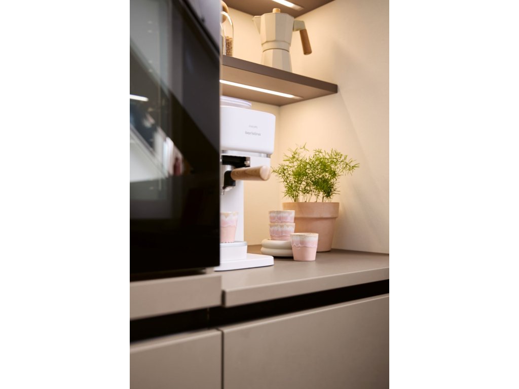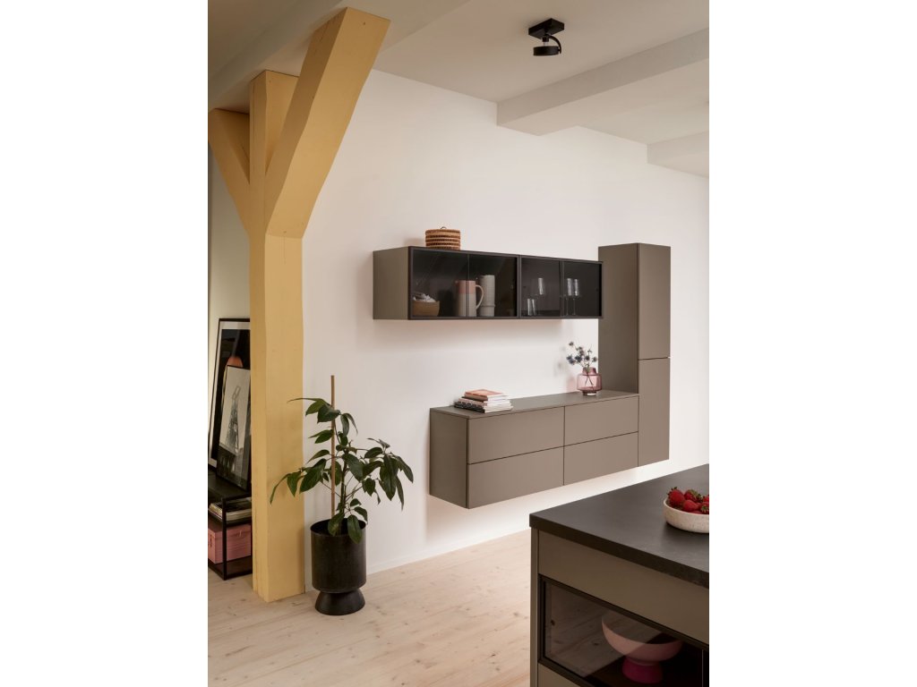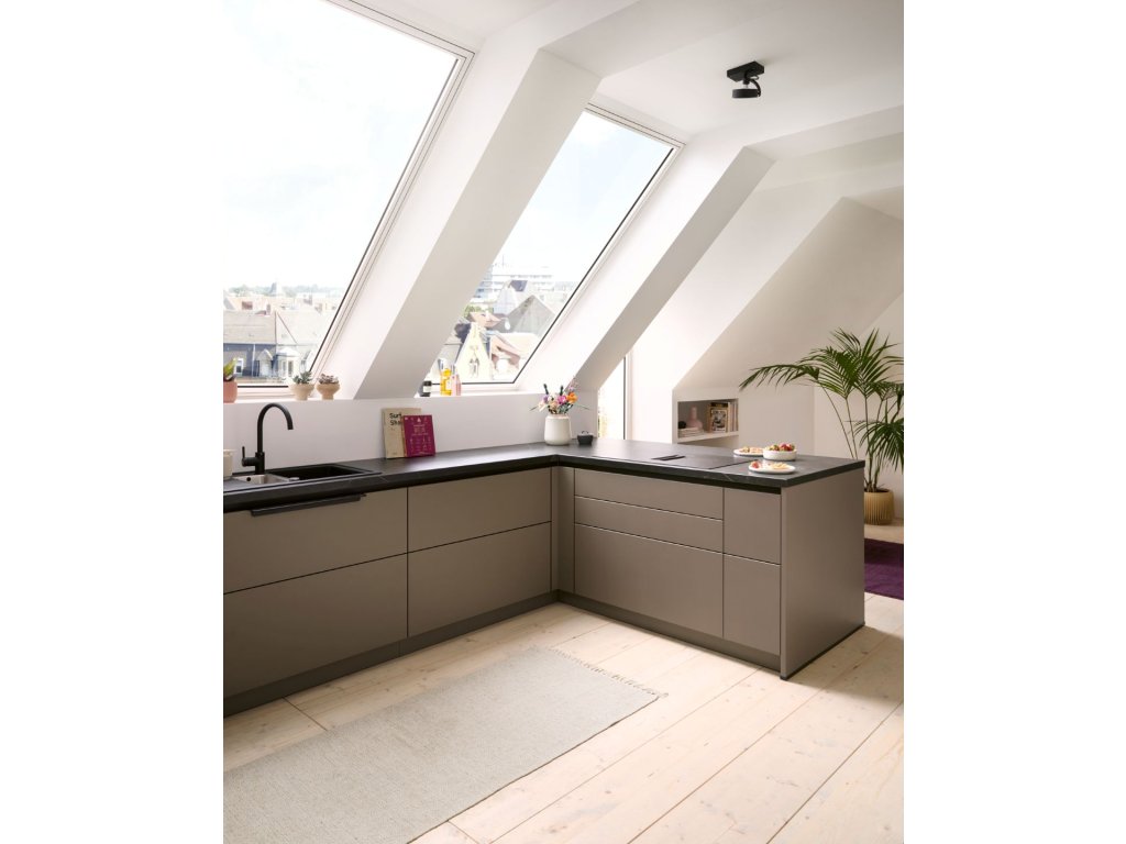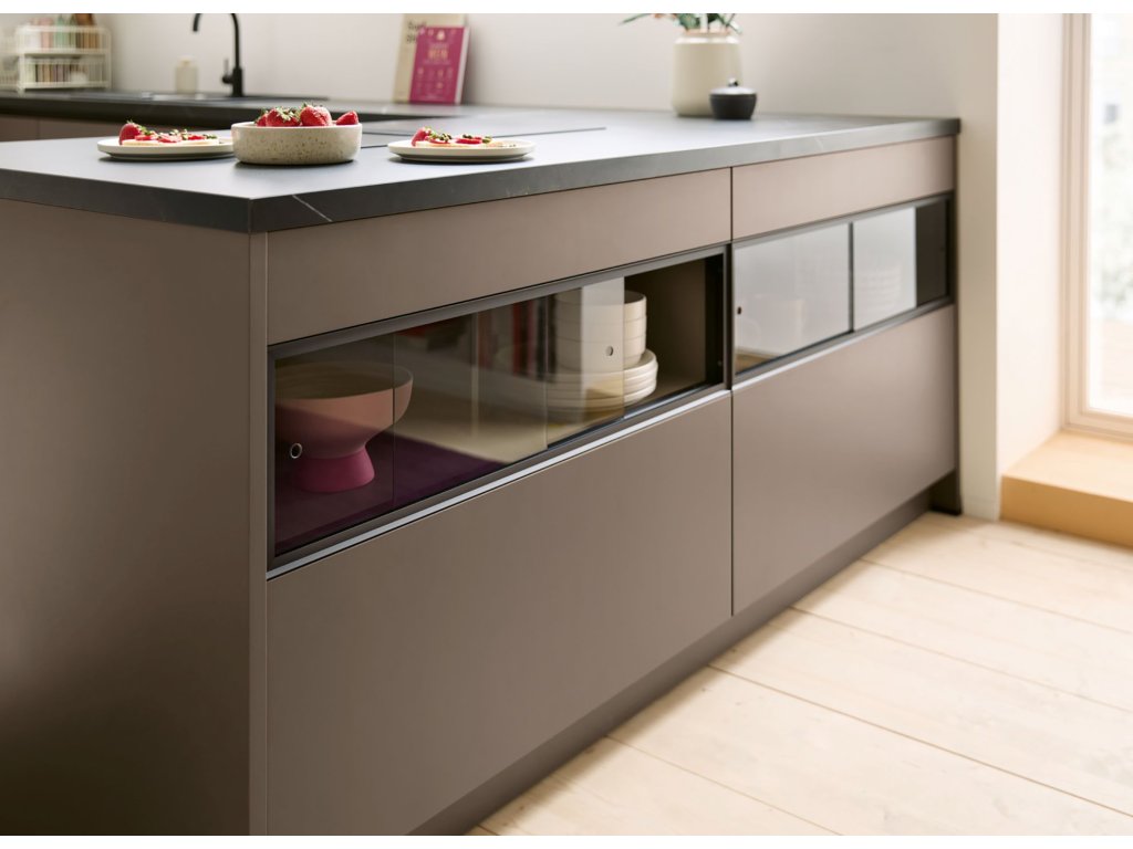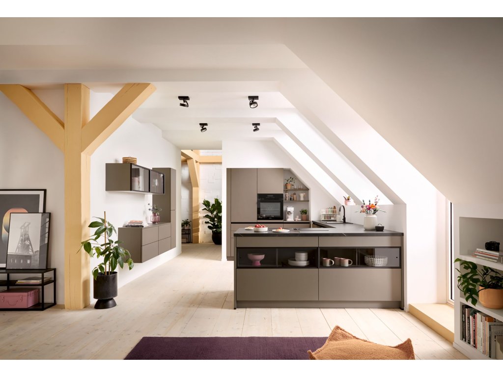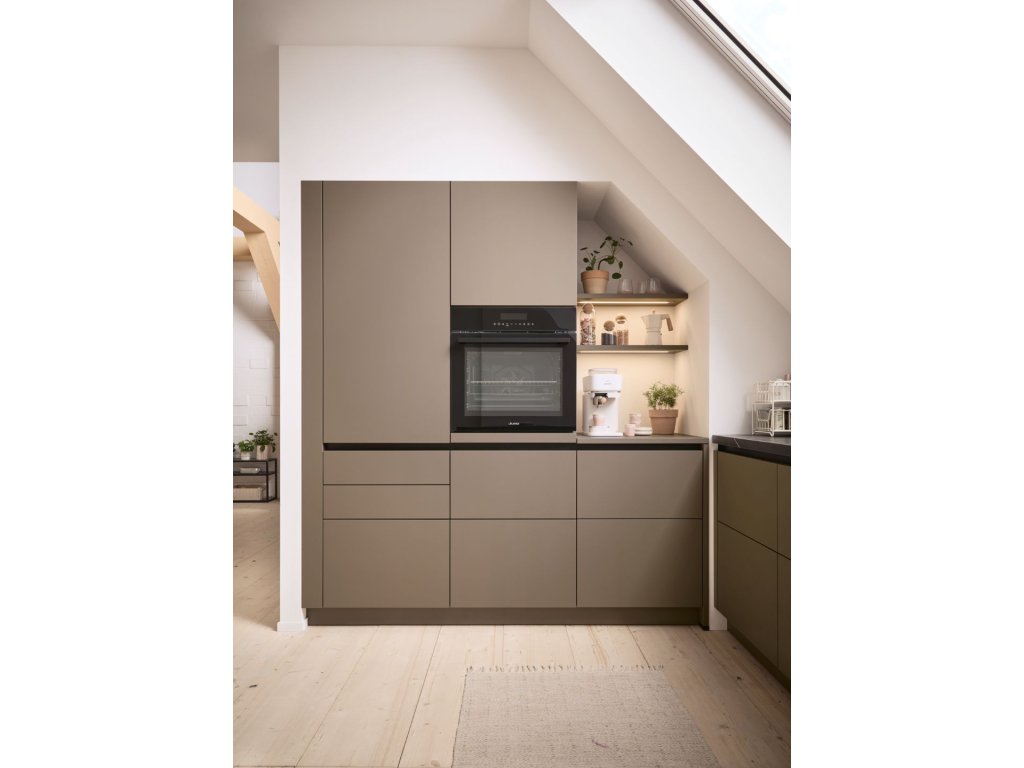 Barevná kuchyně Matera (MAC) AFP (dvířka UV lak matná) v odstínu sépiové hnědé je novinkou pro rok 2026. Realizace kuchyně do podkroví se sešikmeným stropem je ukázkou využití konceptu SingleX, kombinace úchytkové prohlubně a TIP-ON otevírání dvířek pro dosažení jednoduchých a čistých linií v kuchyni. Novinkou jsou i posuvné prosklené dvířka, které vyniknout jak na horních skříňkách