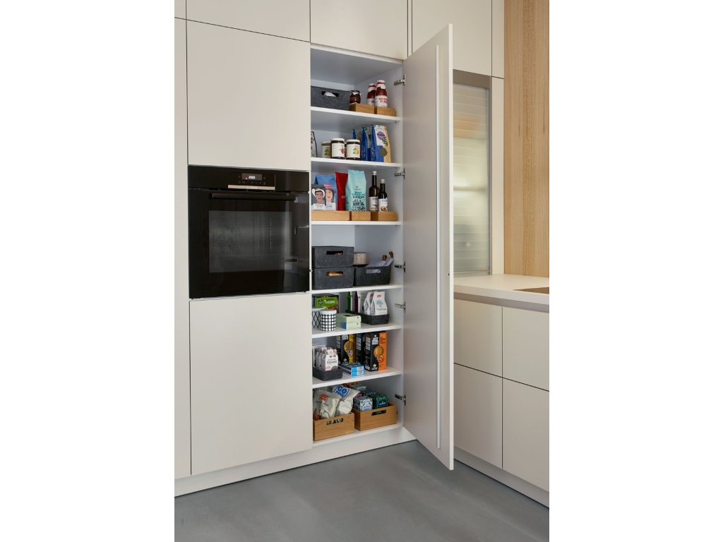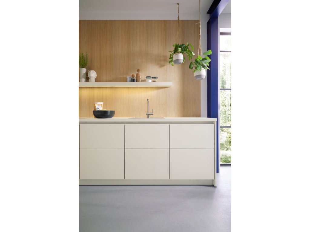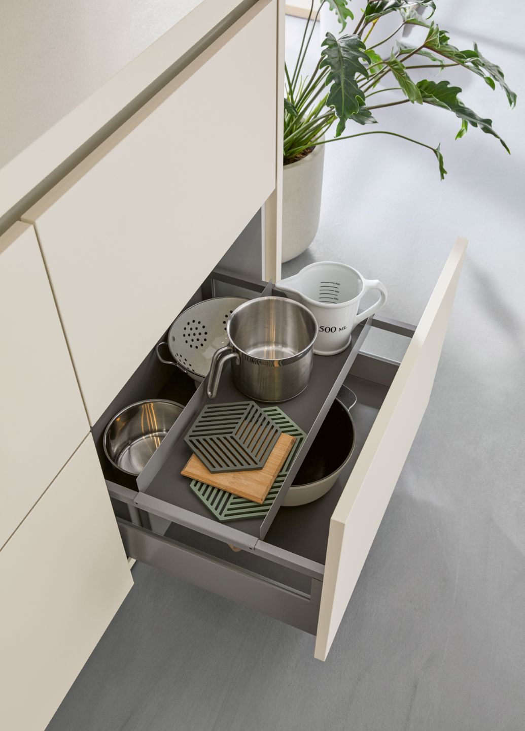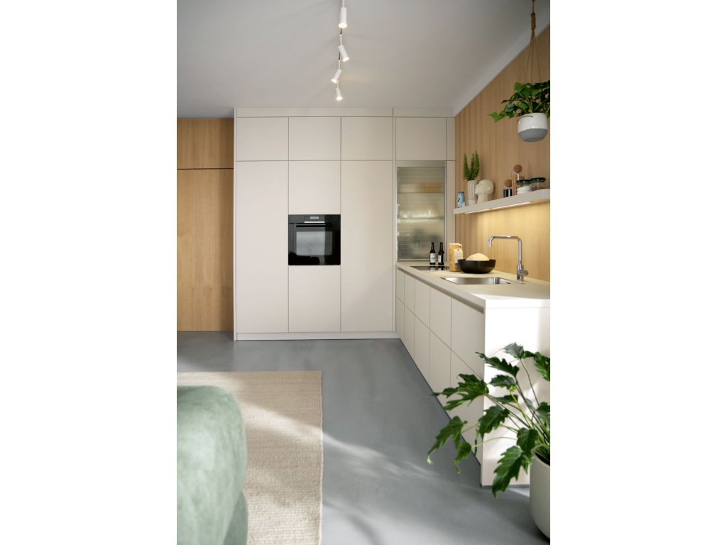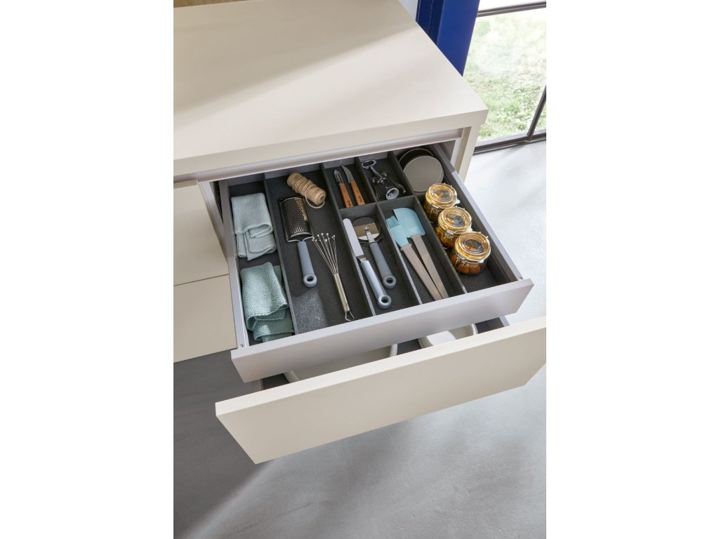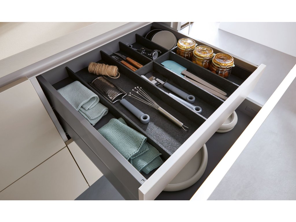 jednotný a harmonický vzhled. To je zdůrazněno i novým systémem úchytek Single X. Jedna úchytková prohlubeň umístěná těsně pod pracovní deskou, další kuchyňská dvířka otevíravá pomocí TIP-ON nebo C-DRIVE. Design celistvých dvířek u vysokých skříní od podlahy až ke stropu (bez rozdělení) vytváří jednolitou plochu, dokonale decentní a vizuálně přitažlivou.