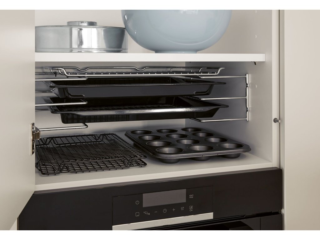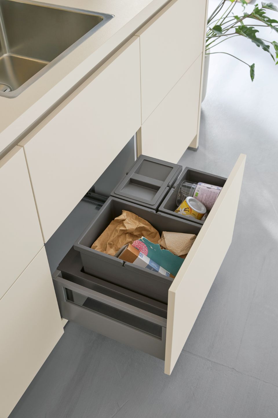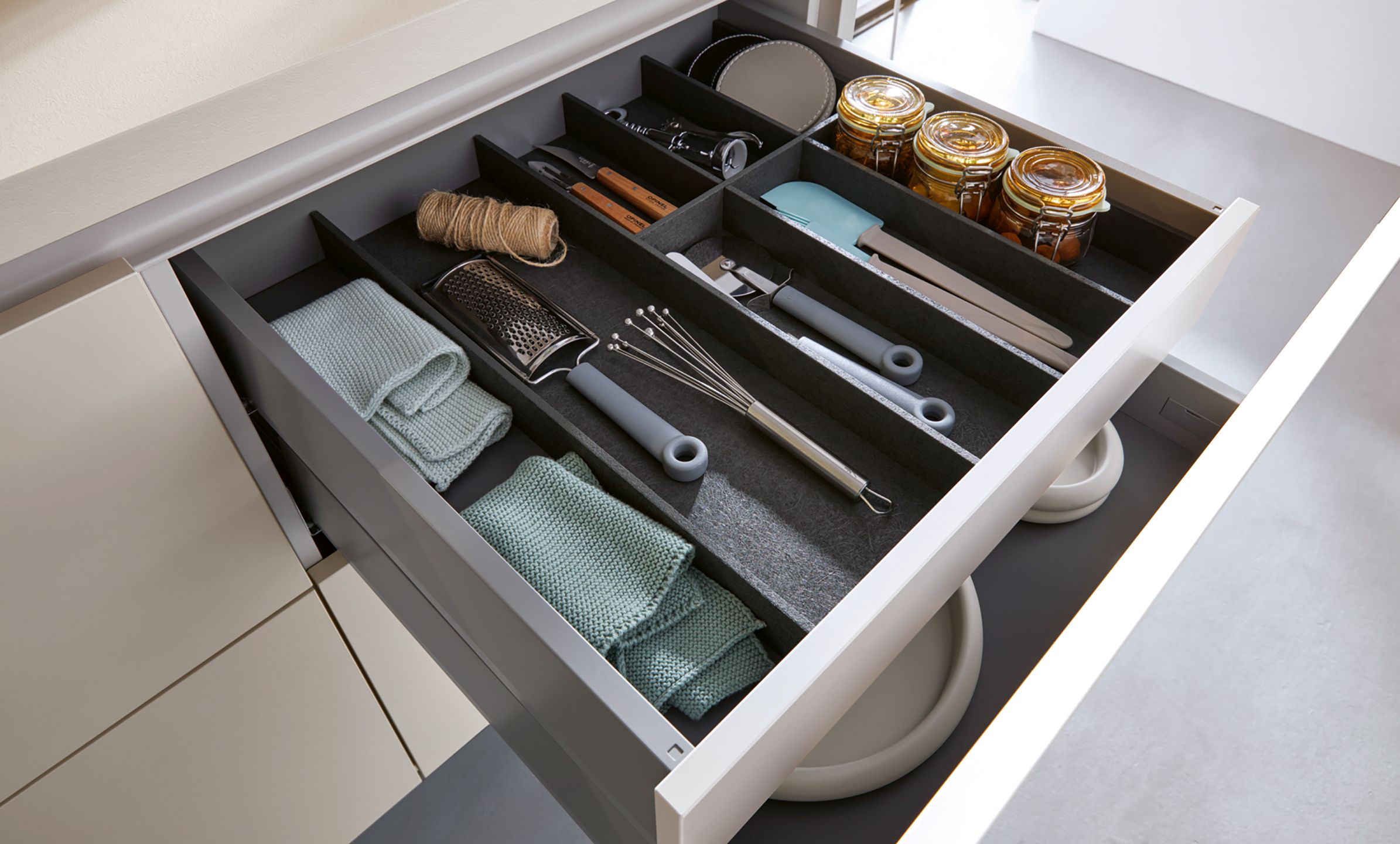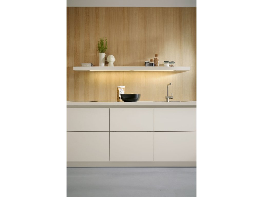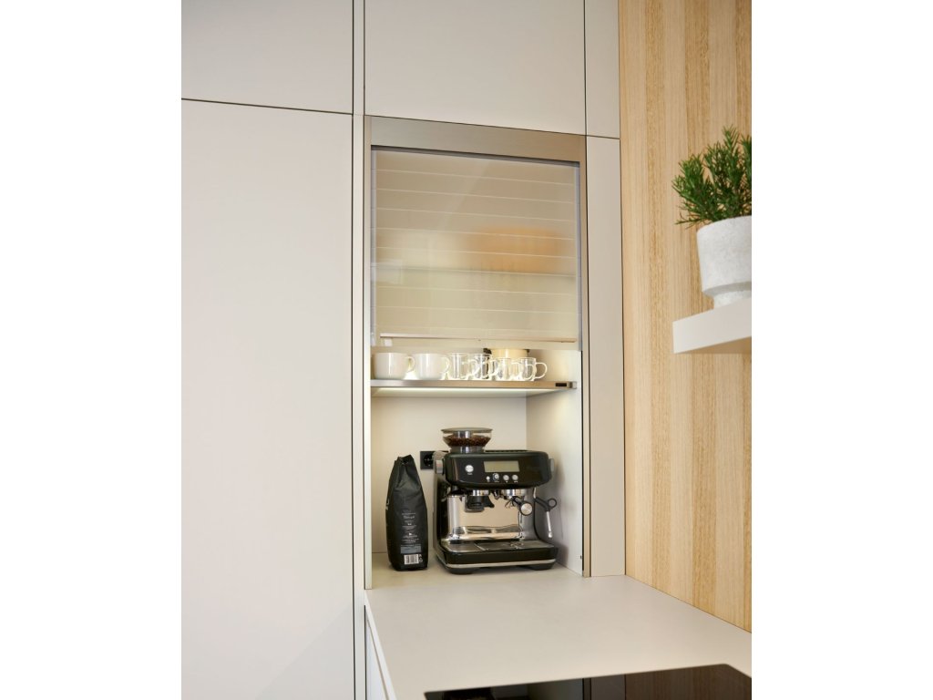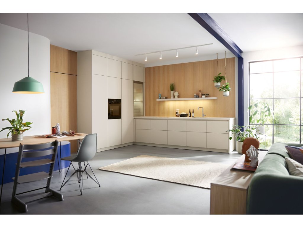 jednotný a harmonický vzhled. To je zdůrazněno i novým systémem úchytek Single X. Jedna úchytková prohlubeň umístěná těsně pod pracovní deskou, další kuchyňská dvířka otevíravá pomocí TIP-ON nebo C-DRIVE. Design celistvých dvířek u vysokých skříní od podlahy až ke stropu (bez rozdělení) vytváří jednolitou plochu, dokonale decentní a vizuálně přitažlivou.