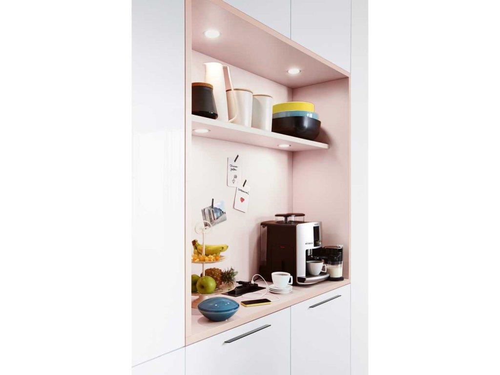 Kuchyně v provedení lesklého lakovaného laminátu Uni Gloss v odstínu křišťálové bílé ve vysokém lesku doplněná o pár prvků v lakovaném provedení (otevřený policový systém).