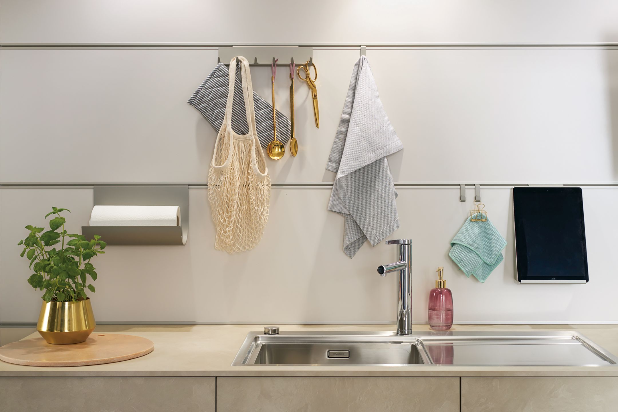 Kuchyně Elba K020 v provedení imitace pískové břidlice. Dekor světlé břidlice je teplejšího odstínu, nicméně pořád navozuje pocit čistého, industriálního stylu. Čistý styl kuchyně je podpořen mechanickým TIP-ON otevíráním- bezúchytkovým otevíráním dvířek i zásuvek v kombinaci s kovovými úchytkami na sestavě vysokých skříněk.