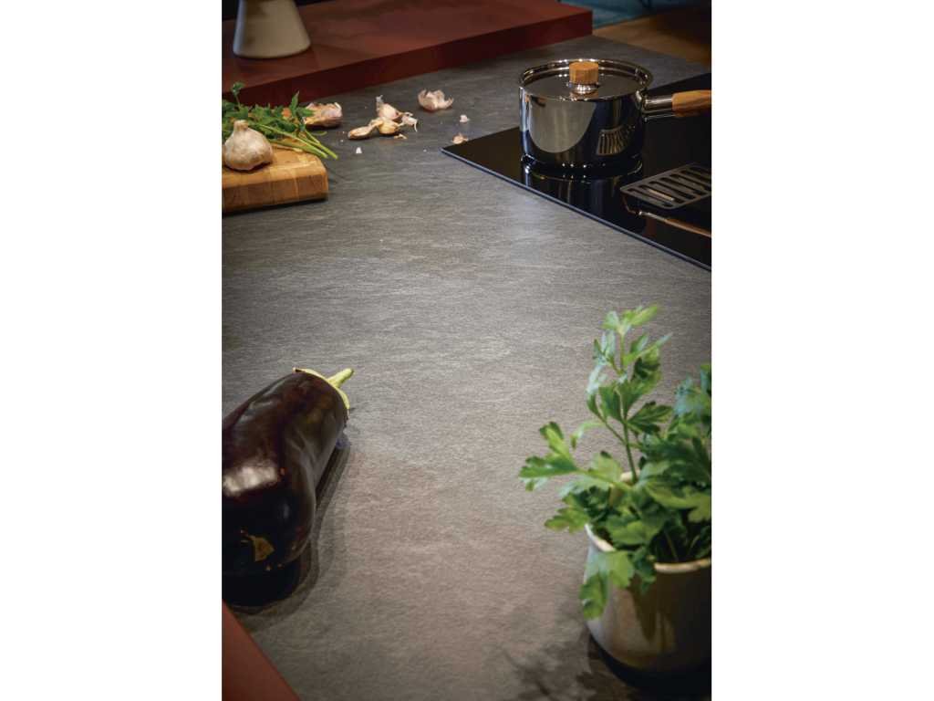 Kombinace kuchyně Elba v odstínu K028, v imitaci tmavého betonu v odstínu antracit, s tenkou pracovní deskou tl.16mm v dekoru K042 Alvaro břidlice přináší vysokou úroveň technicistního stylu do prostoru kuchyně.