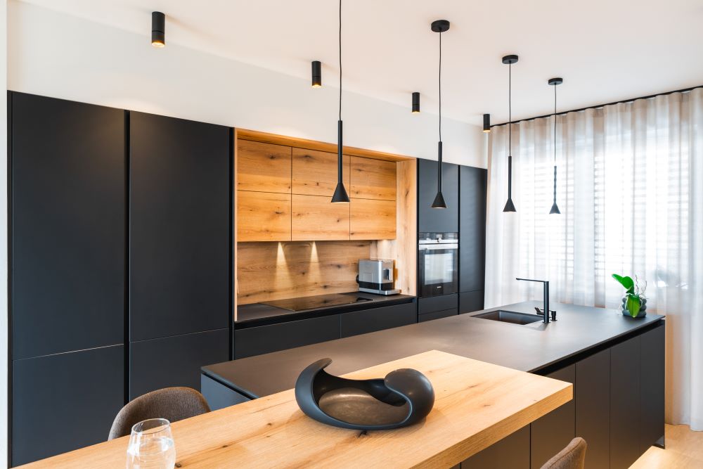 Kuchyně v saténovém provedení v odstínech černé lávy.