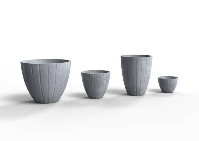 Kolekce betonových květináčů řady Decor je zdobená jednoduchým a jemným vzorem v podobě prolisu ve tvaru linky, která se rozšiřuje směrem ke dnu nádoby.