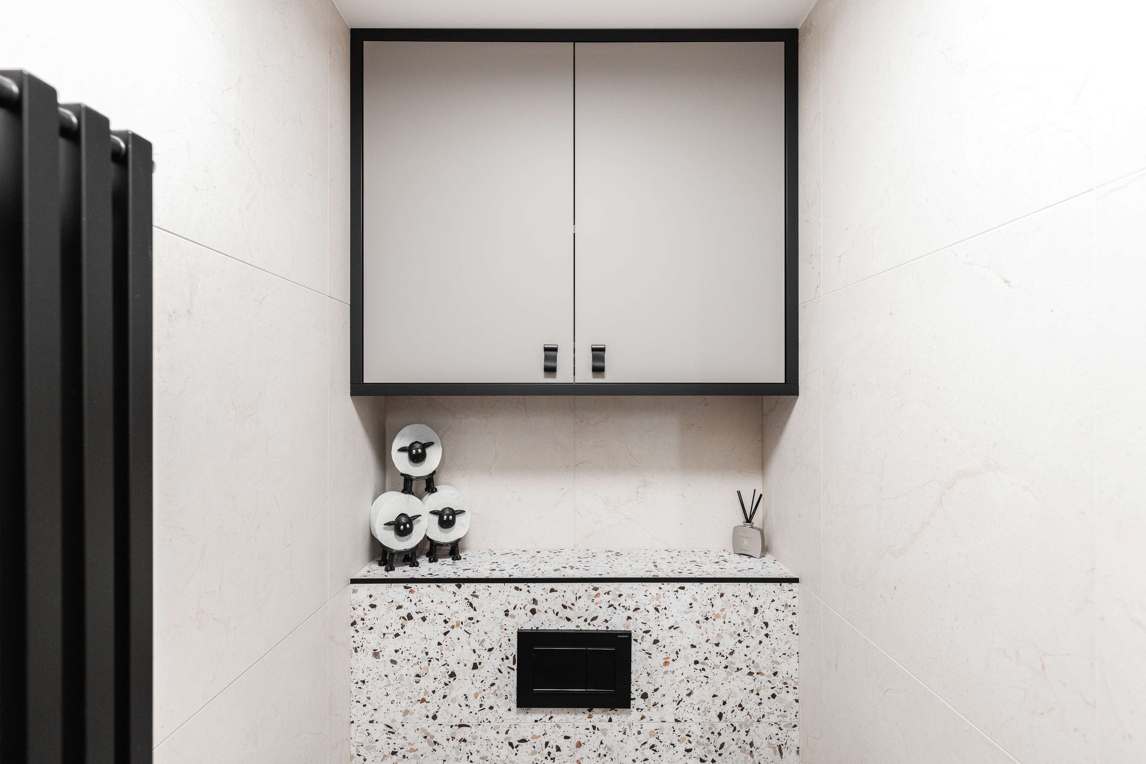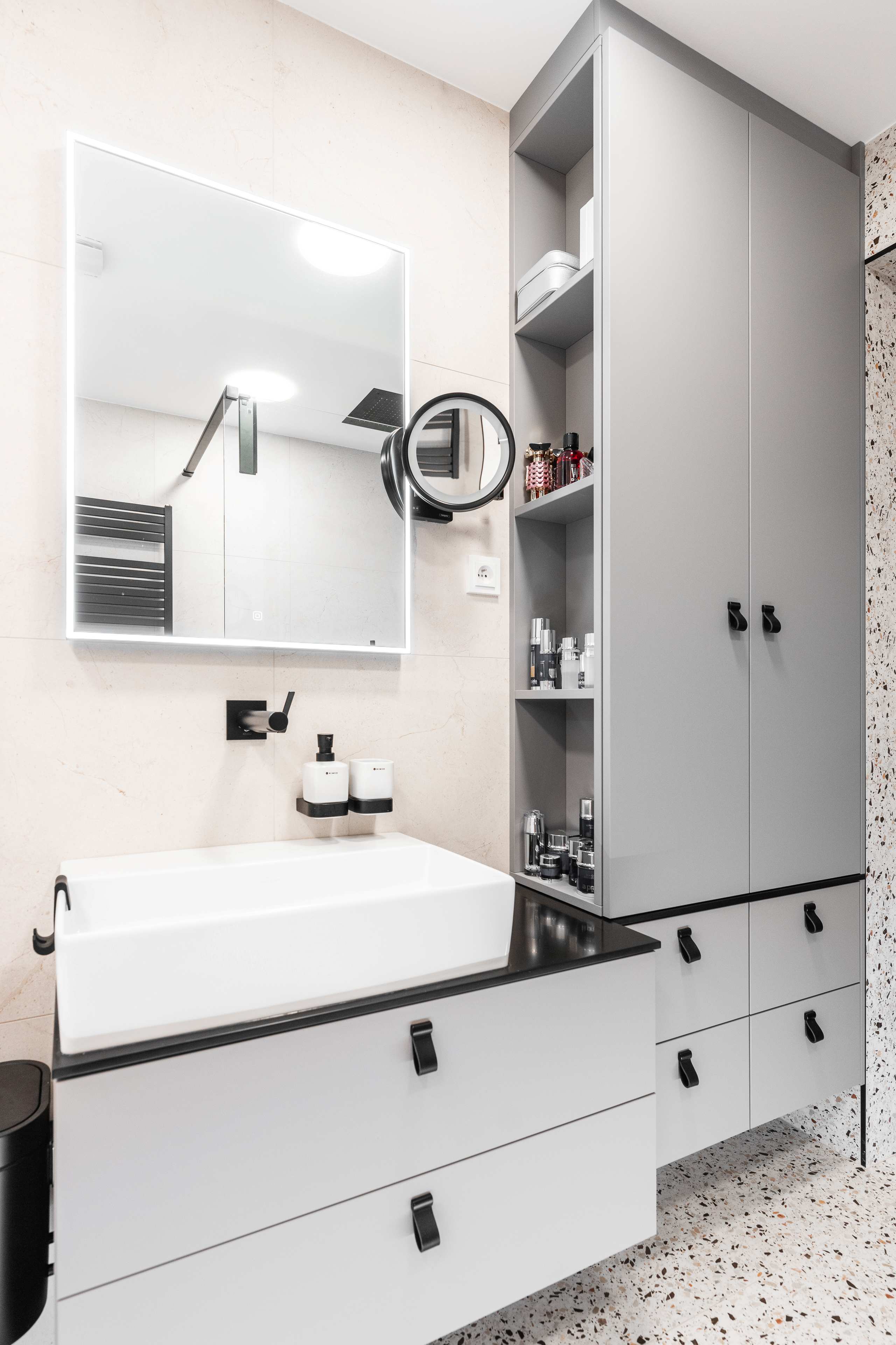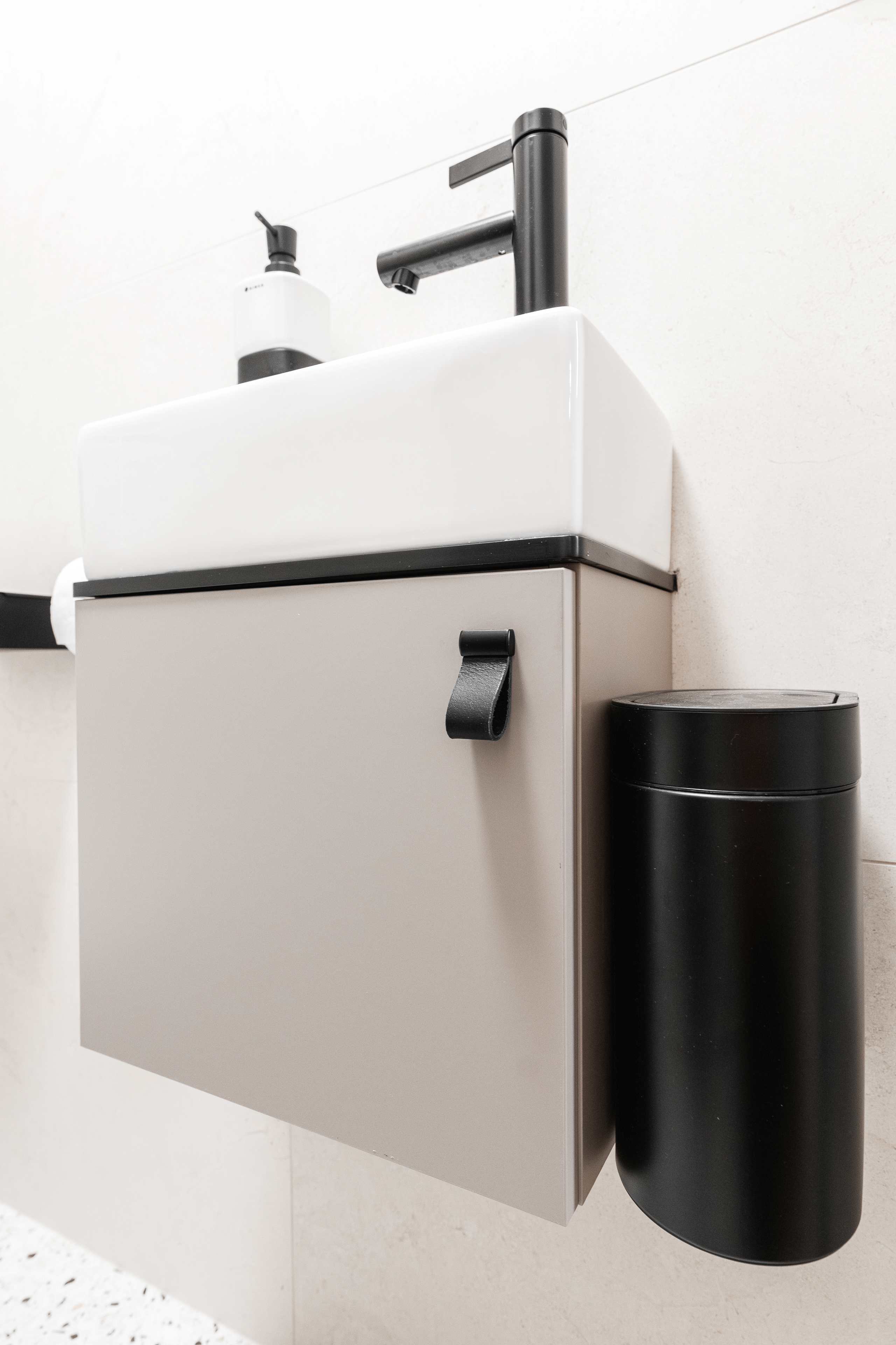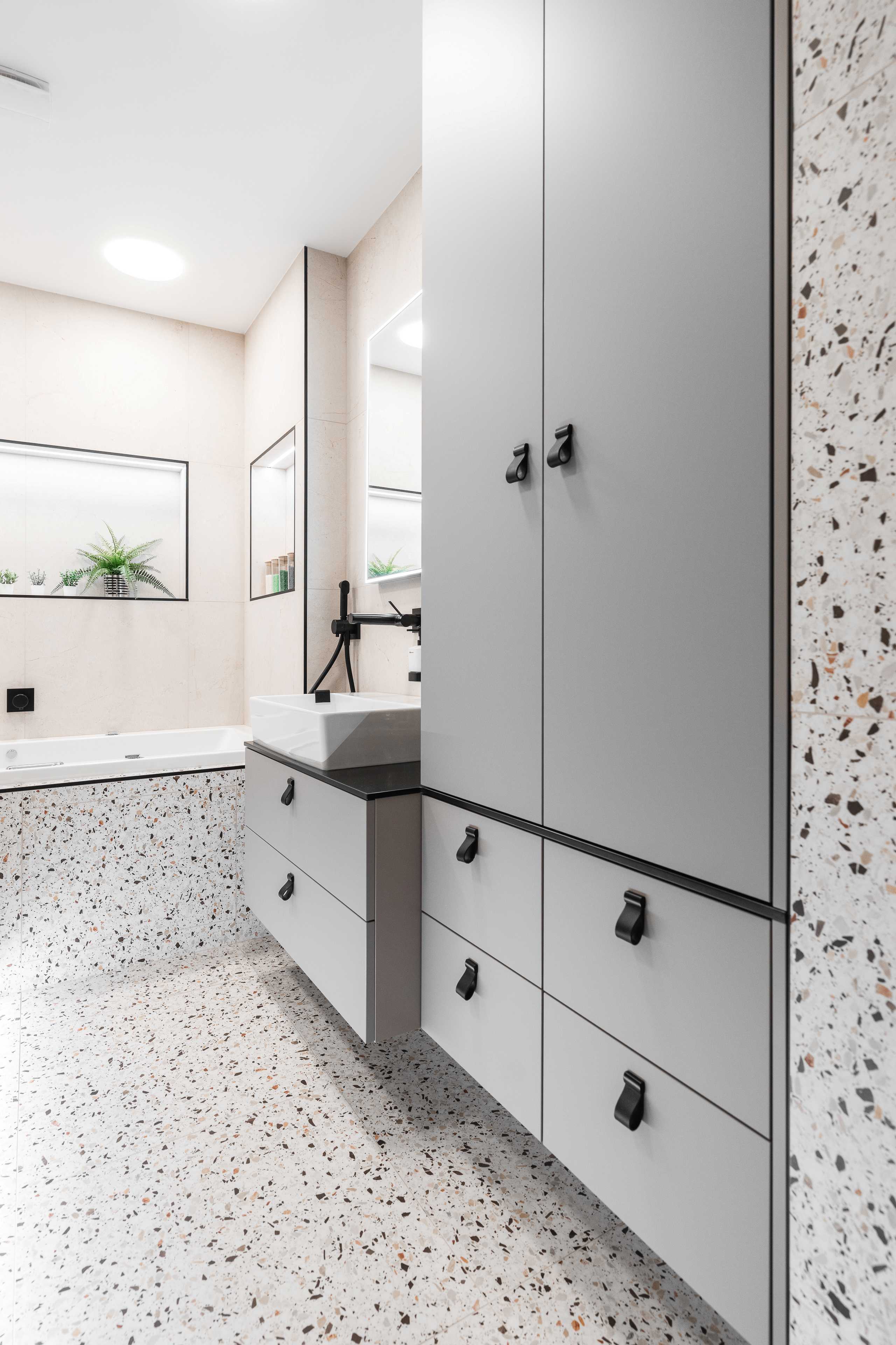 Veškeré přední a pohledové plochy jsou laděné do odstínu kašmírová, v provedení AFP (AntiFinger Print - protiotisková matná lakovaná úprava), v koupelně a na WC jsou skříňky otevíravé pomocí černých kožených knopků od Schüller.