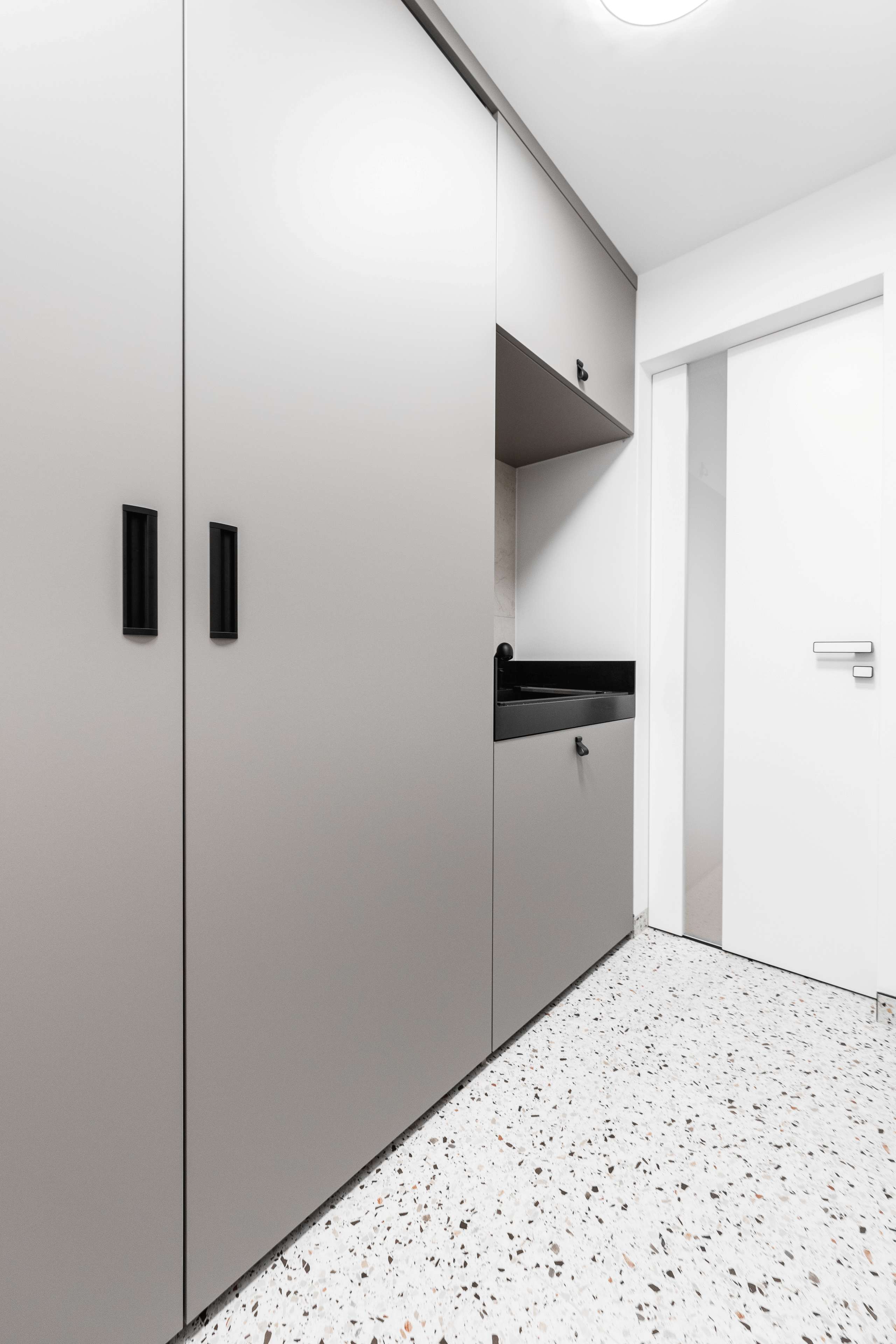 na míru řešený pojezd pro skříň do technické místnosti, hloubky šuplíkových skříněk v koupelně a samozřejmě horní odkládací plochy z kompozitního materiálu na všech spodních skříňkách.