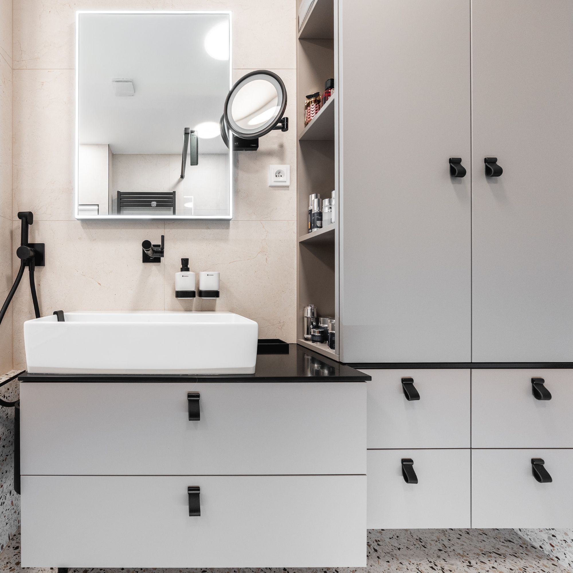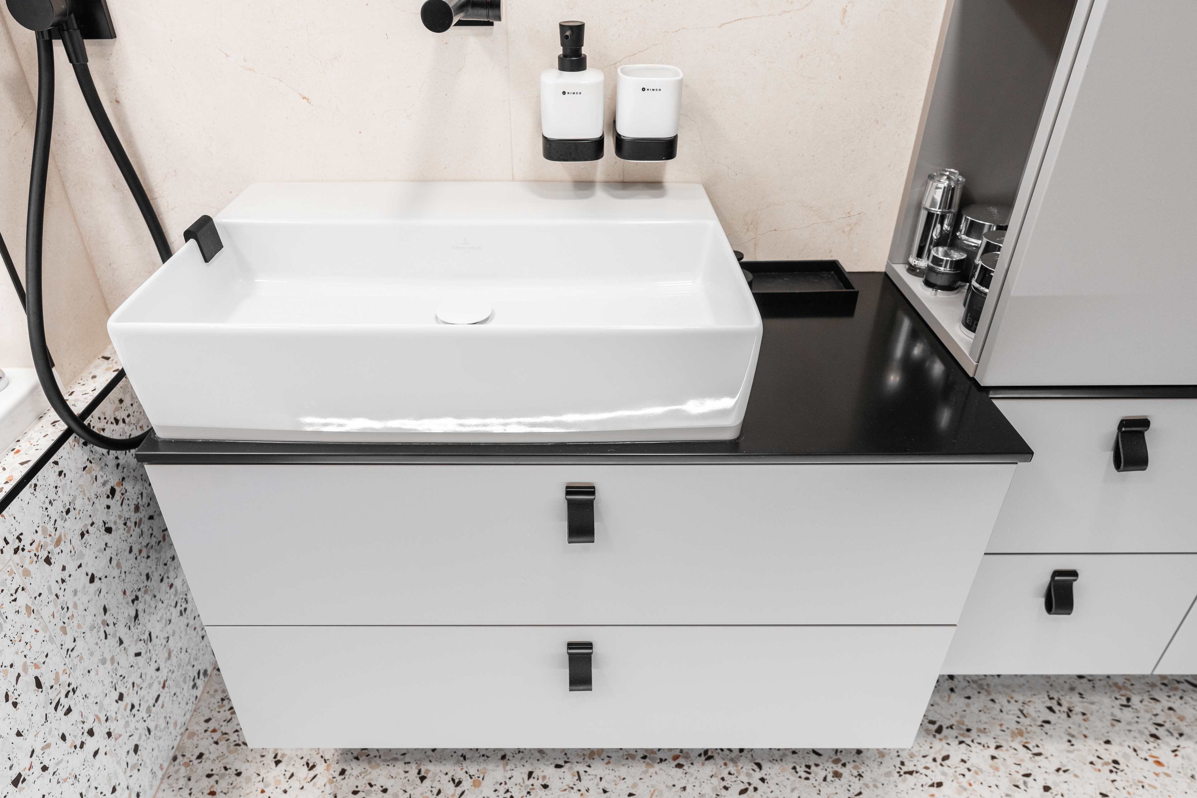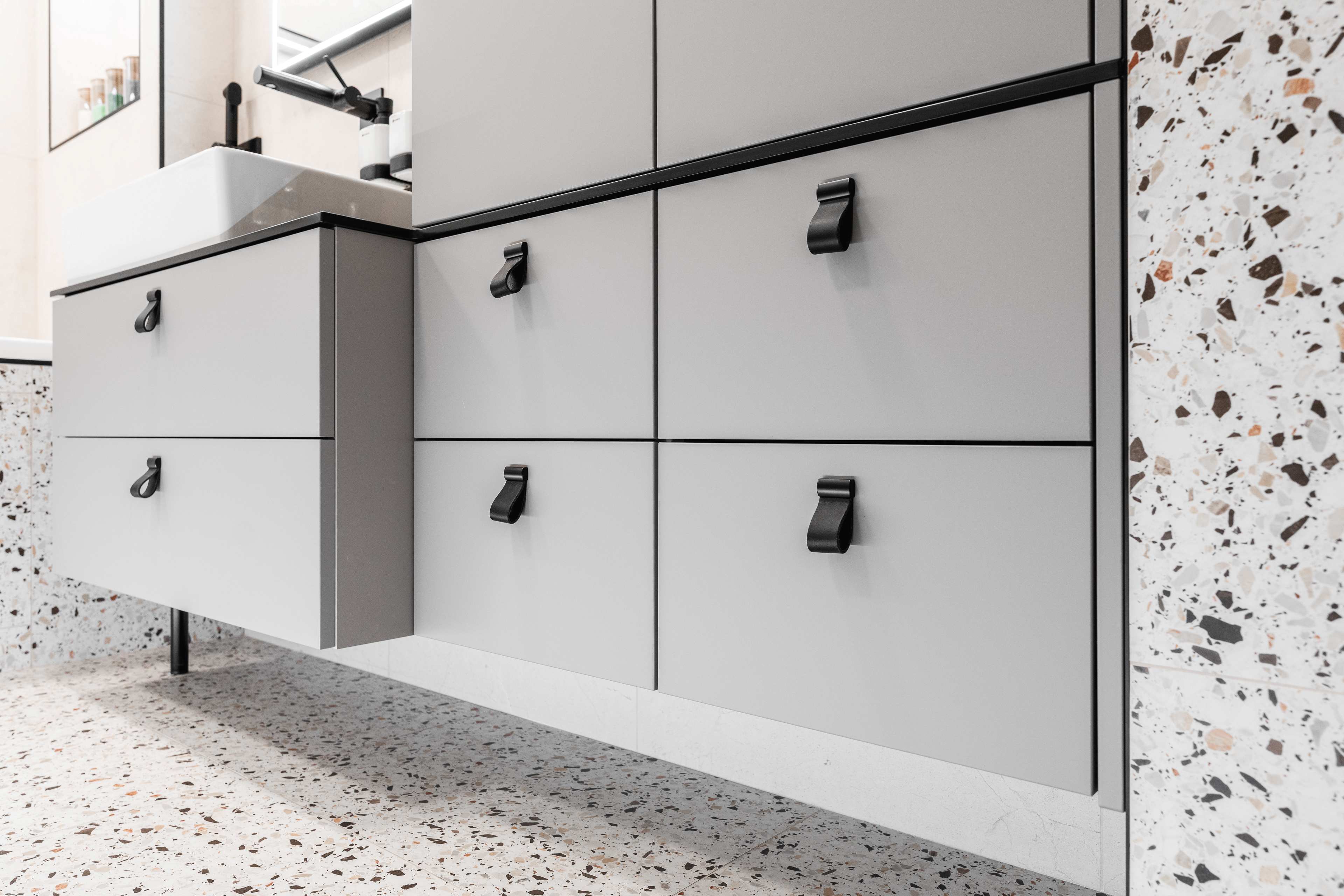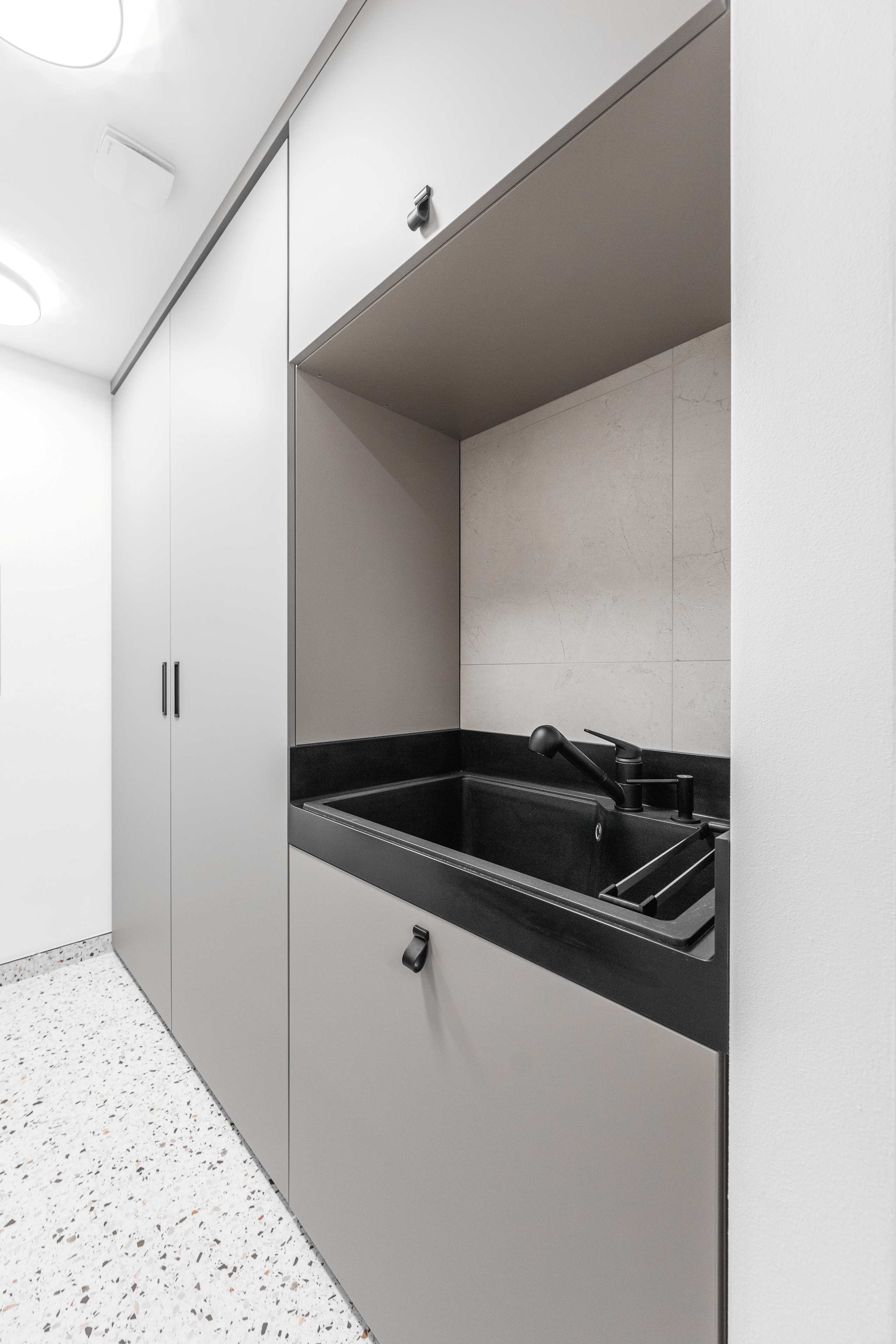 Veškeré přední a pohledové plochy jsou laděné do odstínu kašmírová, v provedení AFP (AntiFinger Print - protiotisková matná lakovaná úprava), v koupelně a na WC jsou skříňky otevíravé pomocí černých kožených knopků od Schüller.