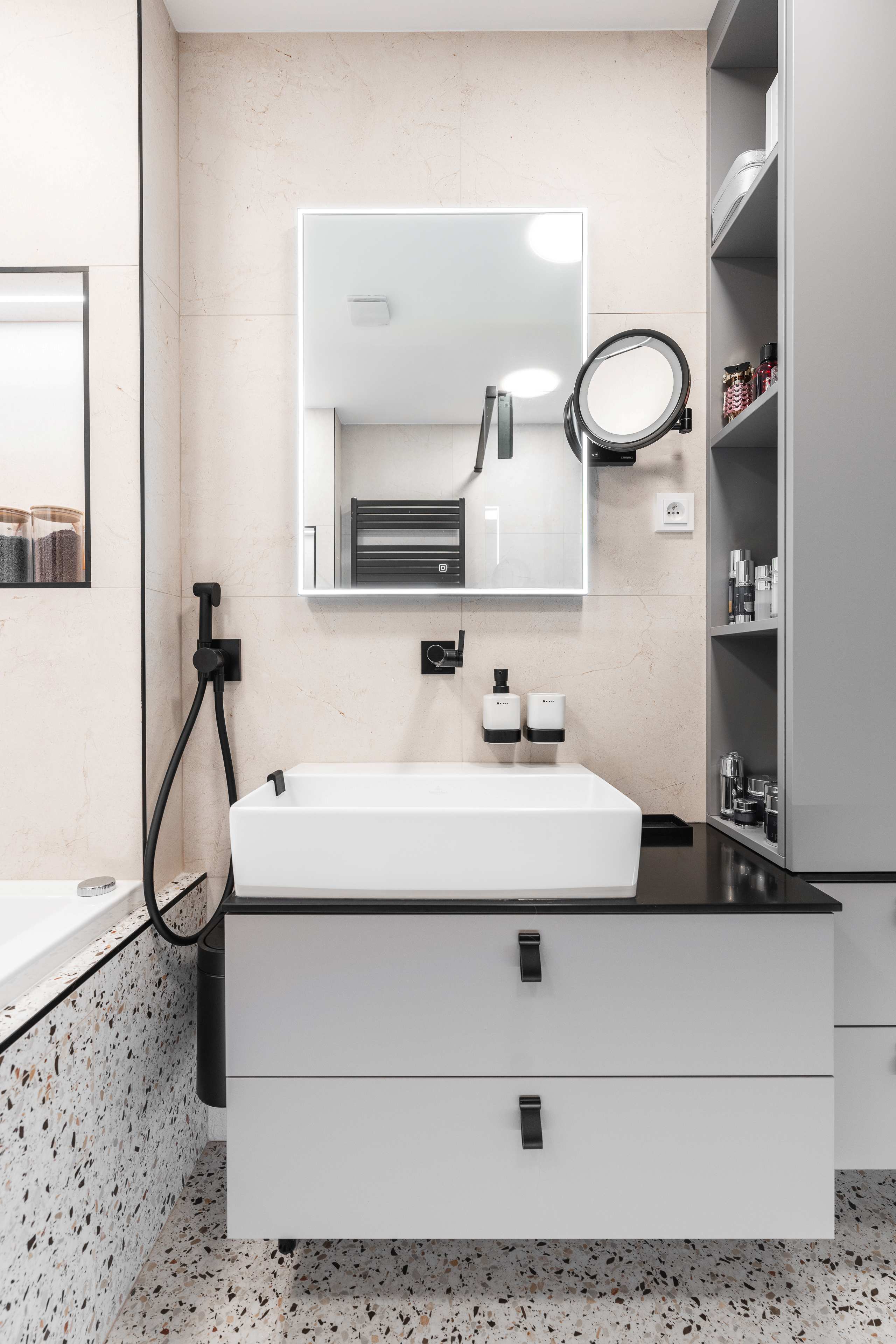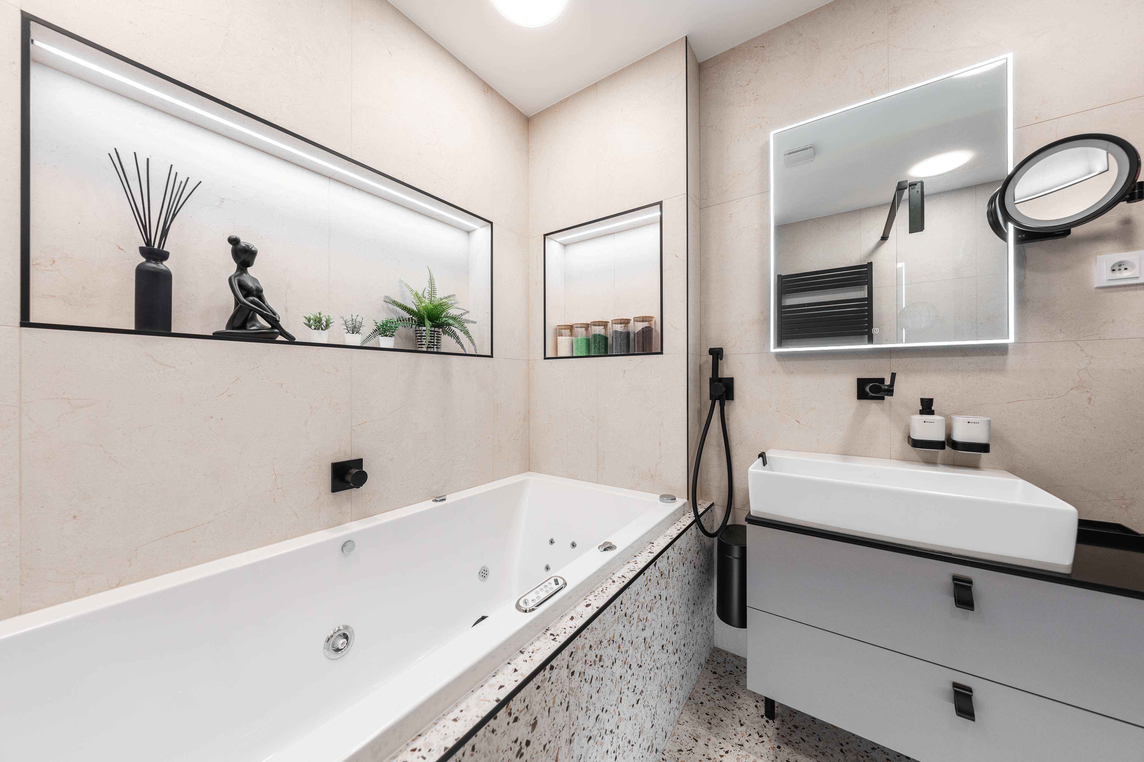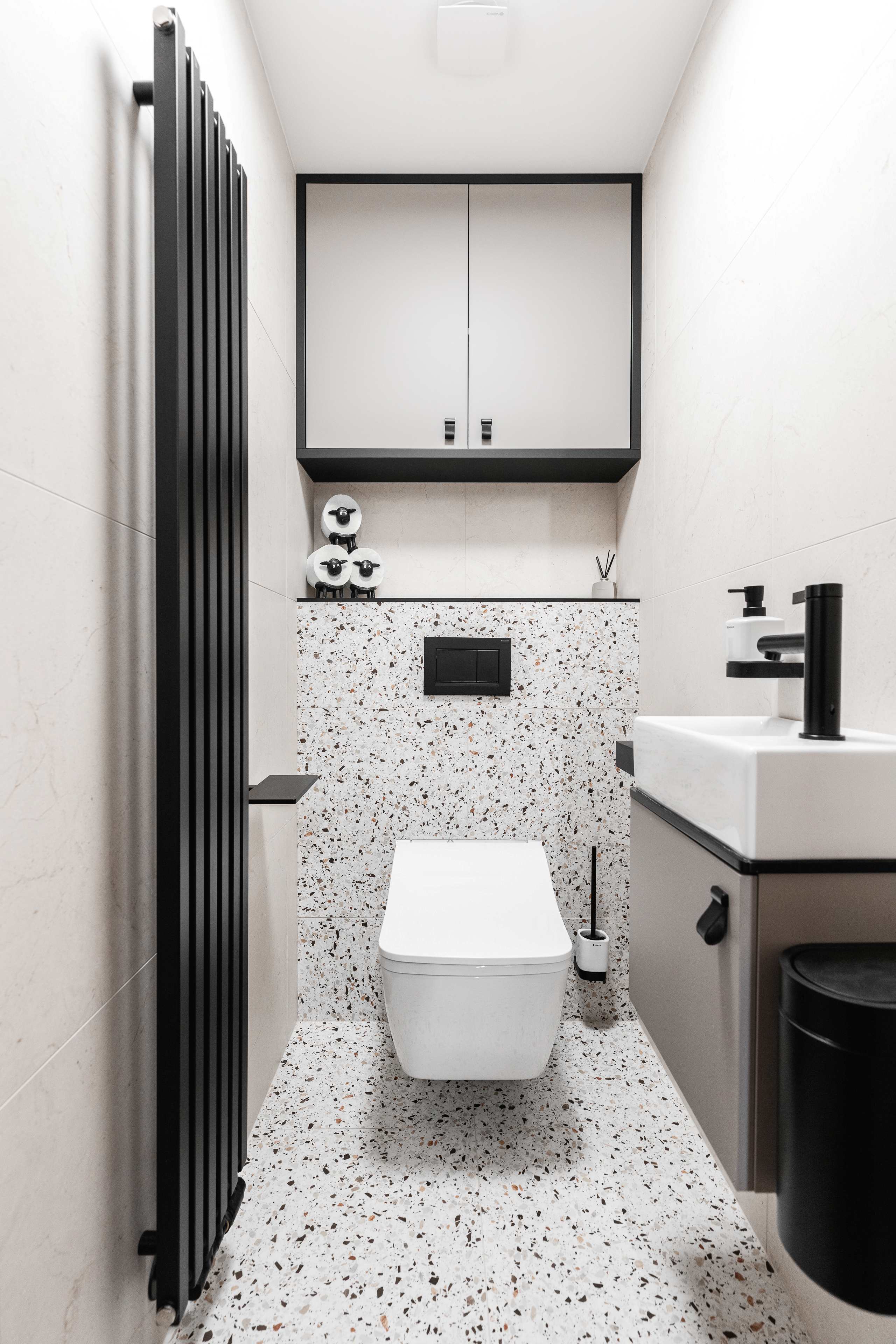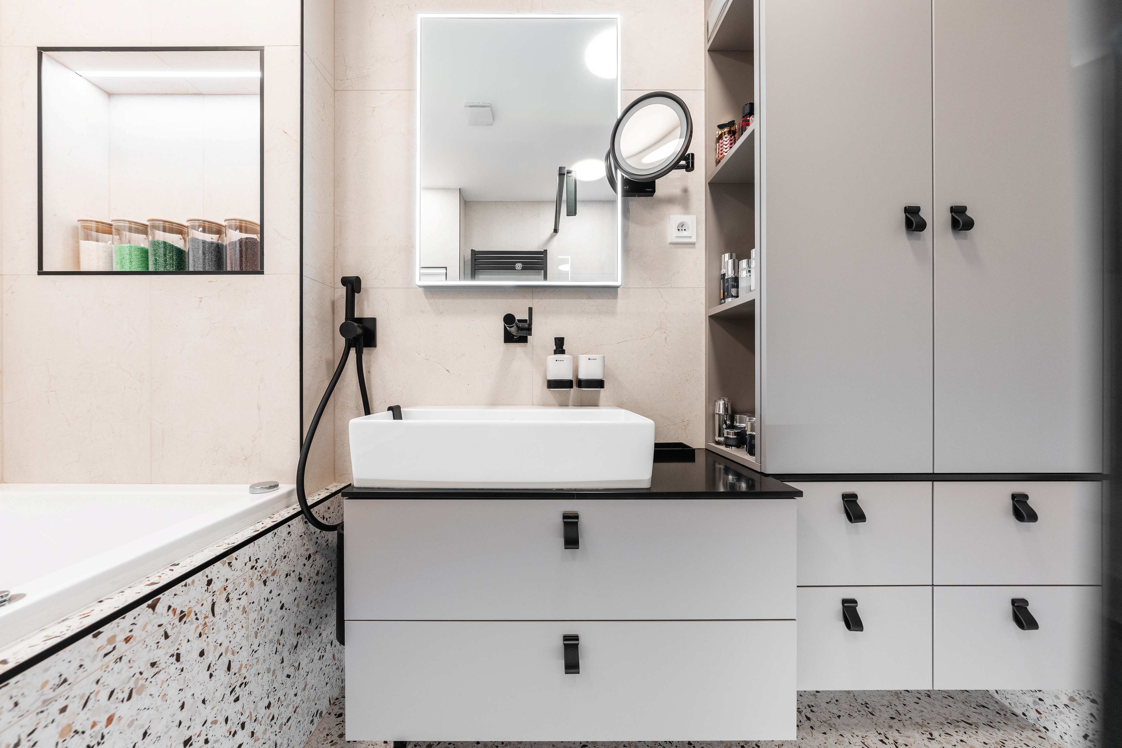 Veškeré přední a pohledové plochy jsou laděné do odstínu kašmírová, v provedení AFP (AntiFinger Print - protiotisková matná lakovaná úprava), v koupelně a na WC jsou skříňky otevíravé pomocí černých kožených knopků od Schüller.