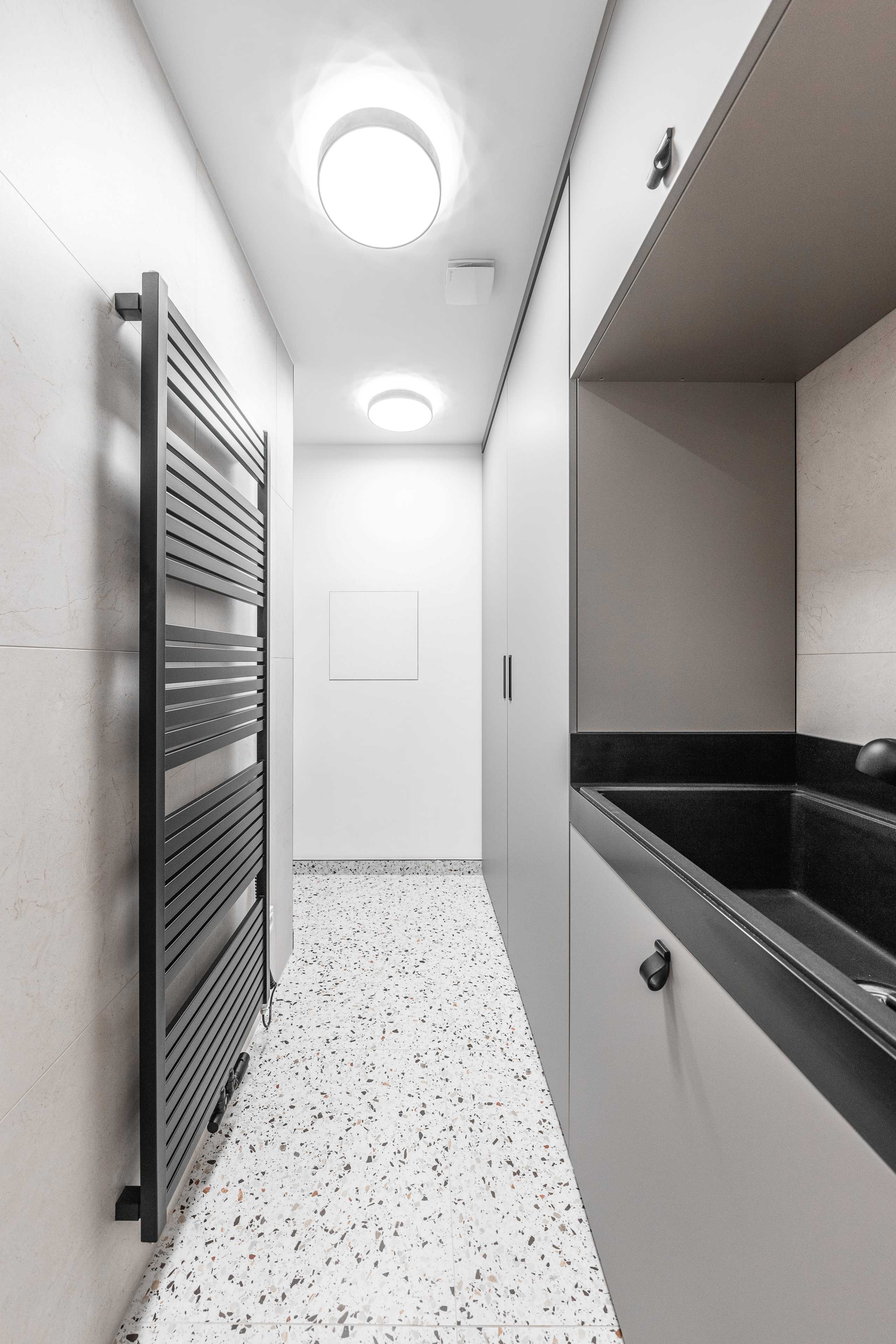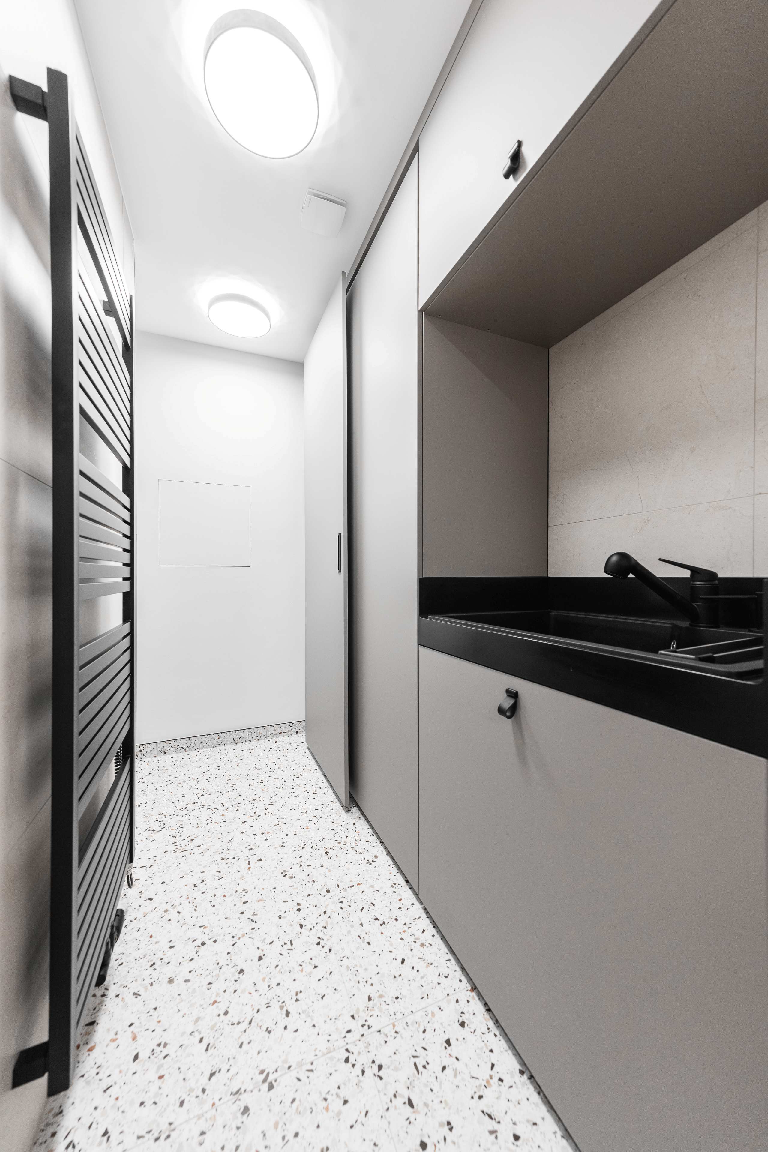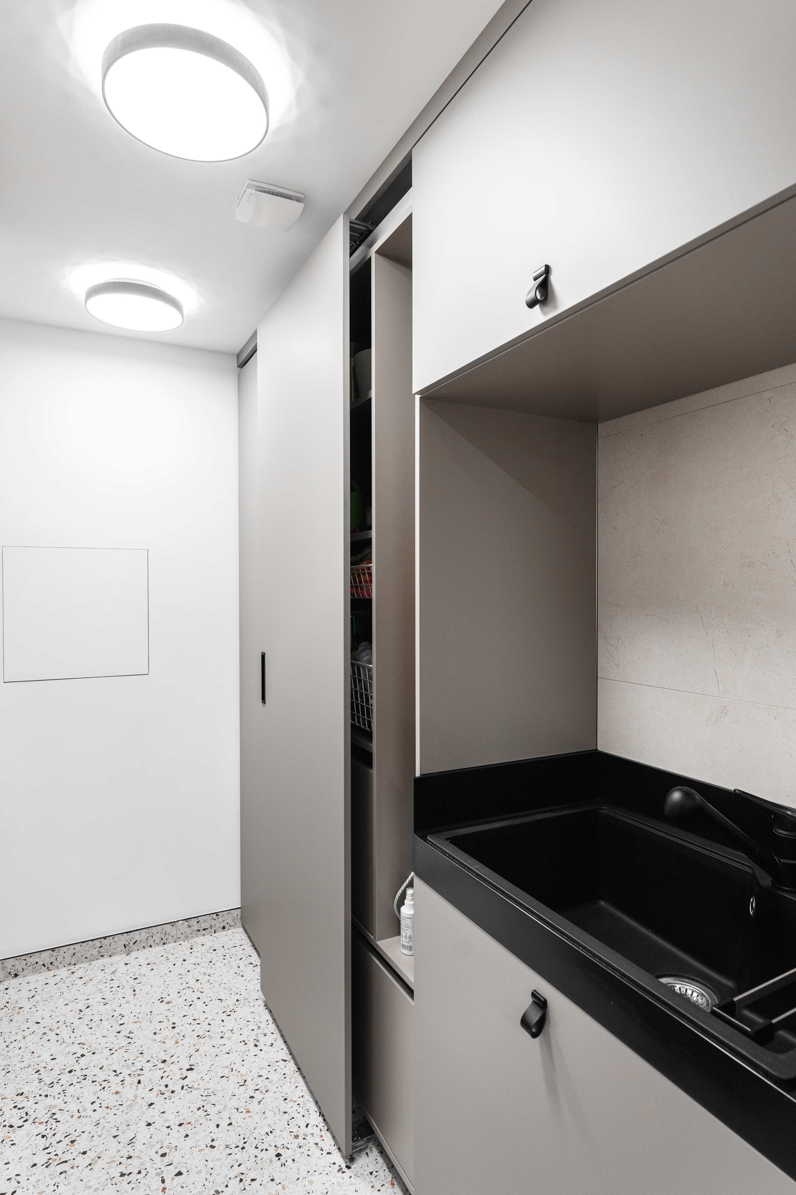 na míru řešený pojezd pro skříň do technické místnosti, hloubky šuplíkových skříněk v koupelně a samozřejmě horní odkládací plochy z kompozitního materiálu na všech spodních skříňkách.