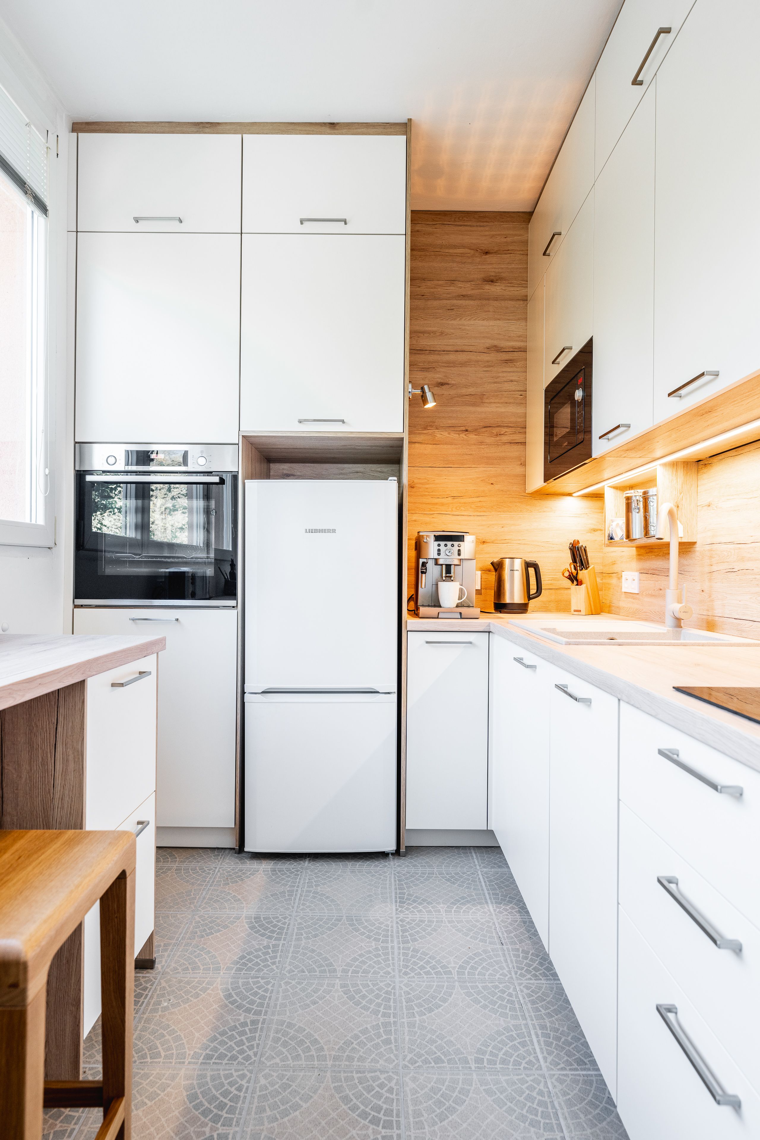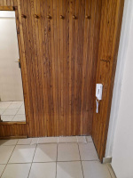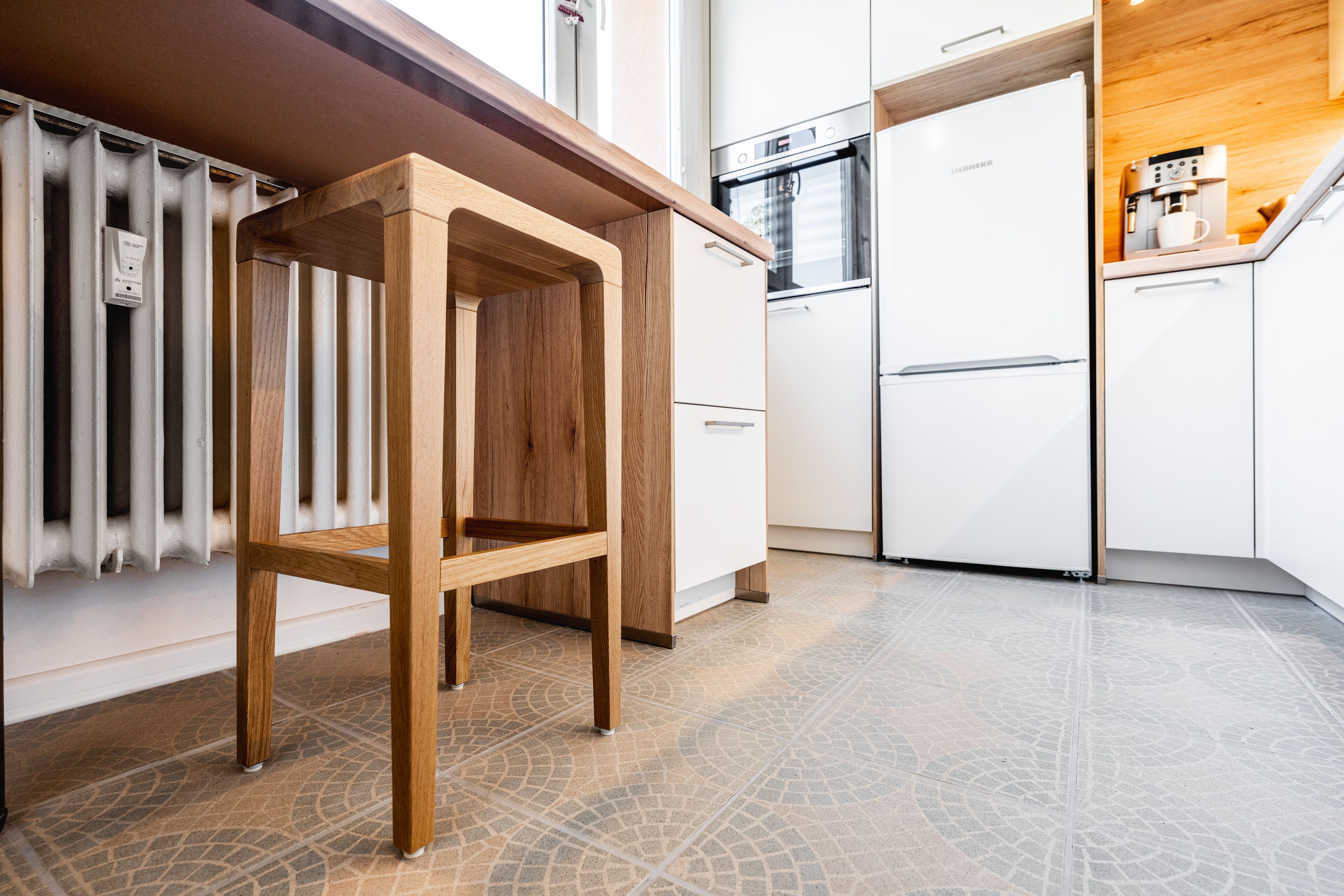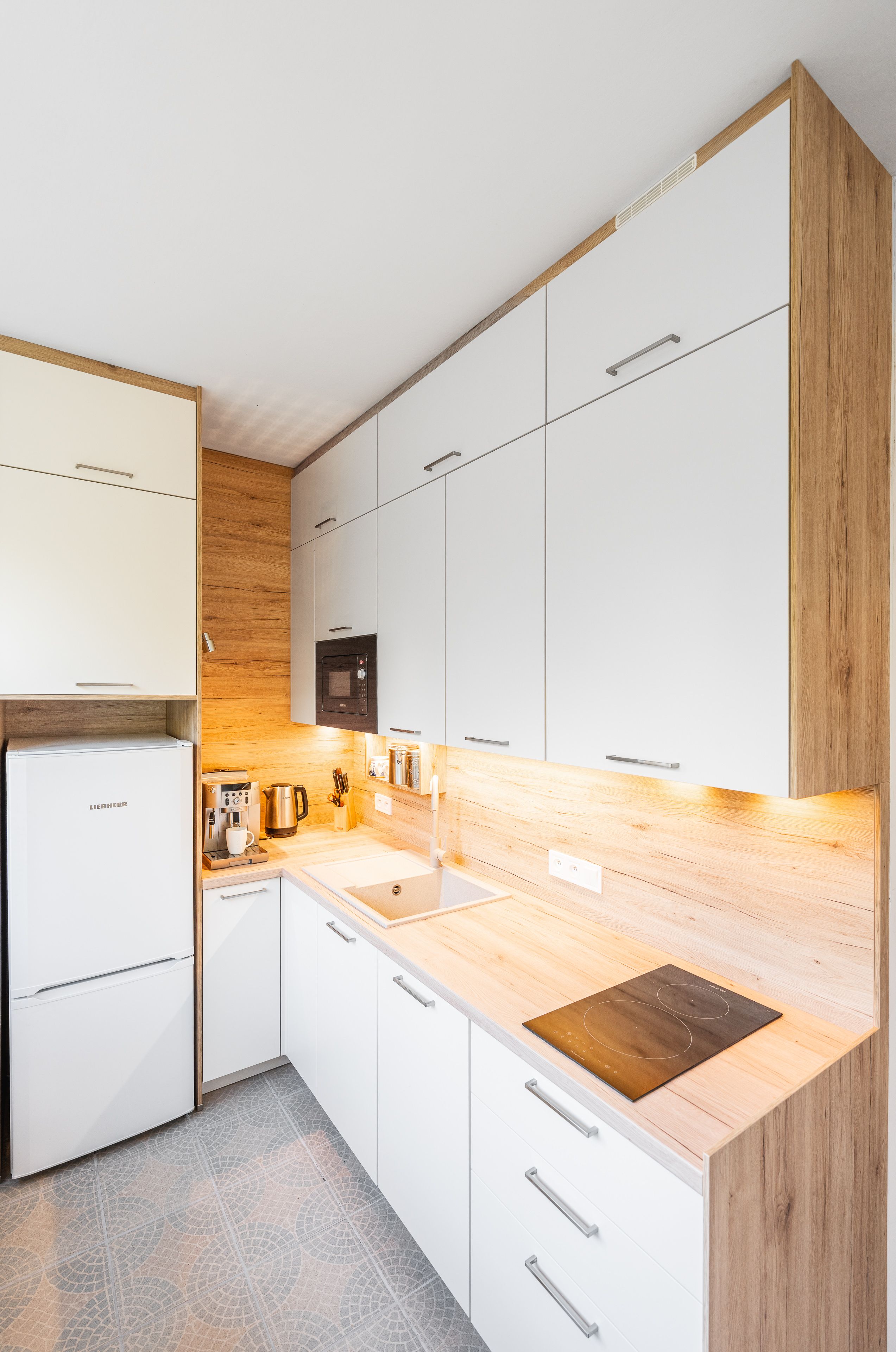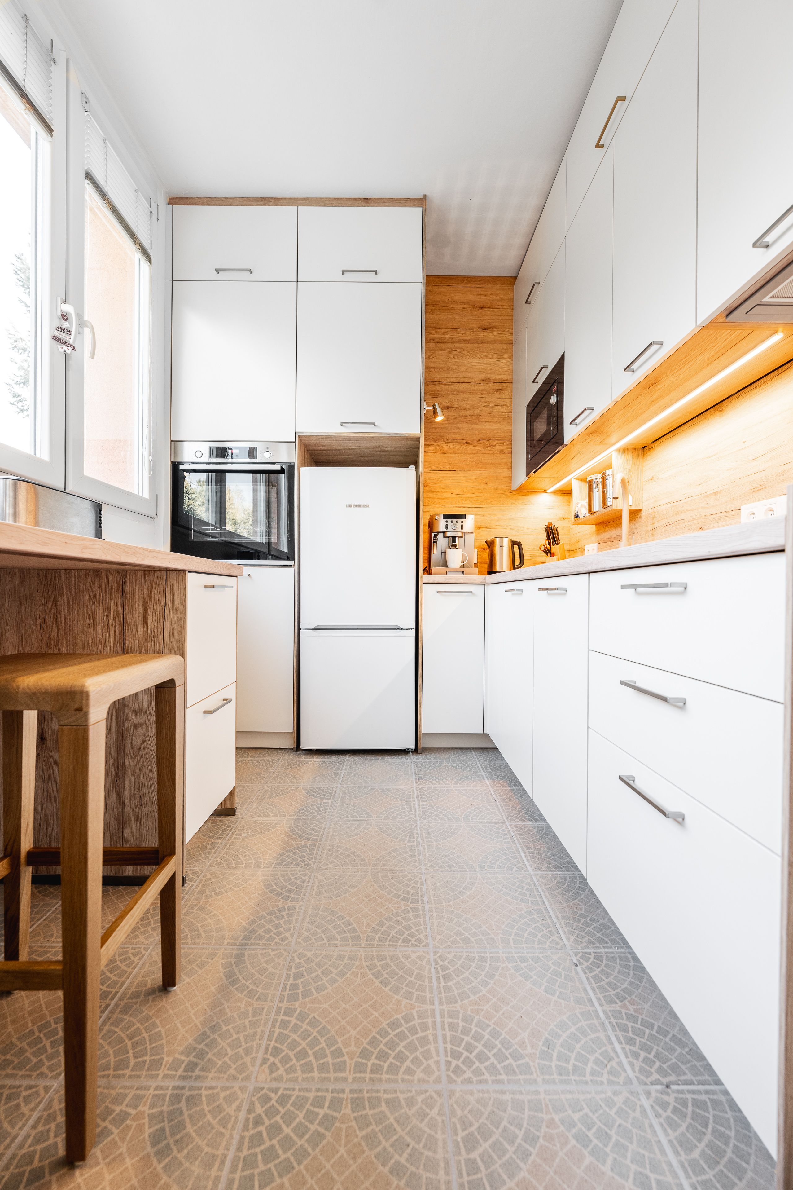 Klientka zakoupila byt částečně i s původním nábytkem, kde bylo potřeba byt vyklidit, stavebně poupravit a zmodernizovat. Klientka měla představu nové kuchyně, nových úložných prostor v předsíni a vybavit a zařídit ložnici. V předsíni a kuchyni byla stávající dlažba, kterou se paní rozhodla ponechat. Stavební úpravy a instalační přípravu prováděla firma Rekostavby Pavlíček, navrhli klientce přespárování a vyčistění stávající dlažby :)