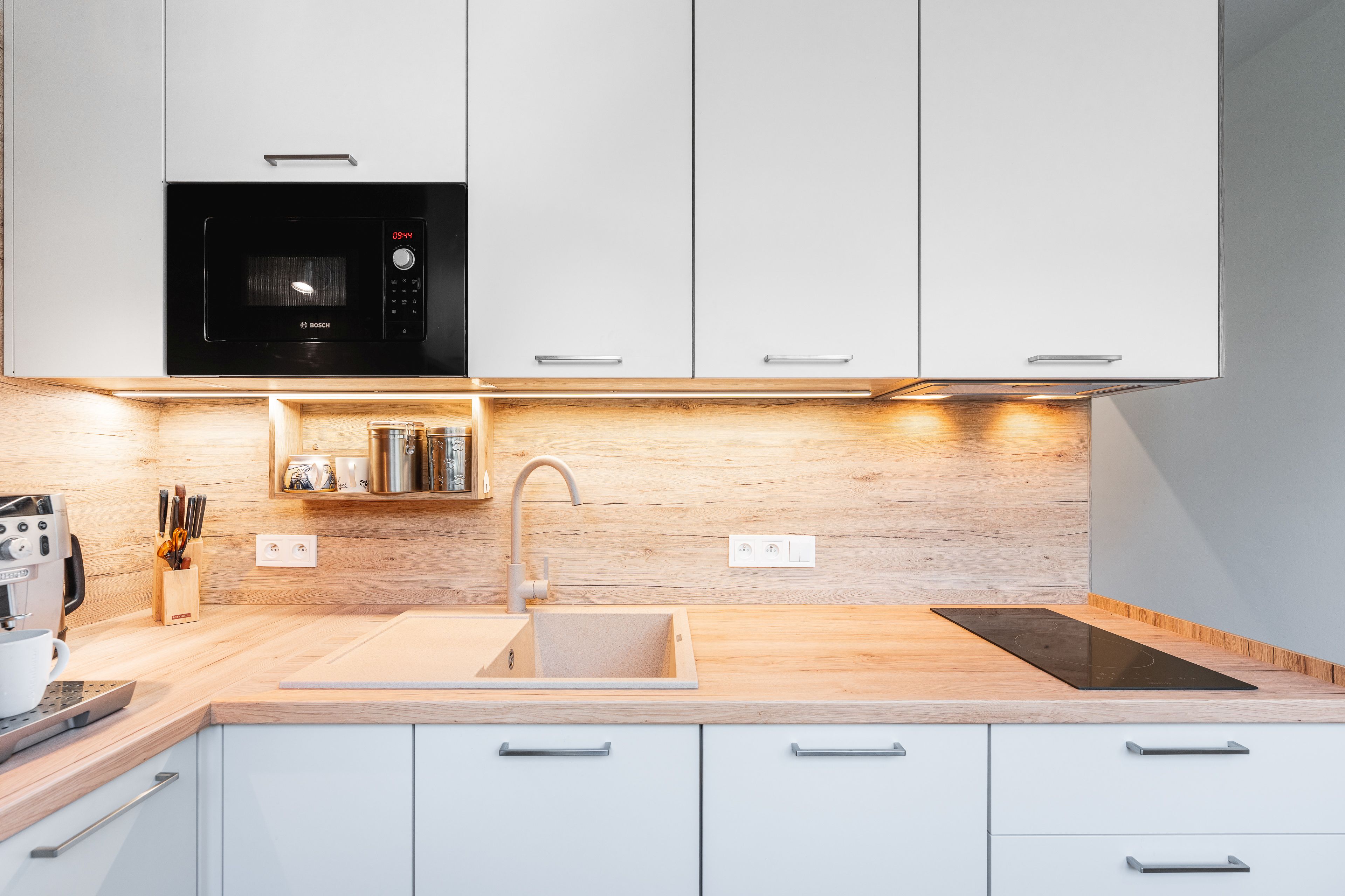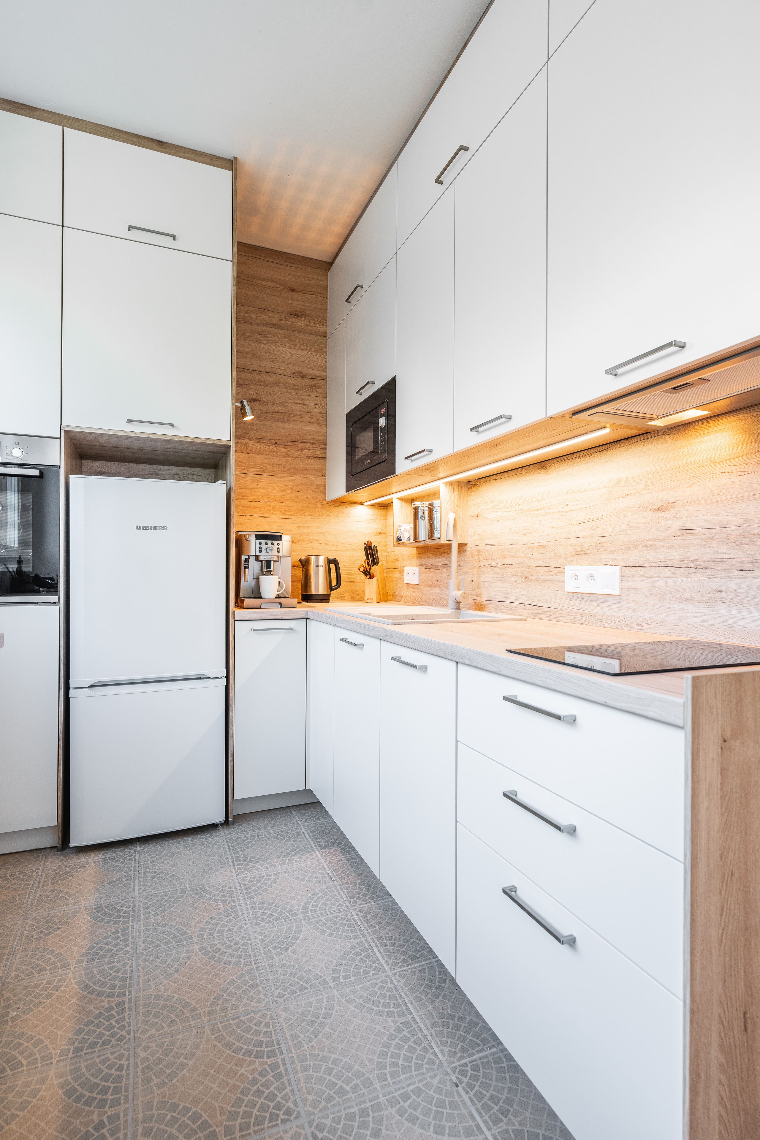 Kuchyně značky Deho. Země původu Německo. Kuchyně, odstín Magnolie matná, s laserovými hranami v kombinaci s dřevo-dekorem v odstínu dub.