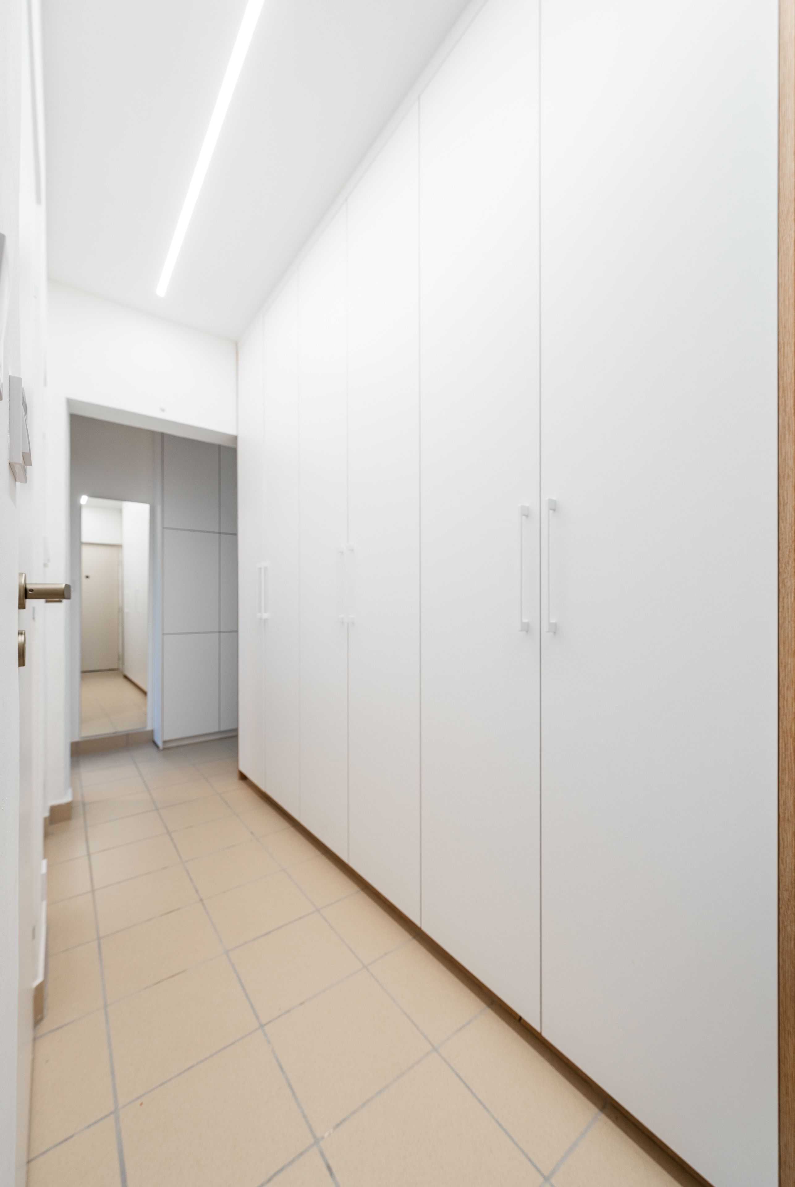 V předsíni, kterou jsme potřebovali hodně prosvětlit, jsme s ohledem na odstín dlažby zvolili luxusní bílý matný vzhled opět pro doplnění v kombinaci s dřevo-dekorem.