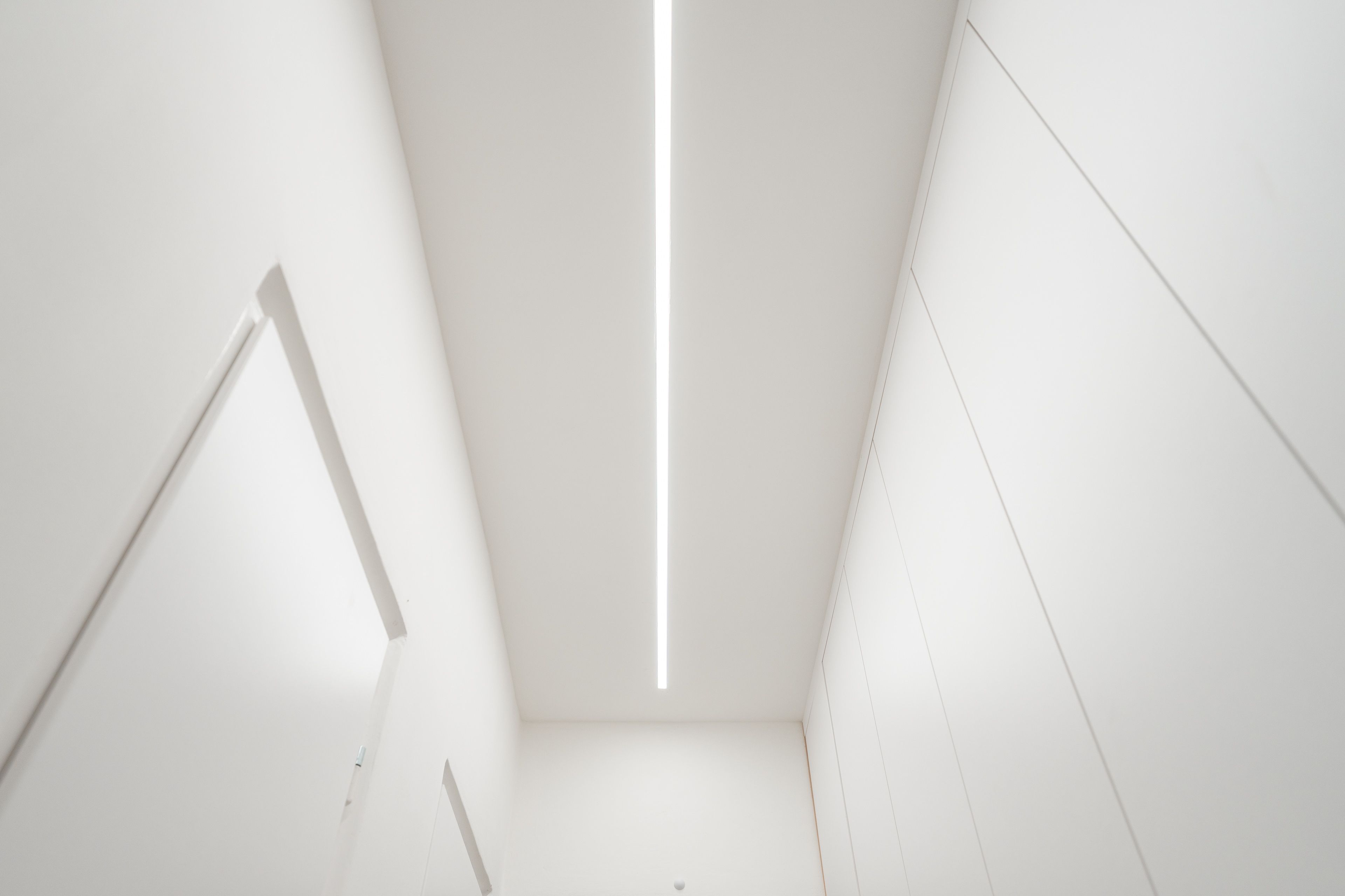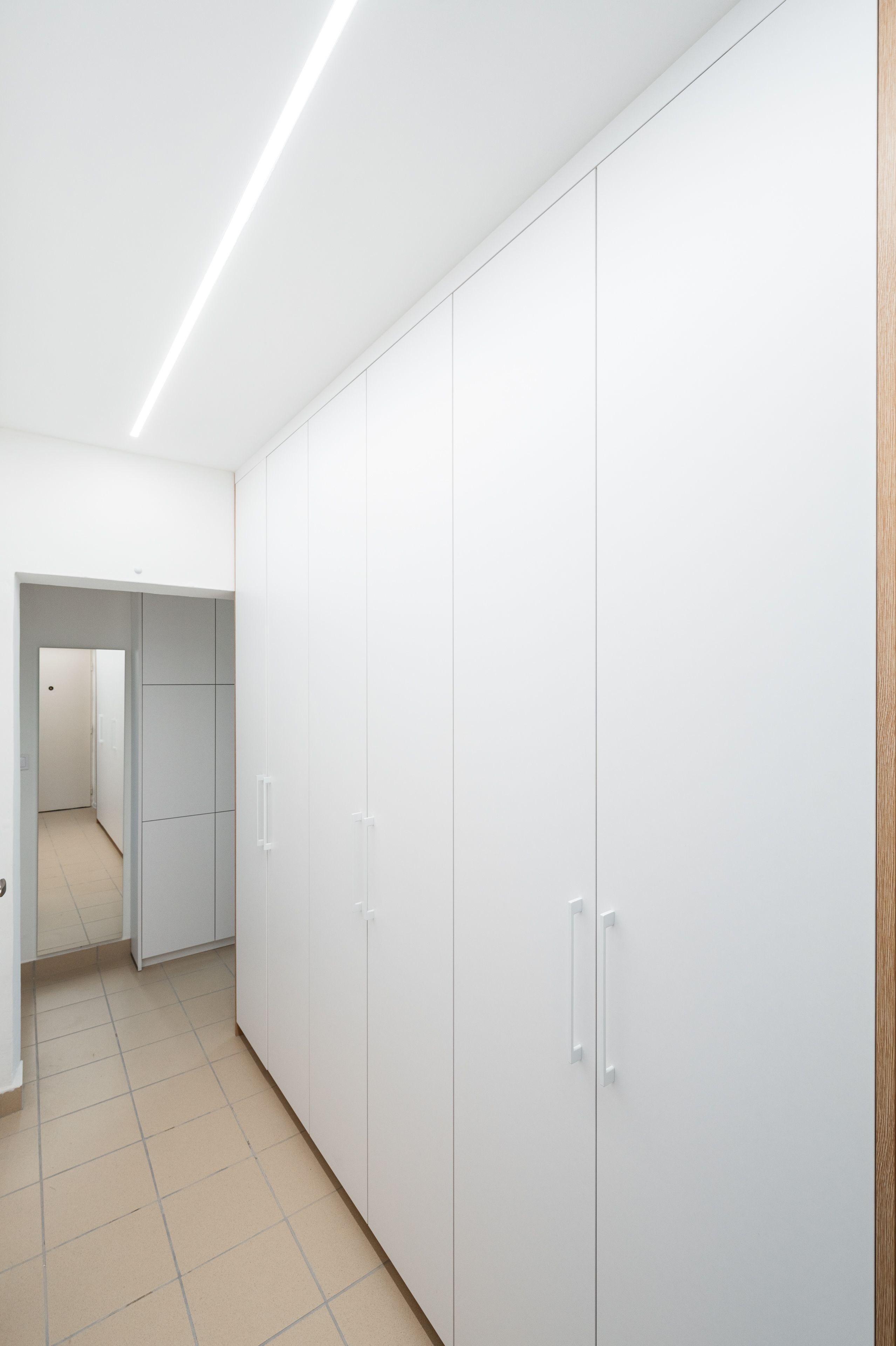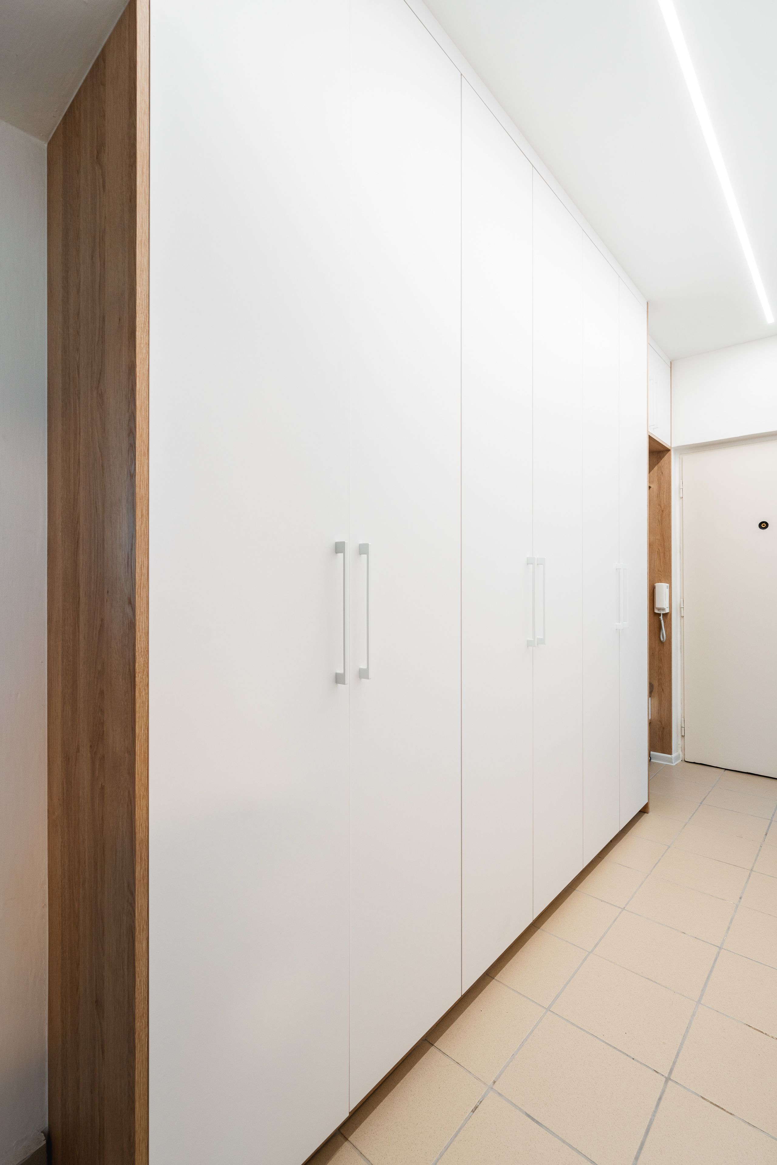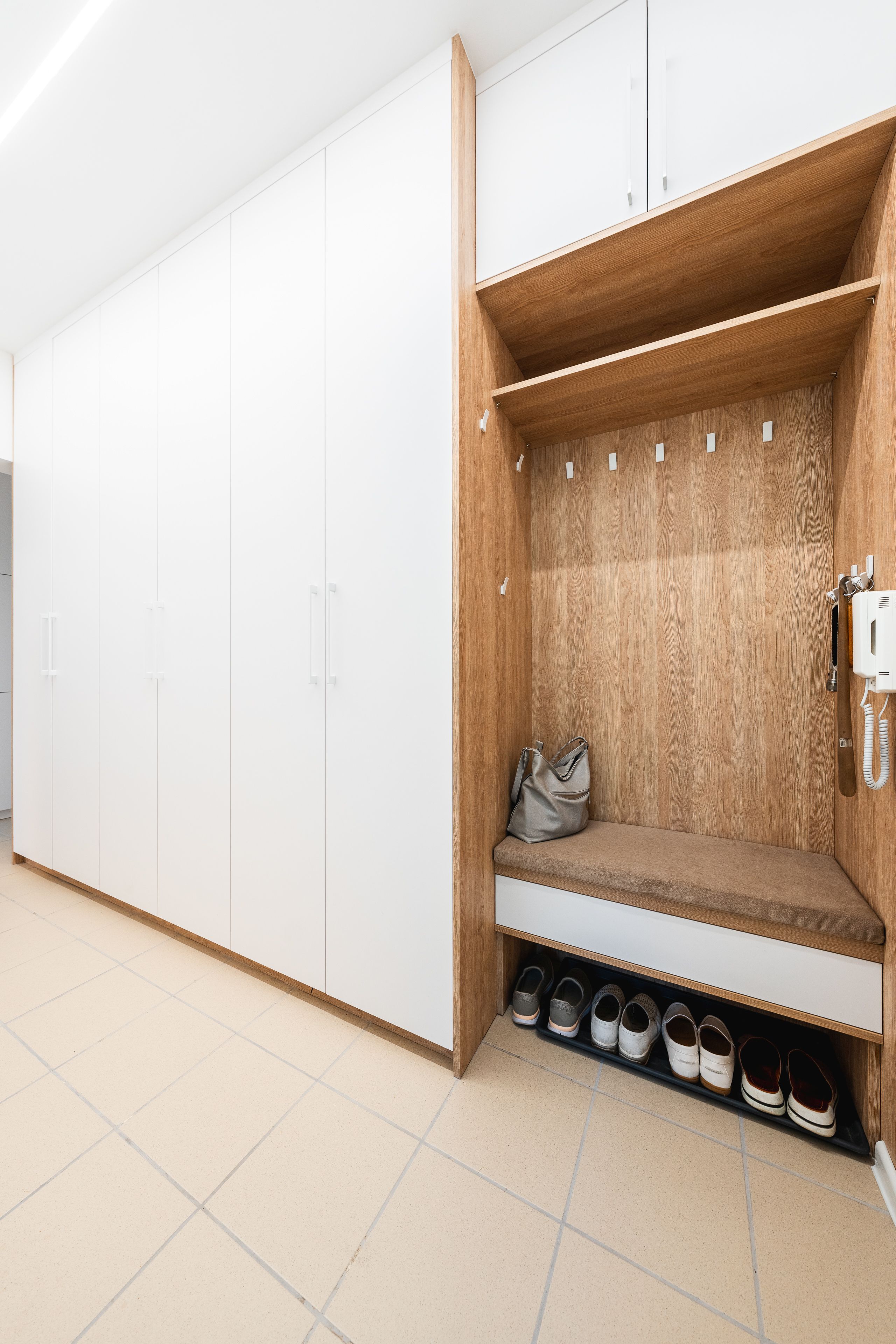 V předsíni jsme maximálně využili prostor v podobě velkorysé vestavné skříně s prostorem na sednutí a odložení kabátů a uzavřené knihovny, vše z naší zakázkové výroby. Liniové stropní světlo je za nás dokonalé. Rádi tato zapuštěná liniová světla používáme do našich projektů. Neruší a poskytují velké množství světla.