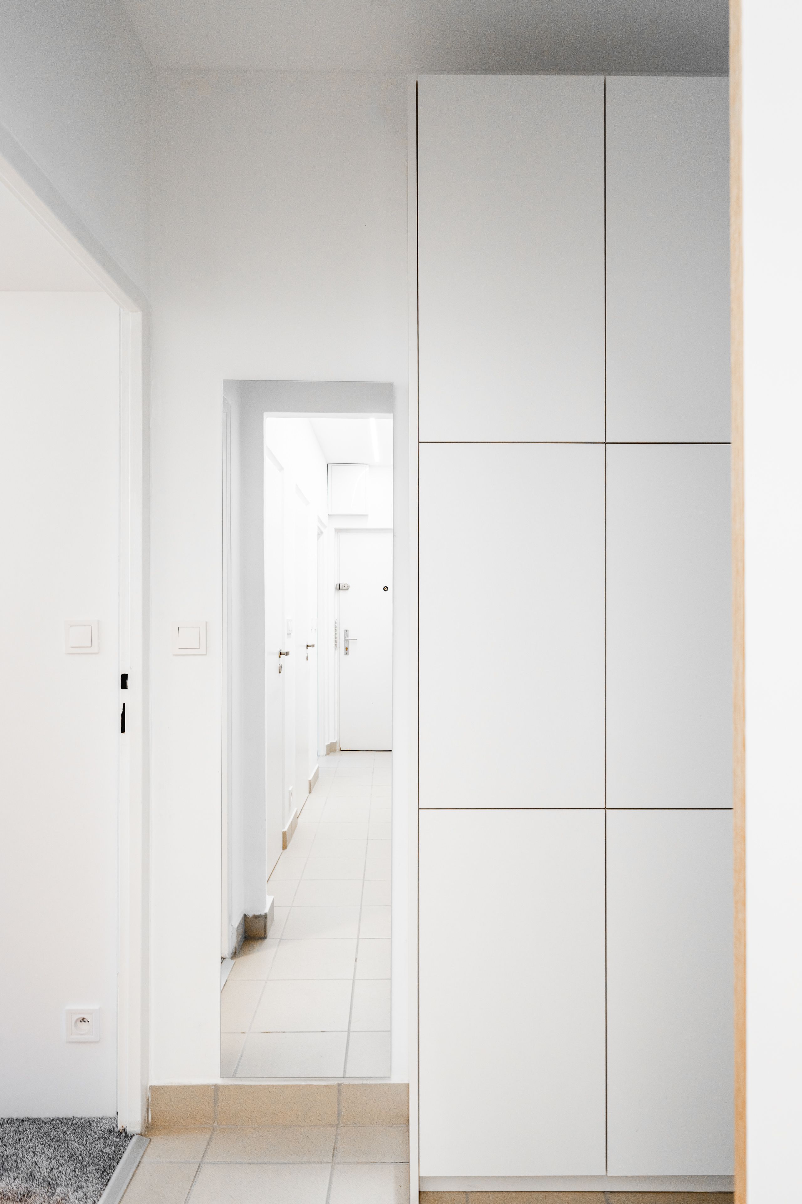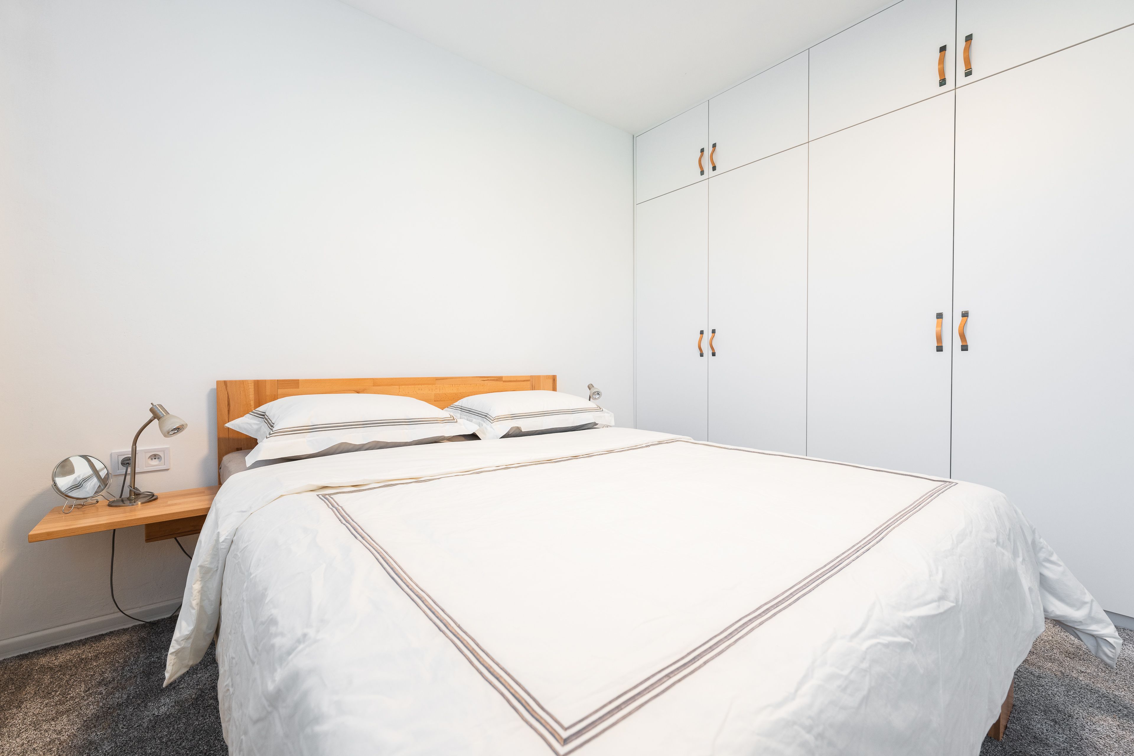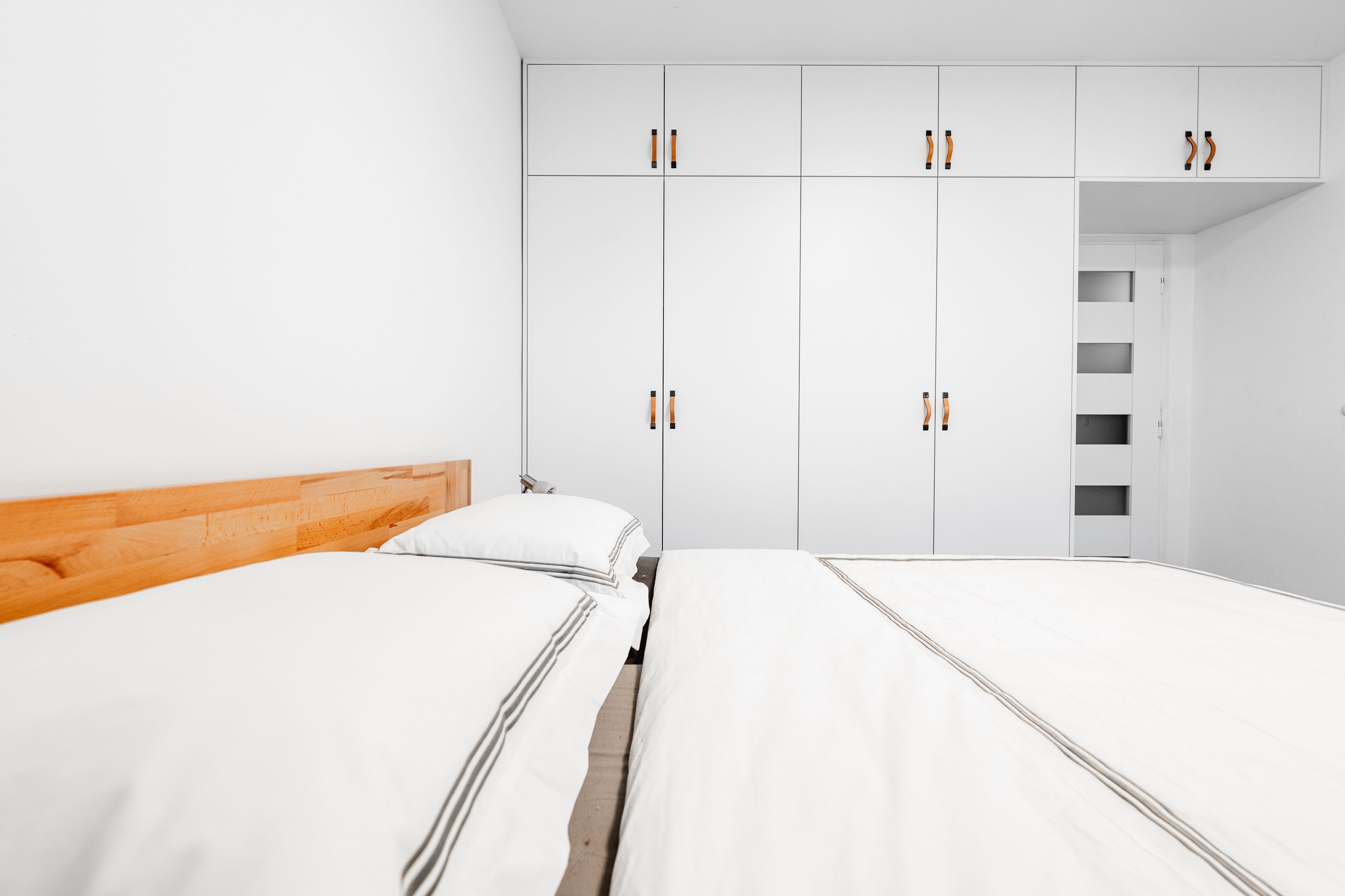 K šedému odstínu koberce jsme i tady zachovali skříně v bílé matné barvě.