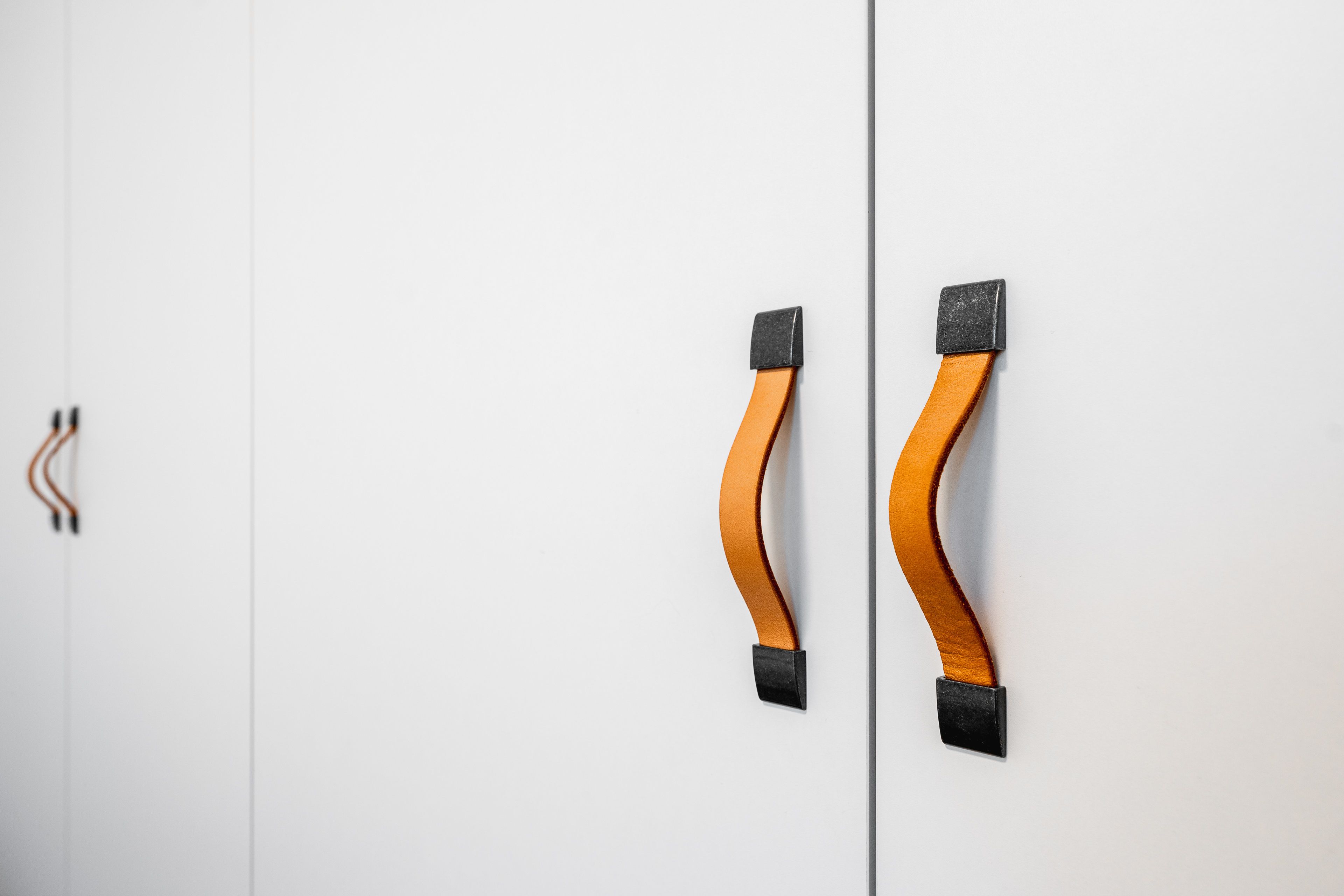 Klientka všude v bytě preferovala úchytky. Tady jsme použili kožené úchytky v odstínu přírodní kůže, které barevně krásně ladí s odstínem postele a stropního světla, které je v provedení perleťová.