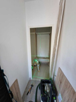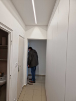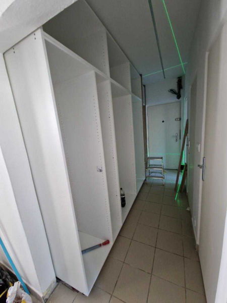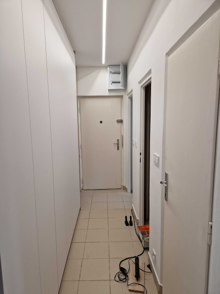 Pokračovalo se stavebními pracemi v podobě sádrokartonového podhledu v předsíni, obýváku a ložnici. Obložením některých stěn sádrokartonem, osazením liniového led světla v předsíni. Dle našich podkladů stavební firma provedla veškerou stavební a instalační připravenost, včetně nových el. rozvodů v celém bytě.