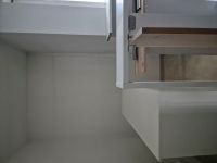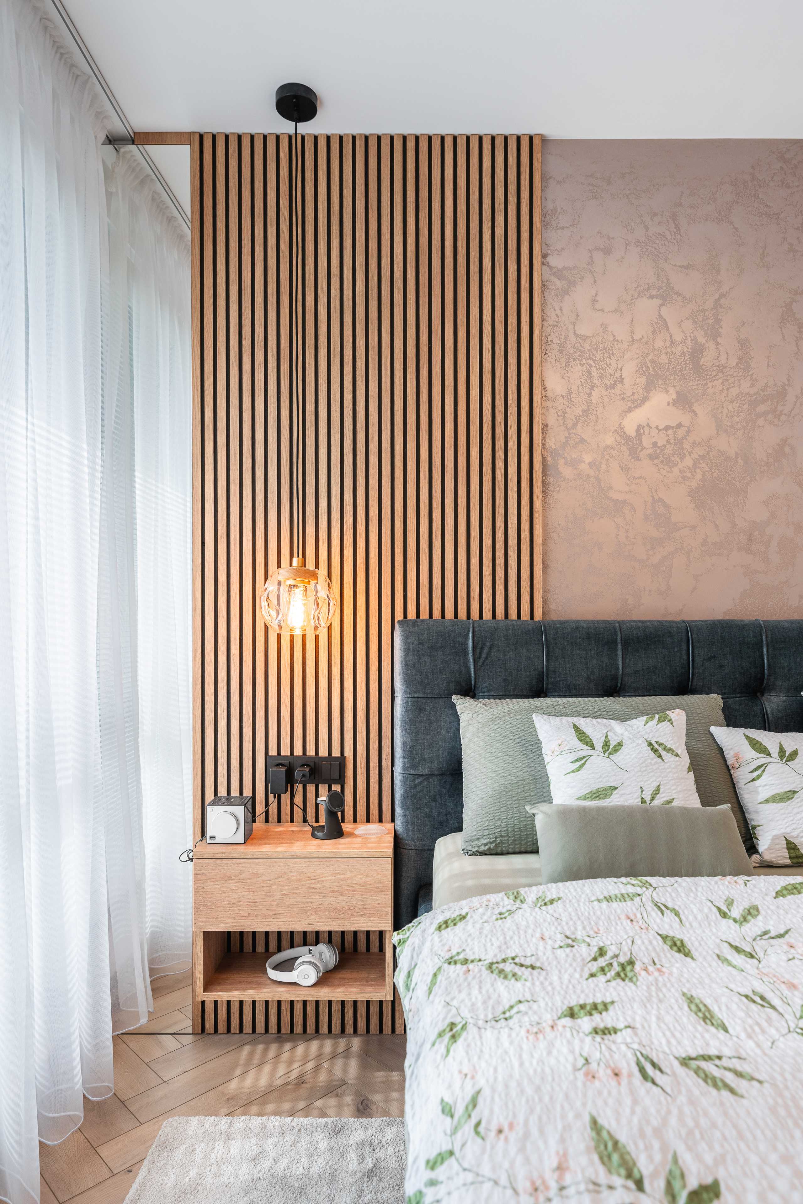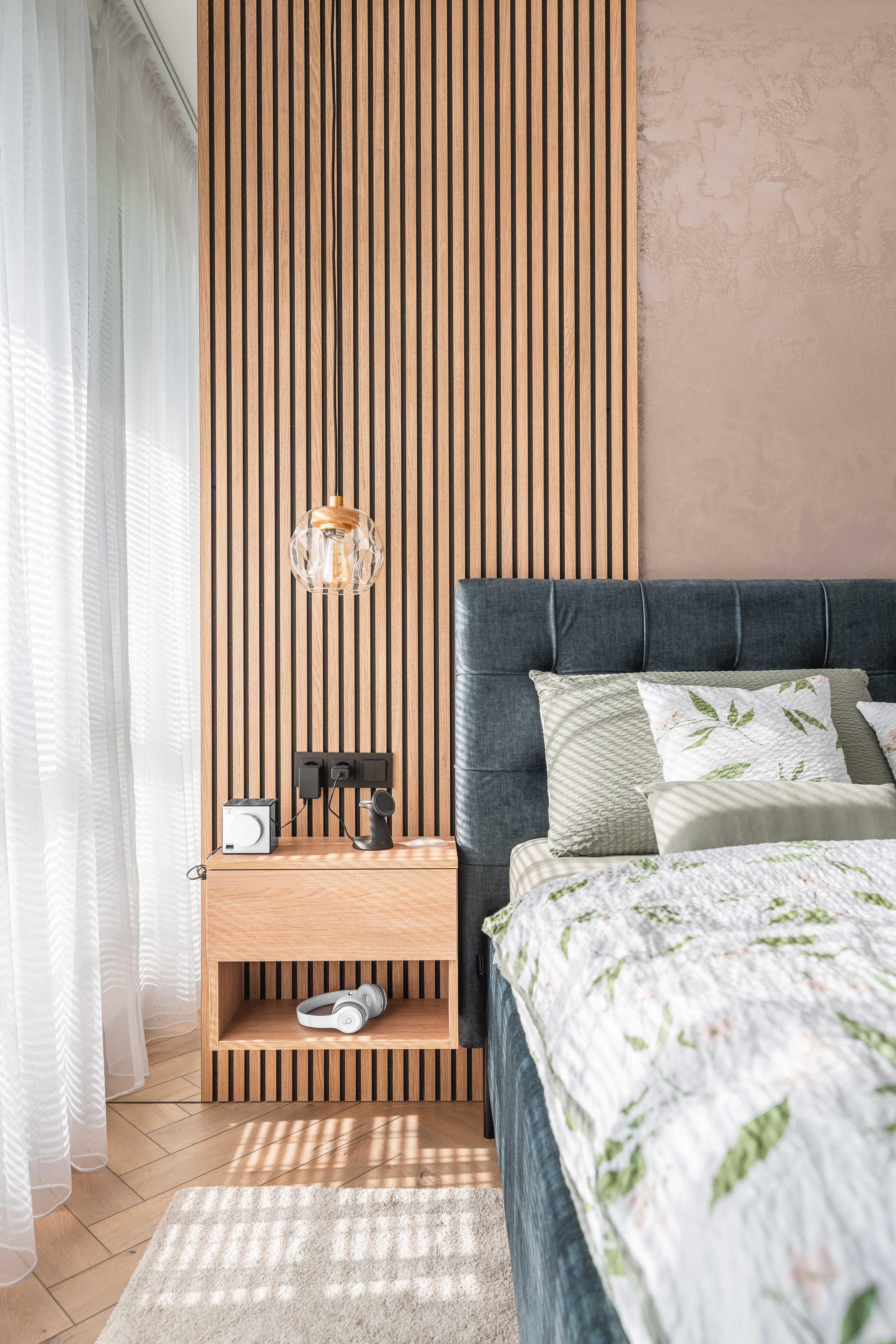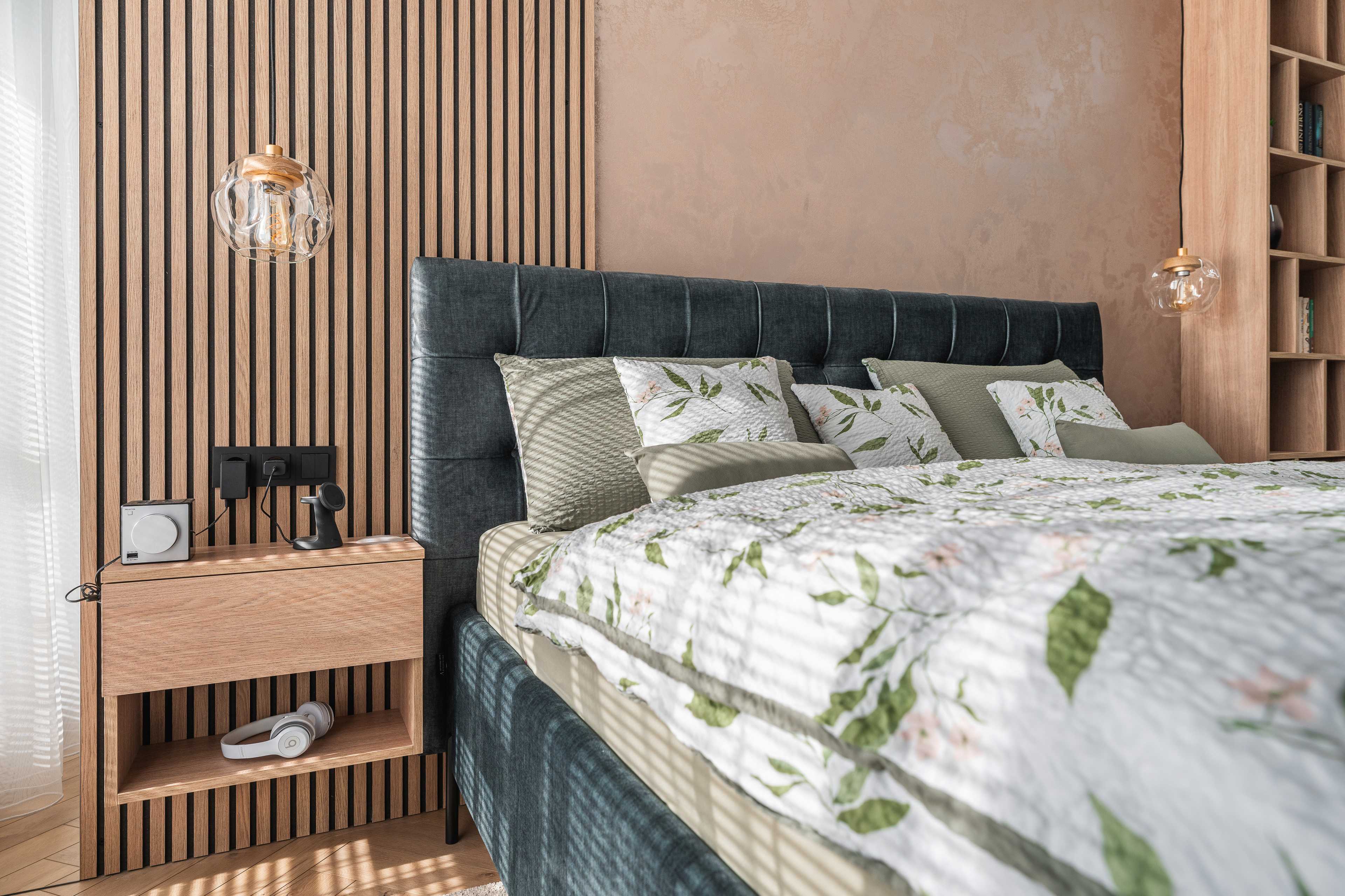 Svislé lamely s ohledem na akustiku. Komody, lamely, noční stolky, knihovna, postel. Veškerý nábytek byl vyráběný na zakázku, v kombinacích dřevodekoru a uni novinkové barvy s ochranou AFP proti otiskům prstů. Víc neprozradíme....