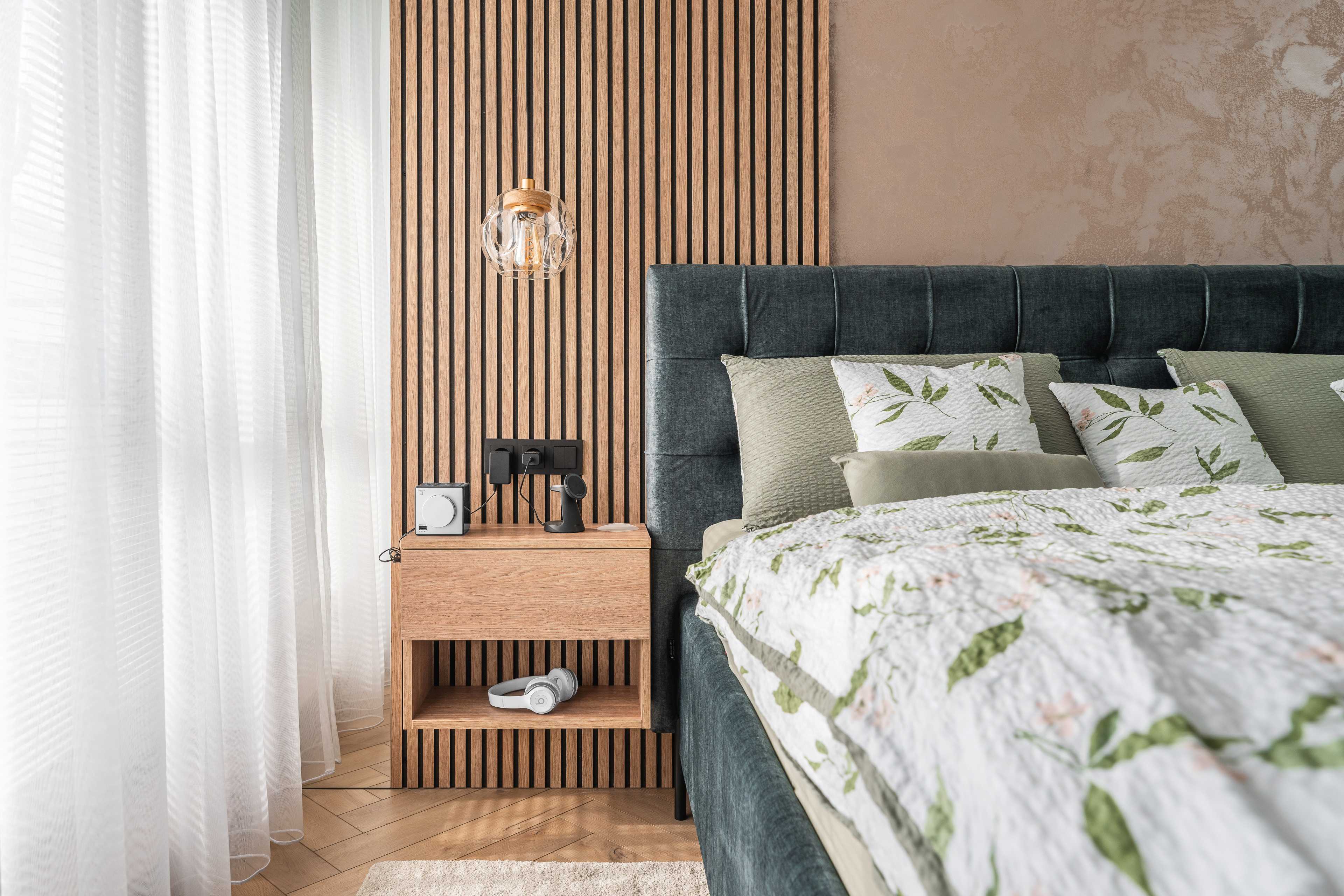 Se zajímavým dekorem podlahy, odstínem stěrky, krásnými závěsnými světly s Natur sklem a zlatavou žárovkou, se sametovým potahem zelenomodrého odstínu postele. Luxusní, pohodlný, komfortní. Škoda, že fotky nedokáží přenést a vystihnout tu atmosféru, která v místnosti panuje, kterou zažijete na místě samém.