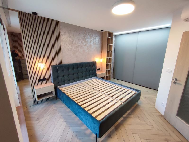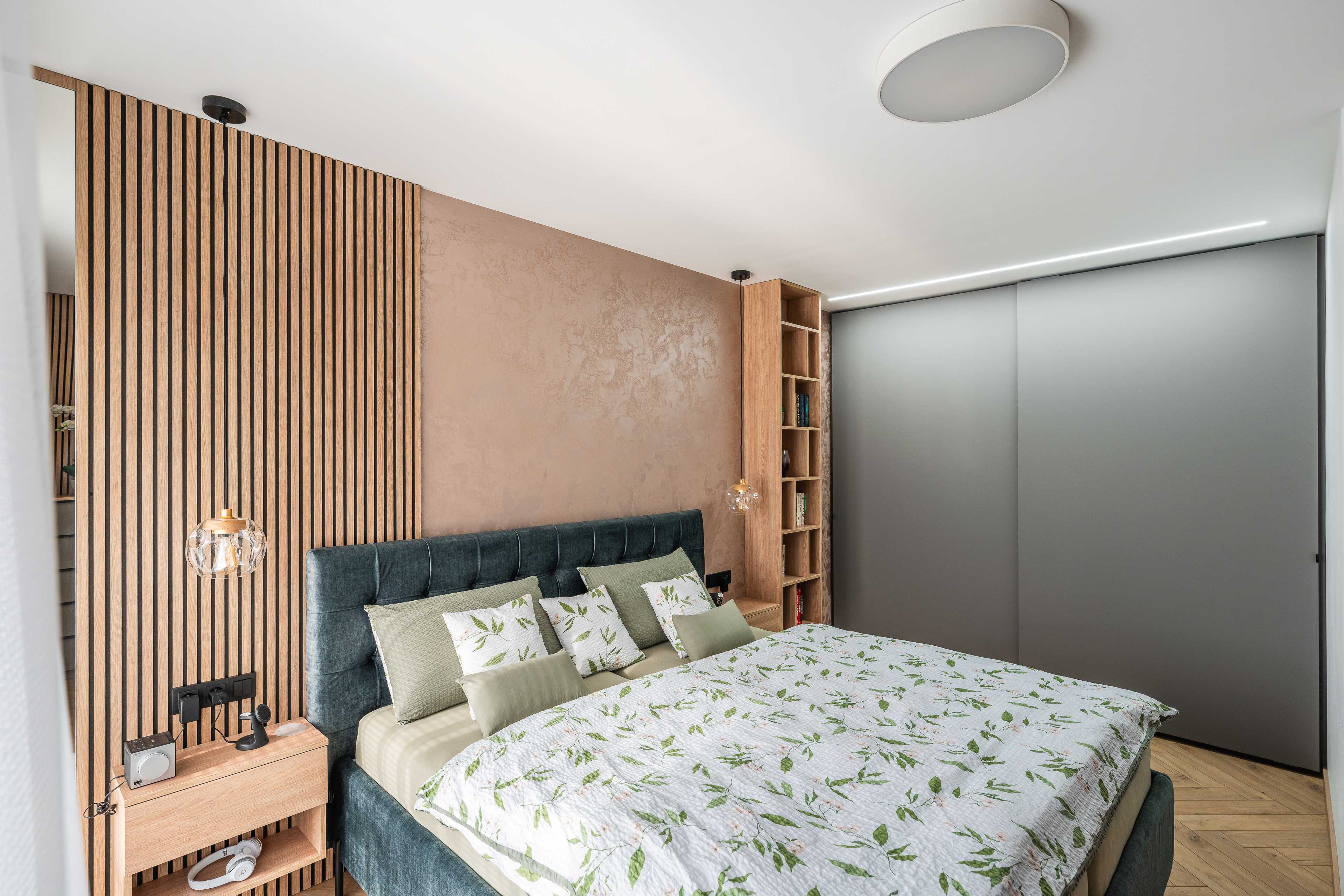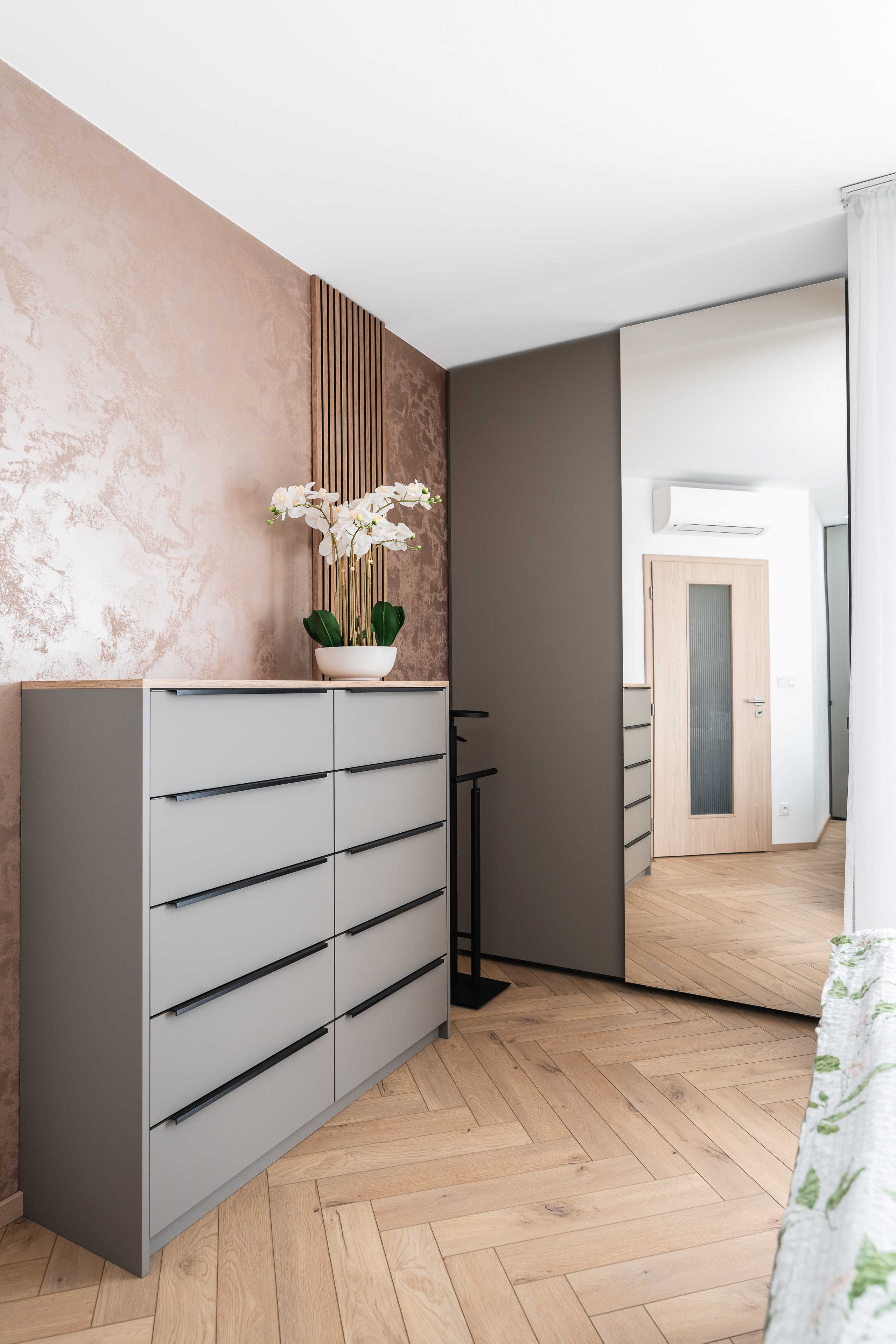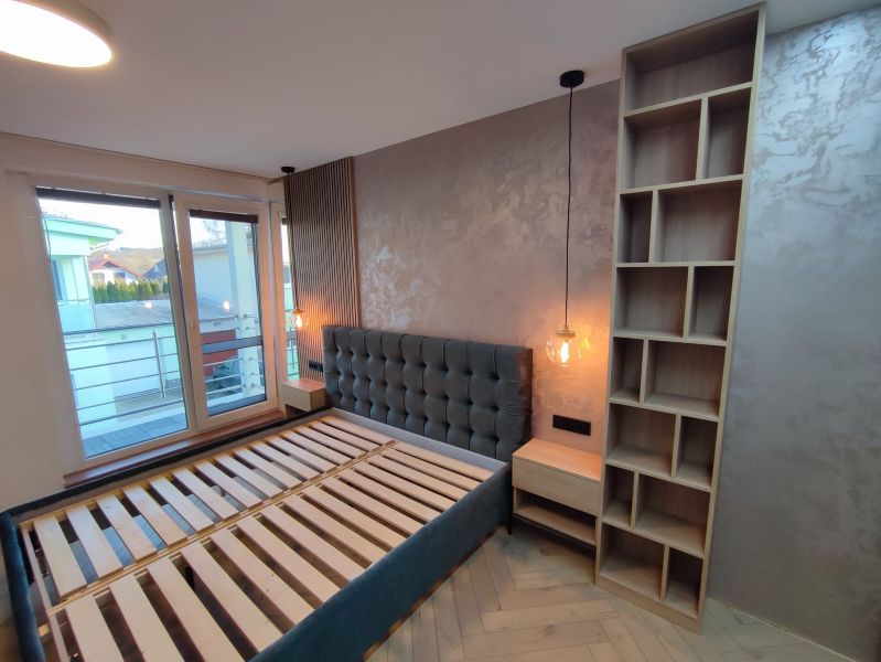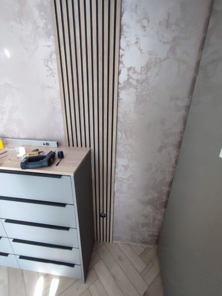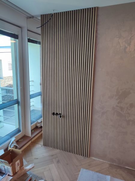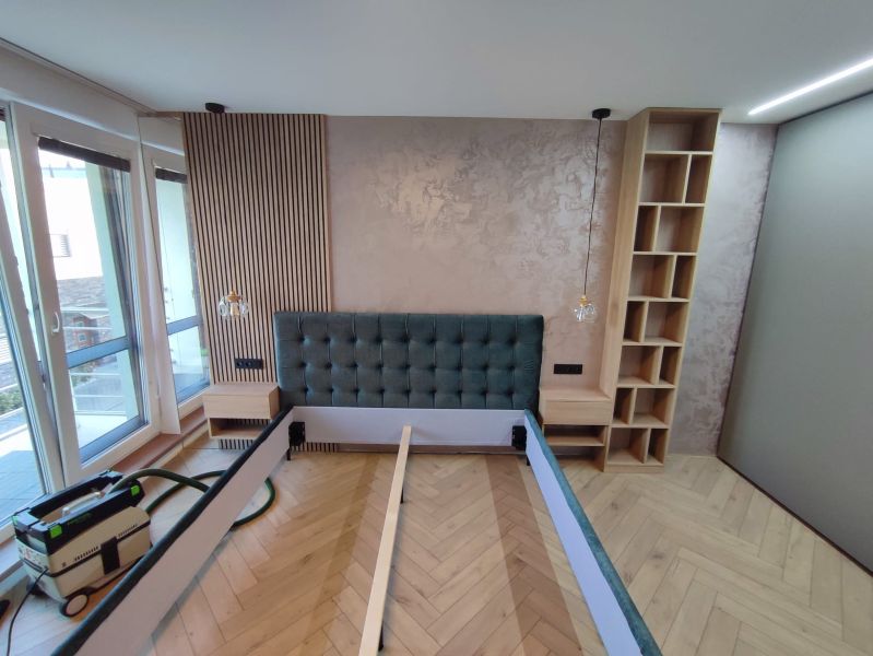 Svislé lamely s ohledem na akustiku. Komody, lamely, noční stolky, knihovna, postel. Veškerý nábytek byl vyráběný na zakázku, v kombinacích dřevodekoru a uni novinkové barvy s ochranou AFP proti otiskům prstů. Víc neprozradíme....
