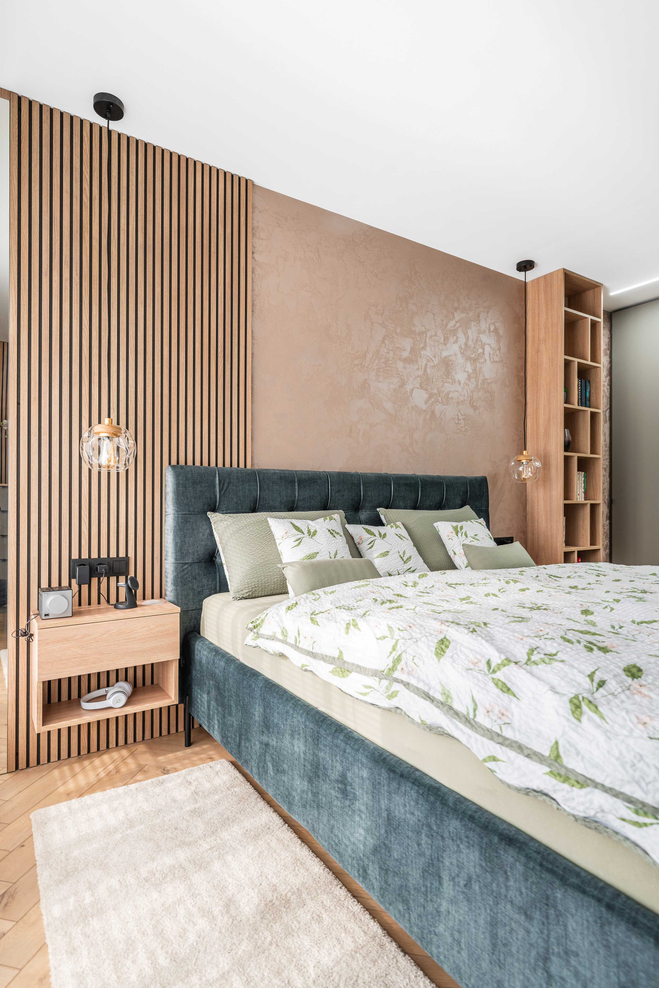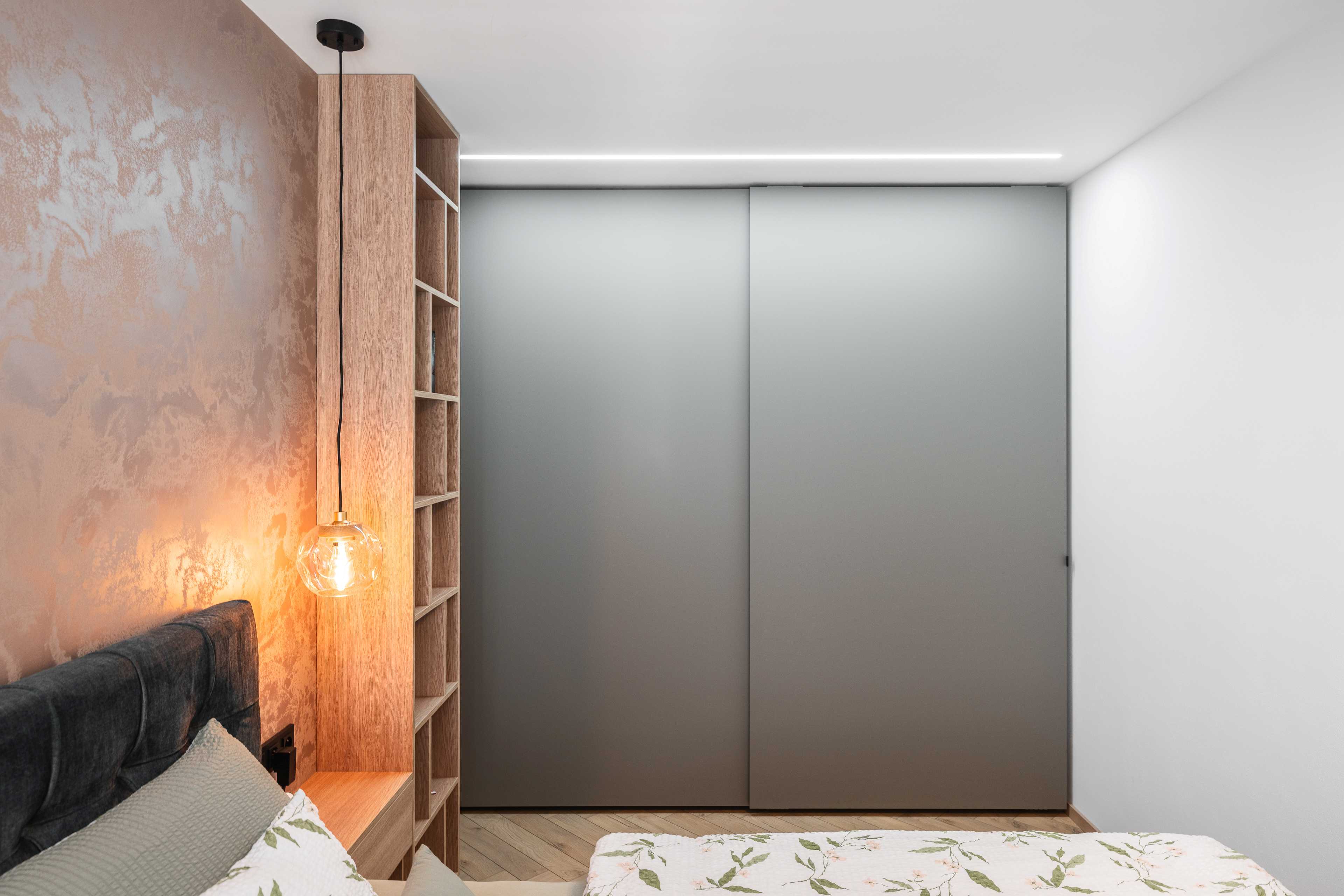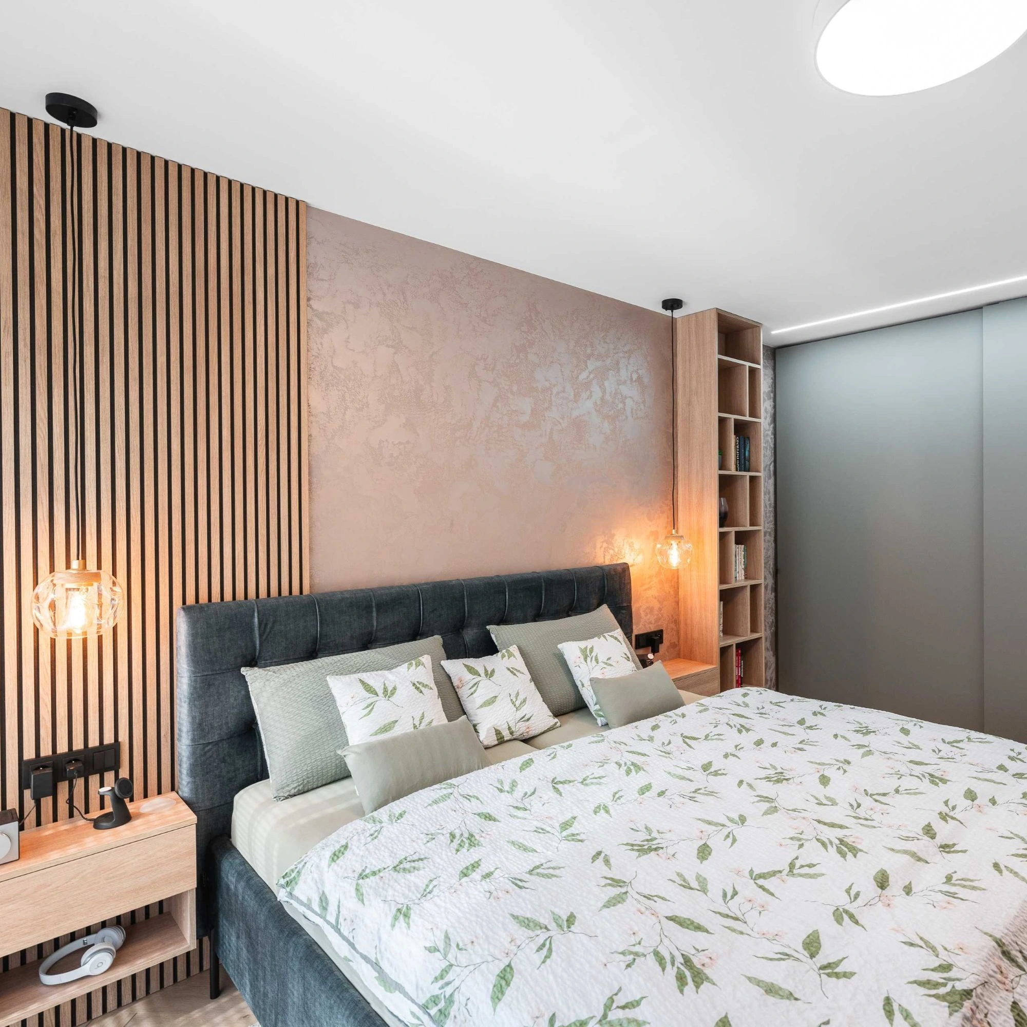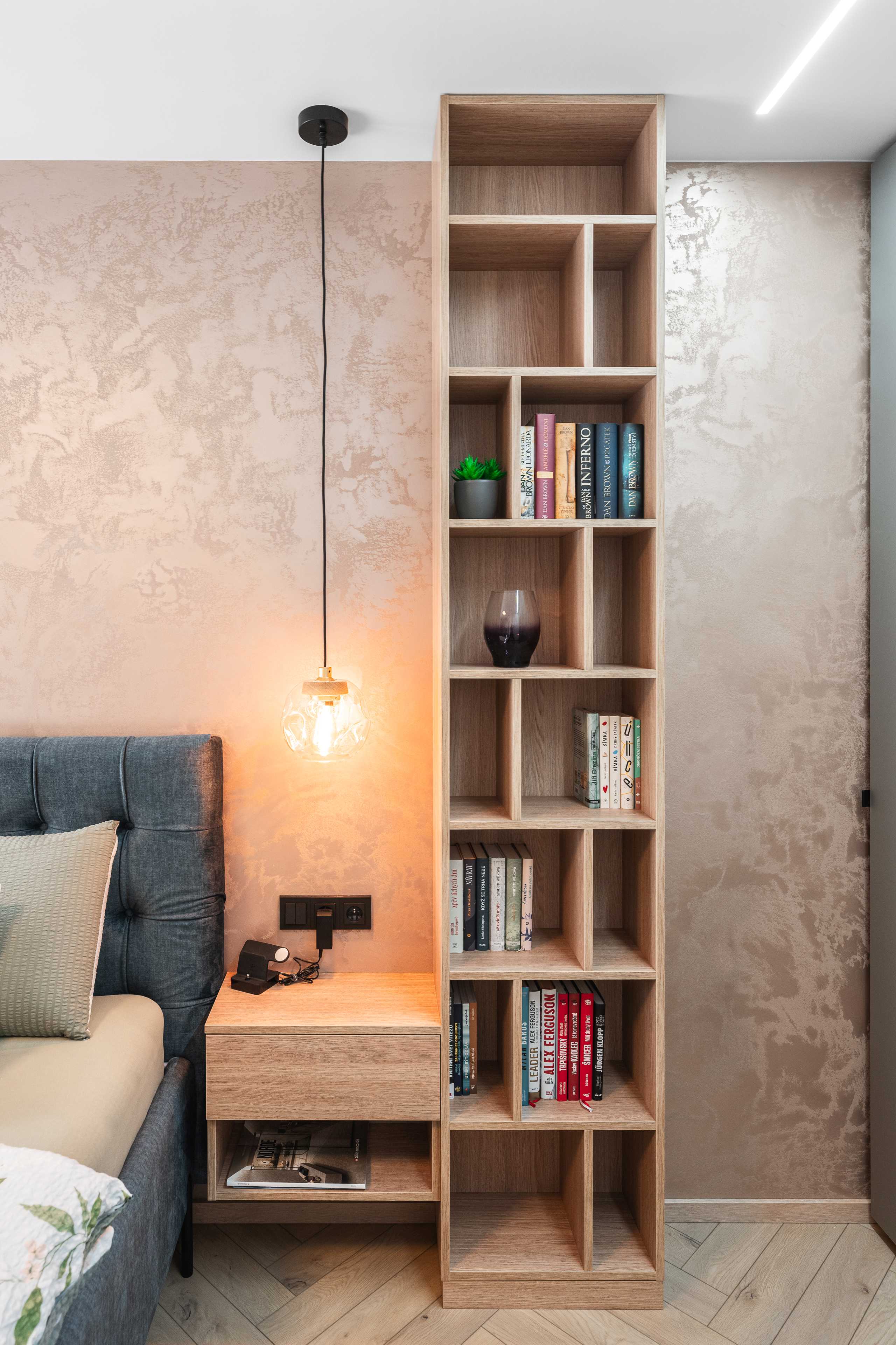 Svislé lamely s ohledem na akustiku. Komody, lamely, noční stolky, knihovna, postel. Veškerý nábytek byl vyráběný na zakázku, v kombinacích dřevodekoru a uni novinkové barvy s ochranou AFP proti otiskům prstů. Víc neprozradíme....