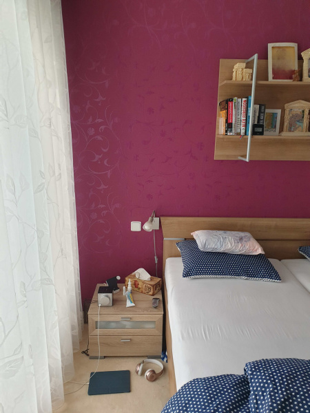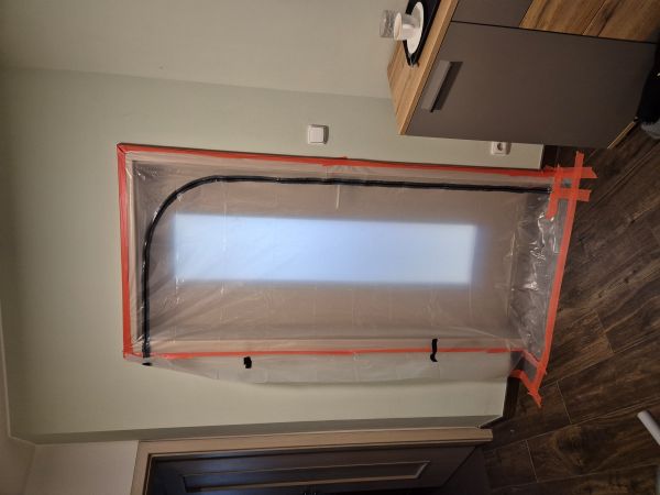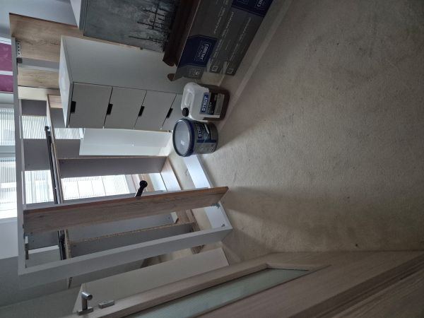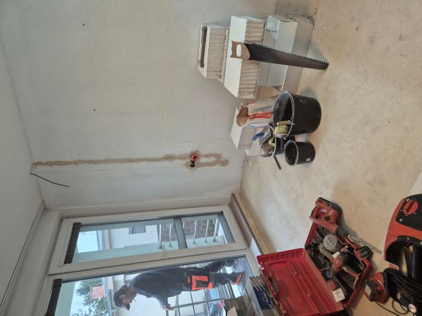 Takže z toho důvodu jsme po vyklizení a vystěhování nábytku, začali elektrikou. Nově jsme potřebovali vývody pro světla ve skříních, posunutí přisazeného stropního světla, umístění nového stropního liniového světla do prostoru před skříň, nových vývodů pro spuštění světel ze stropu nad noční stolky, nové zásuvky a vypínače. Následně jsme pokračovali stavebními pracemi, zbourání příčky, zapravením stropu a podlahy po této příčce a kompletně zapravení stěn po vedení kabeláže. Vždy je problém s vyschnutím povrchu, takže i přesto, že práce jsou třeba i rychle hotové, je nutno vždy přičíst čas pro vyschnutí podkladu. Sundání nalepeného koberce, vybroušení - odstranění lepidla.