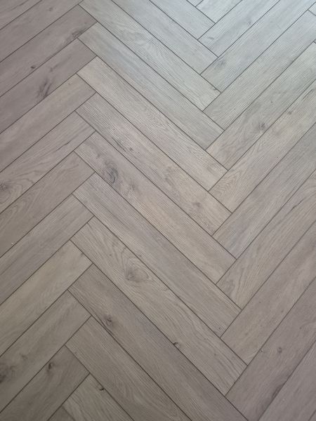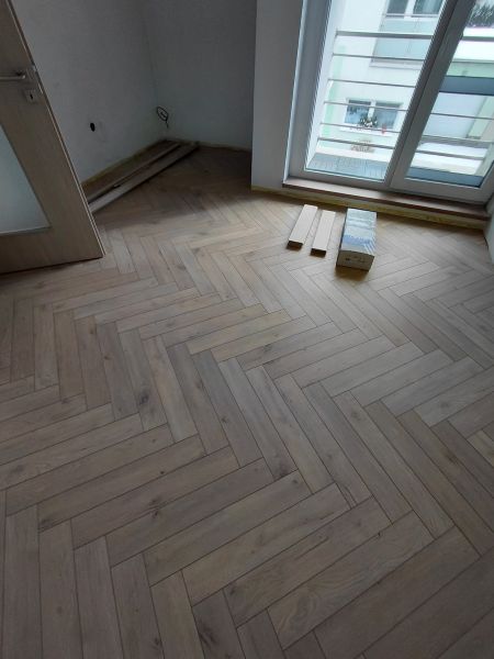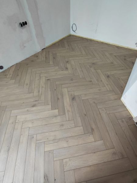 Položení nové vinylové podlahy, v tomto případě v designu dekoru rybí kost.