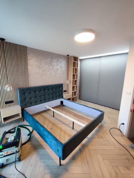 Začali jsme vystěhováním stávajícího nábytku. V ložnici jsme potřebovali zrušit stávající příčku, která v ložnici byla, ale i přesunout elektroinstalace a zapravit stěny po jejich přesekání.