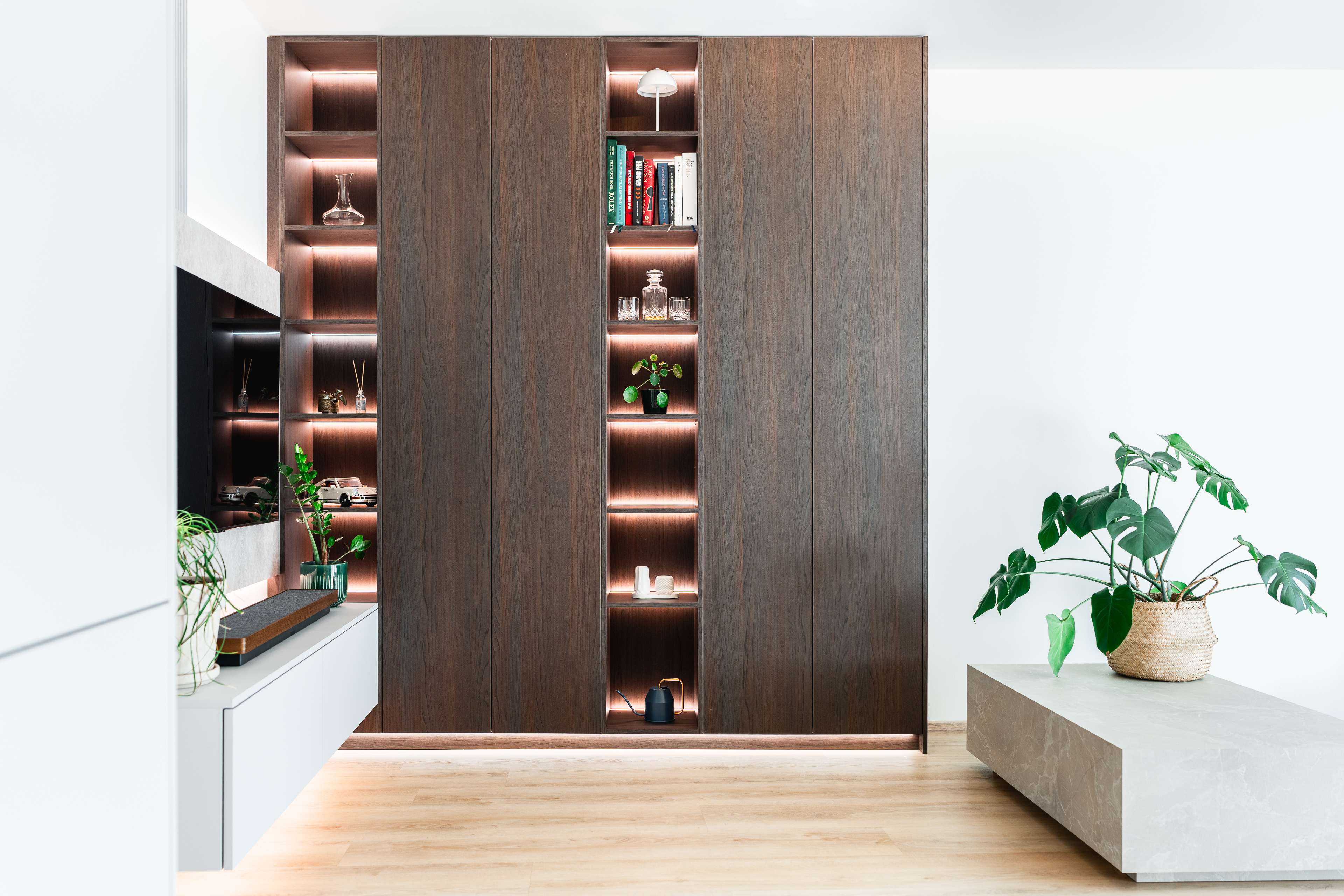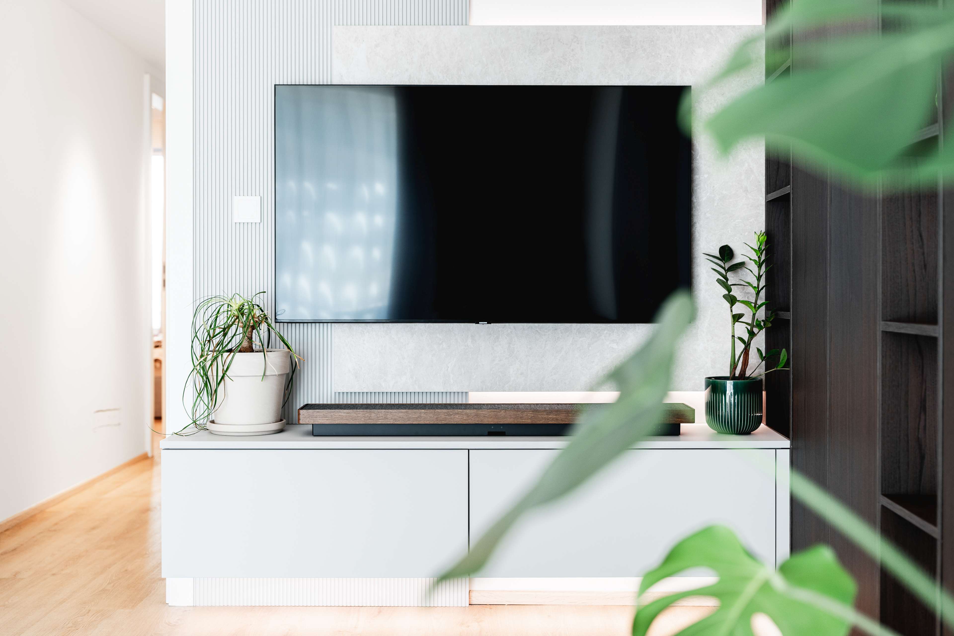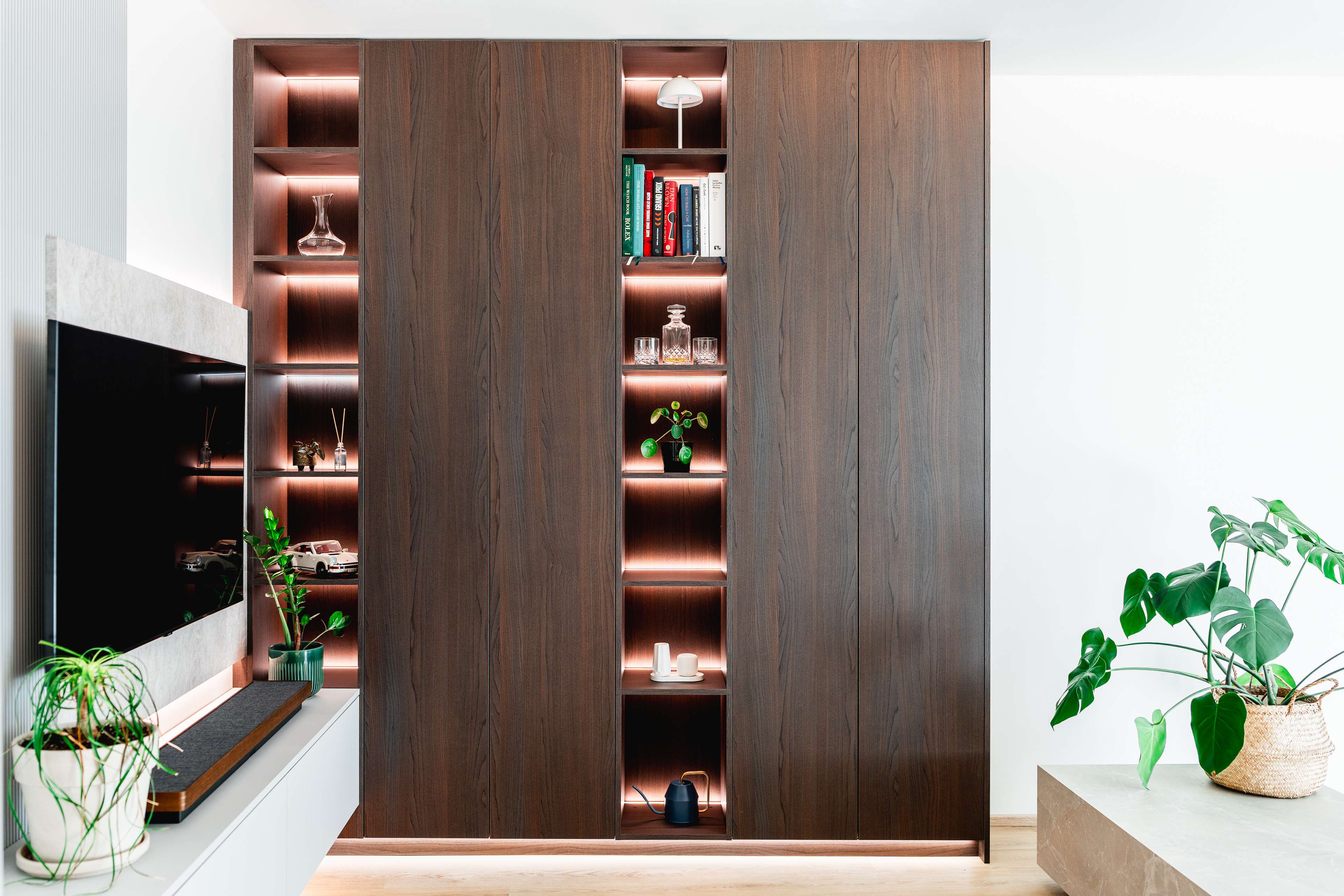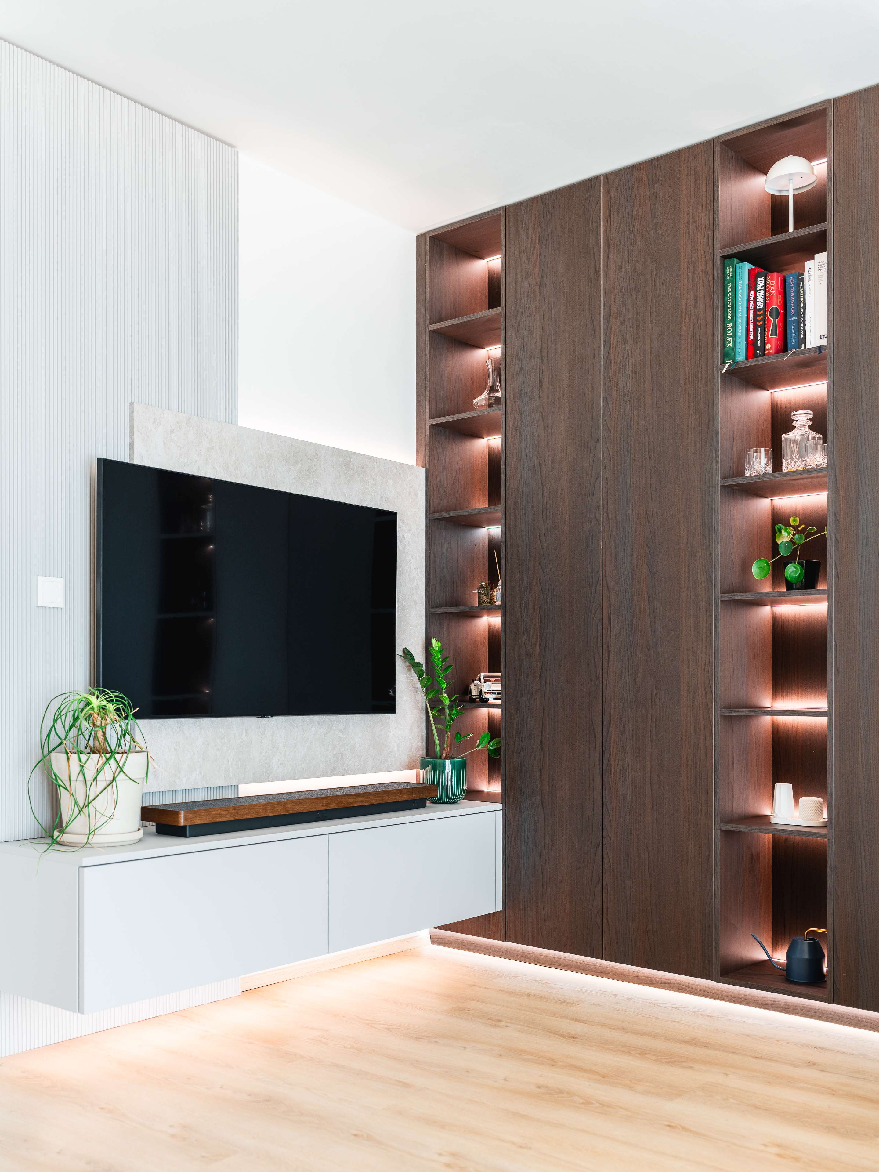 V obývákové části jsou všechny otevřené policové skříňky prosvětlené zadním LED profilem. TV sestava je atraktivně seskládaná tak, abychom skryli a zapustili závěsný stojan pro televizi a bylo možné protáhnout veškerou kabeláž.