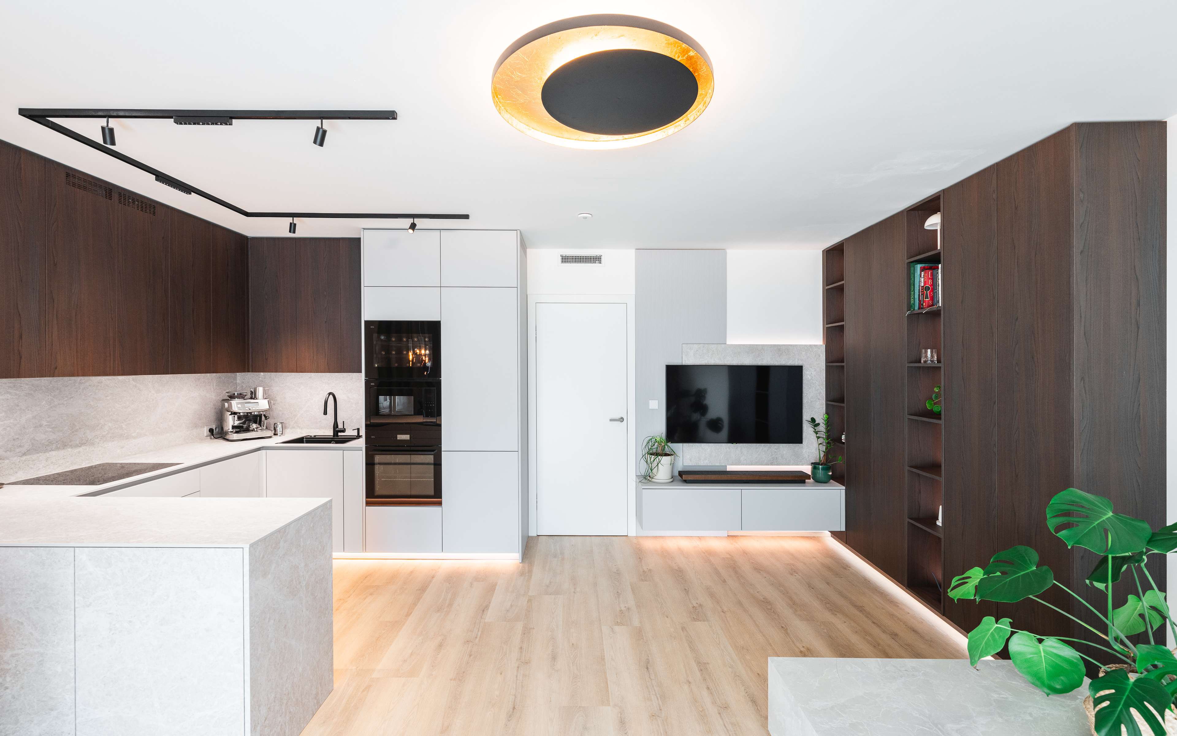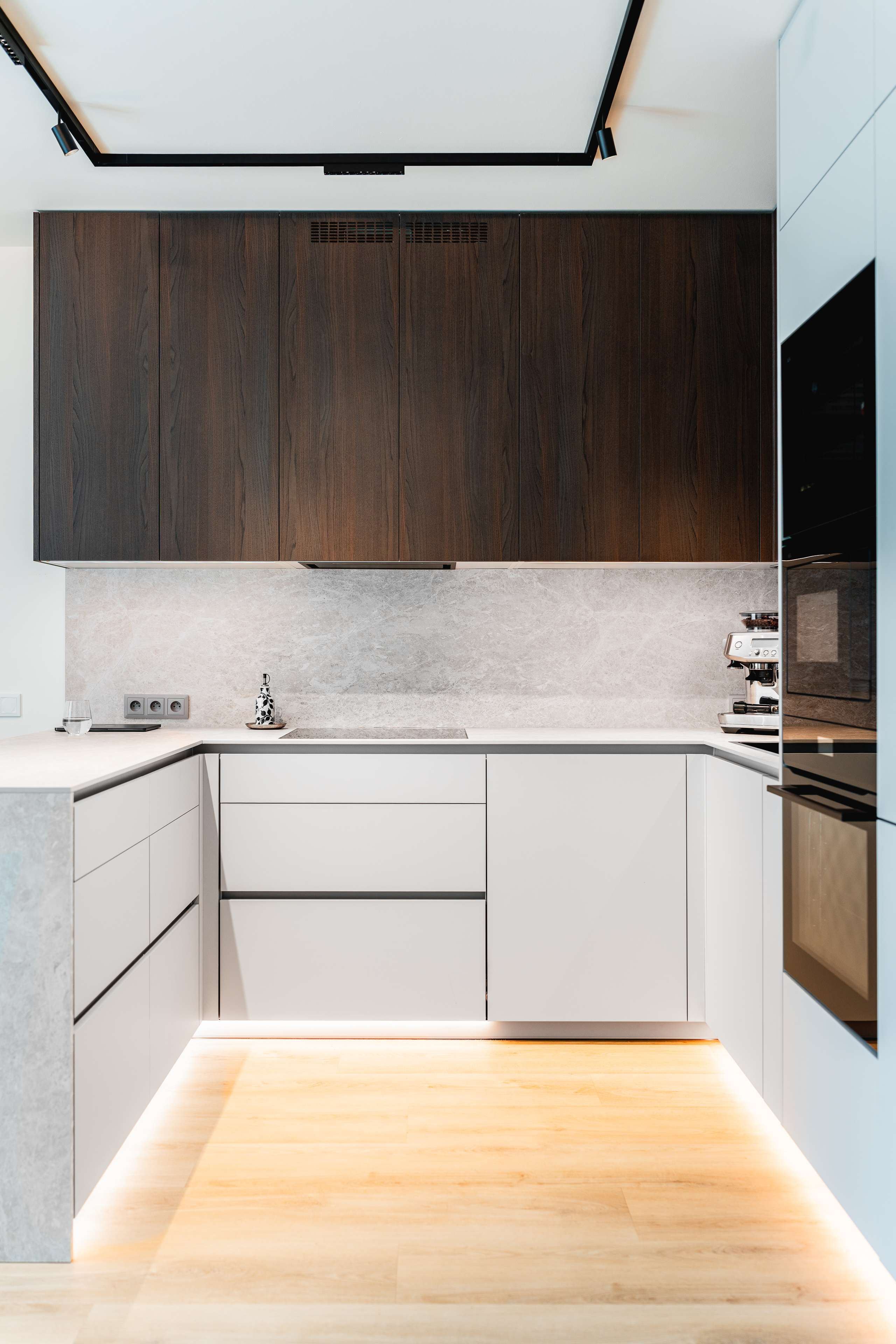 V prostoru kuchyně a obýváku jsme potřebovali sjednotit výšky. Chtěli jsme co nejnižší výšku soklové lišty. Byli jsme ale limitováni výškou myčky a tím, že jsme chtěli soklové lišty kuchyně a obýváku osvítit, museli jsme zvolit výšku soklové lišty 70 mm s LED osvětlením.