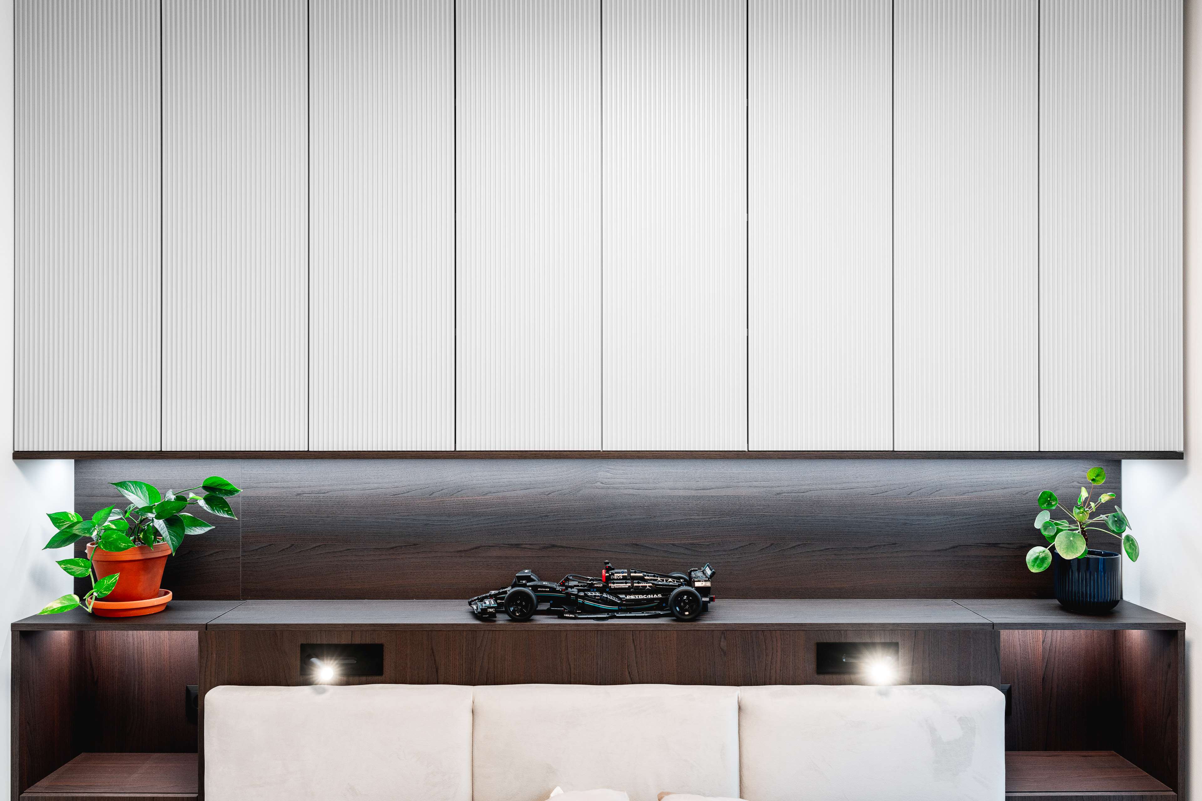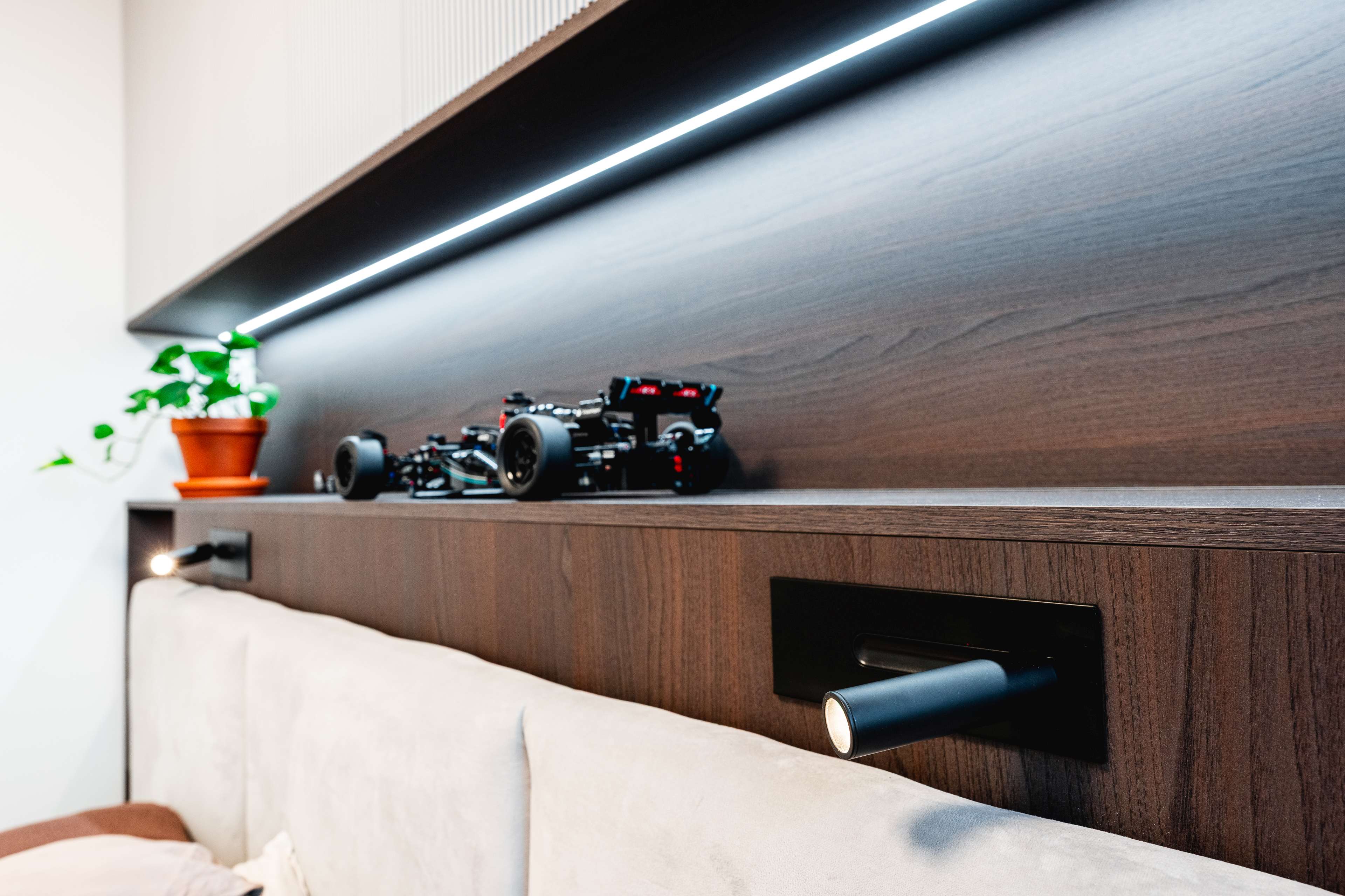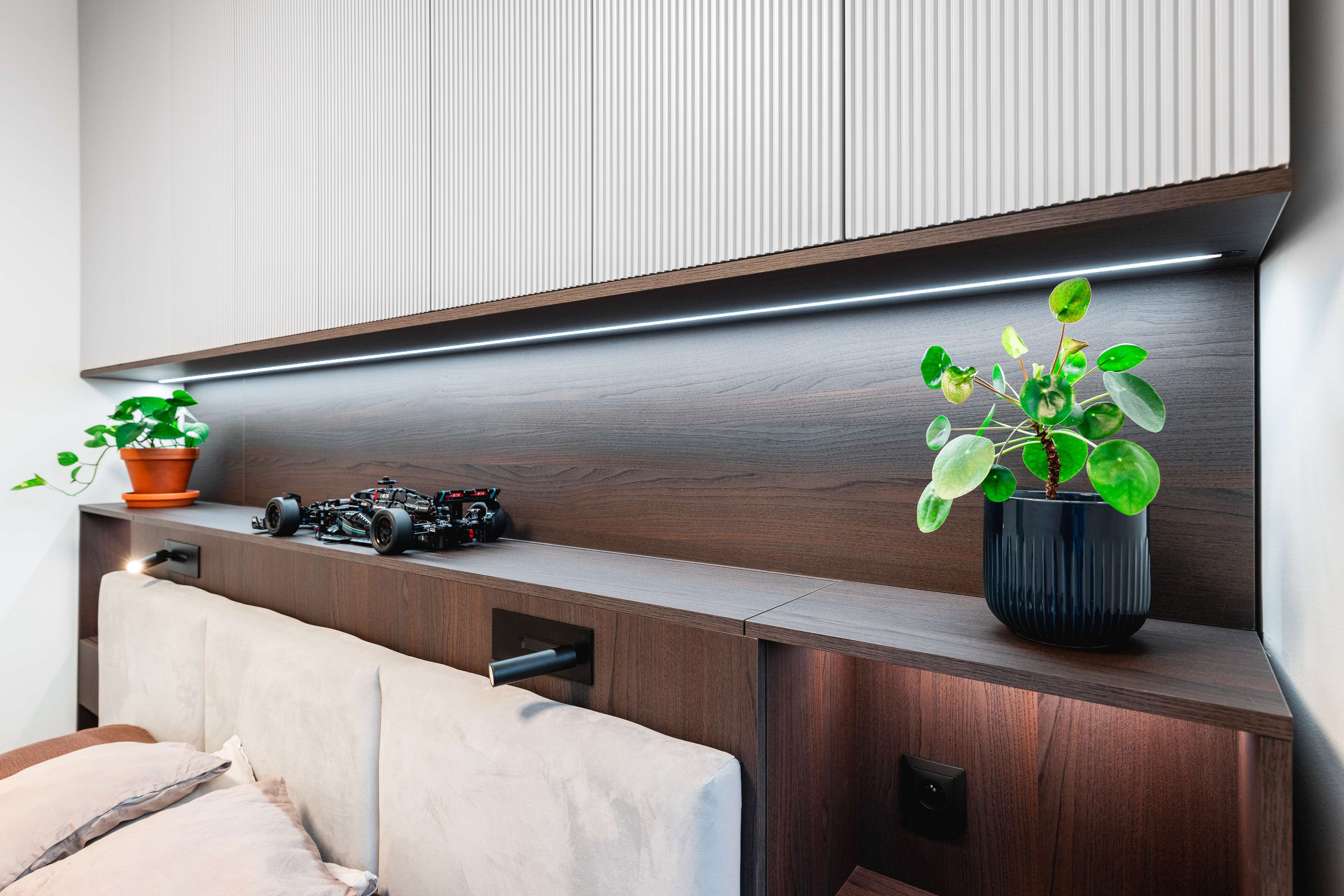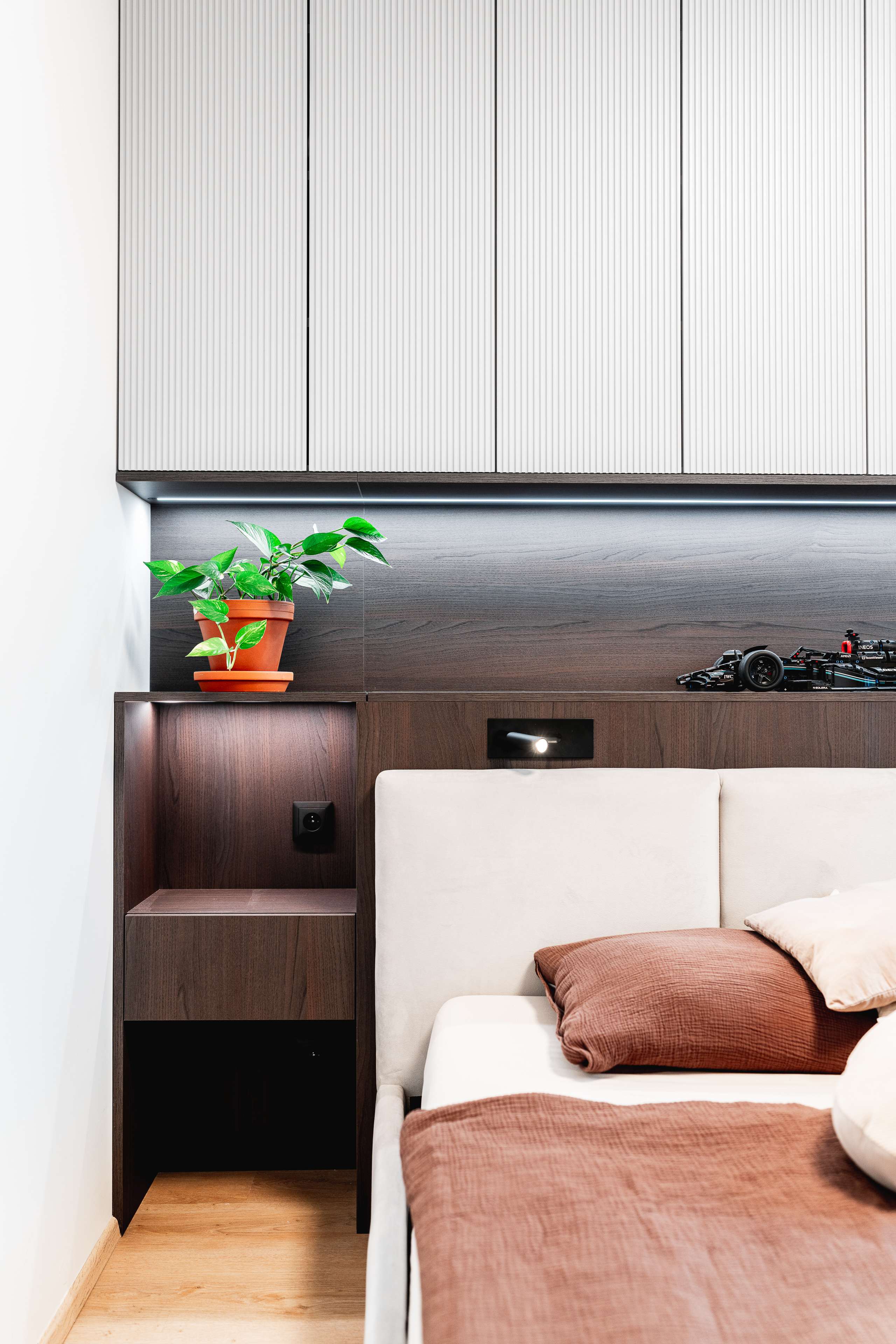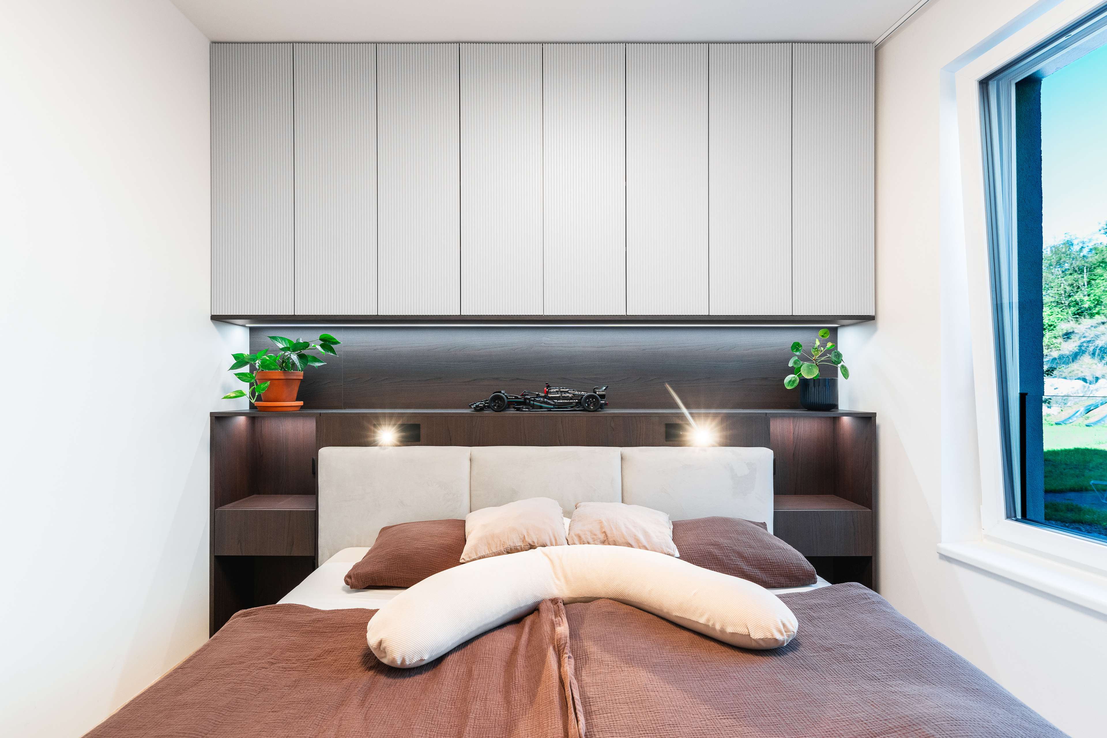 Naložený bok skříně překrývá i bok stěny, vypadá to sjednoceně a plynule nám přechází nábytek do prostoru ložnice. S ohledem na velikost místnosti klienti zvolili pouze sestavu skříněk za postelí. Postel je k sestavě pouze přisunutá, ale i tento prostor je využitý, nyní u našich klientů velmi žádanými peřináči.