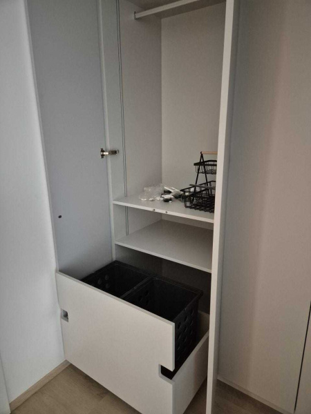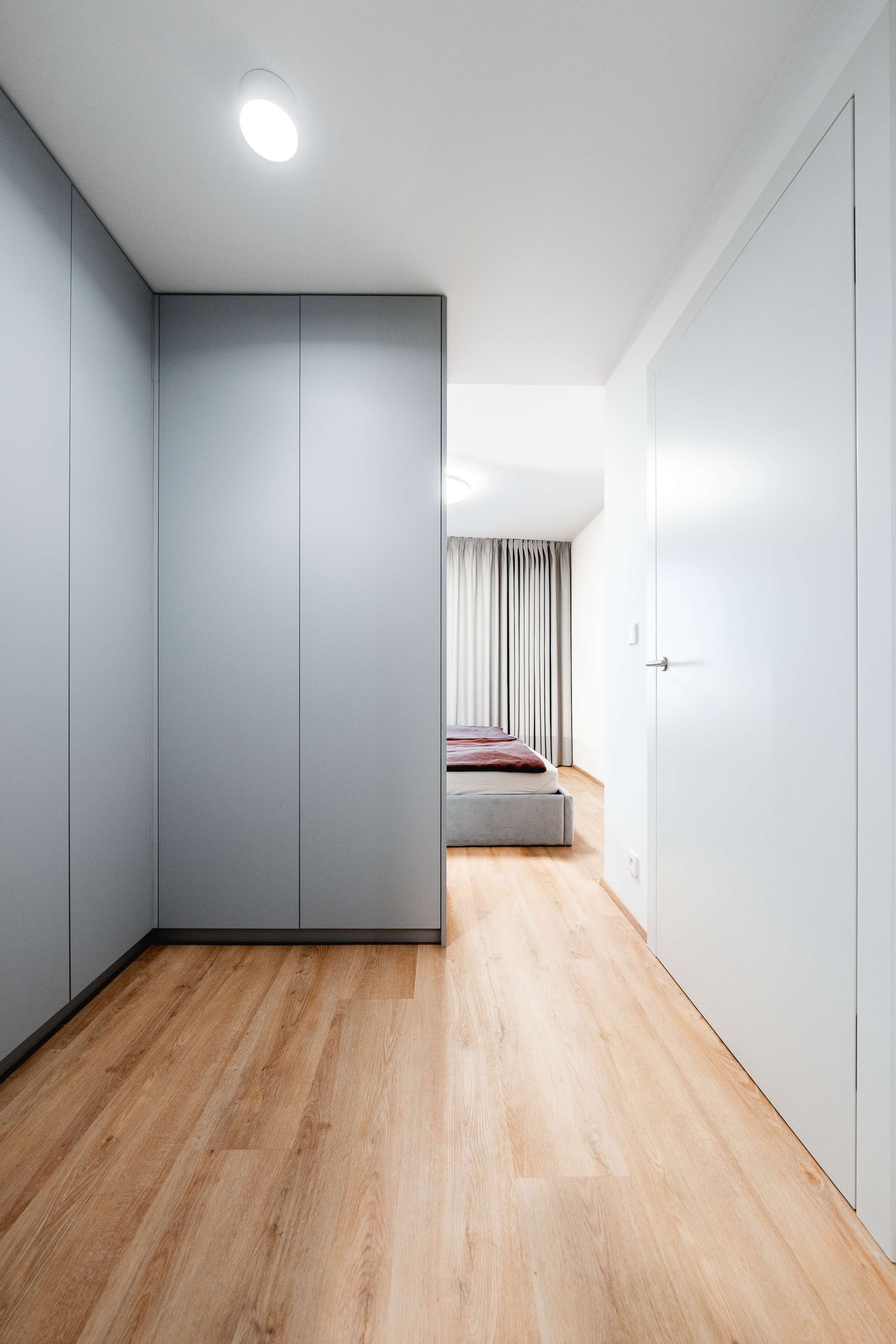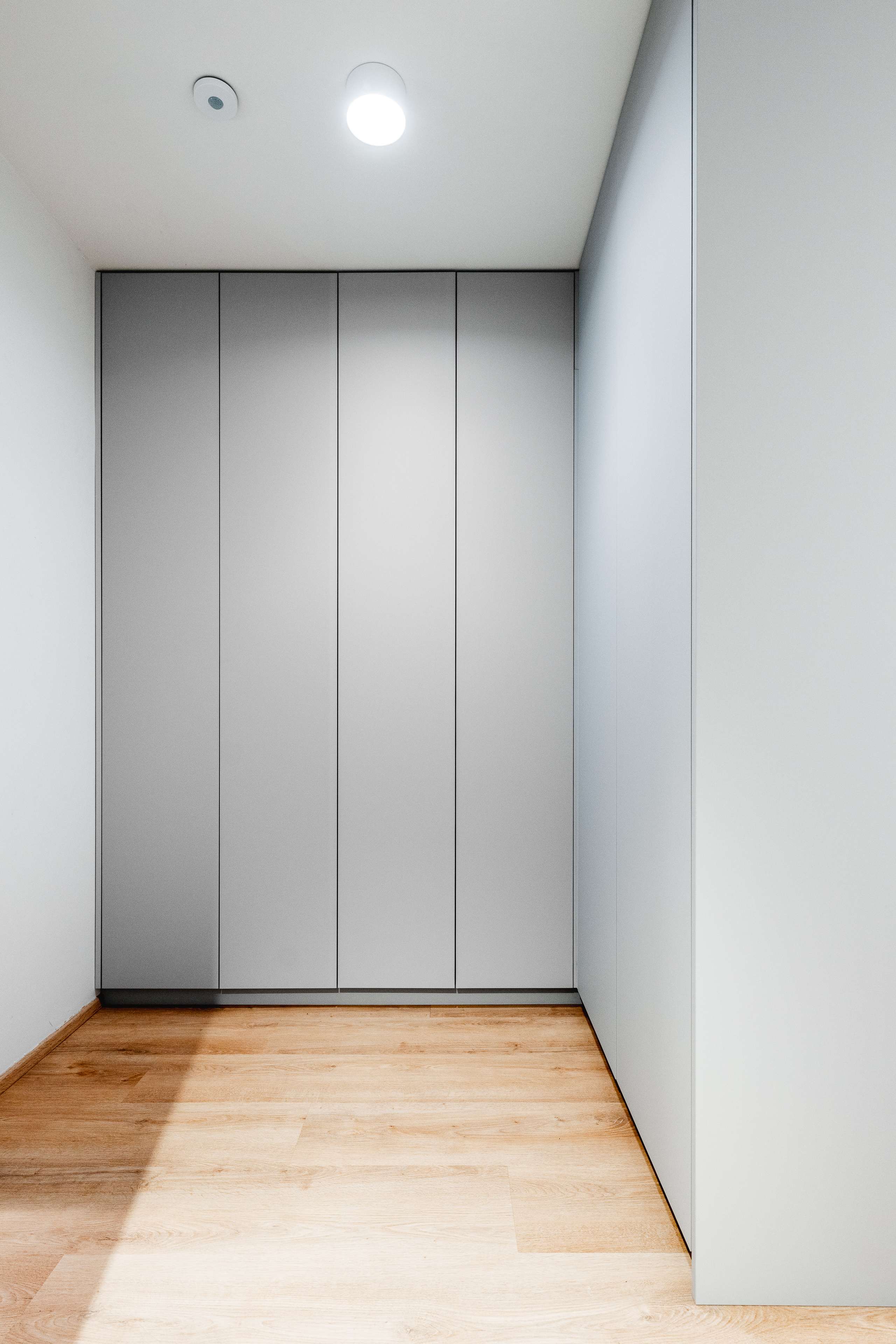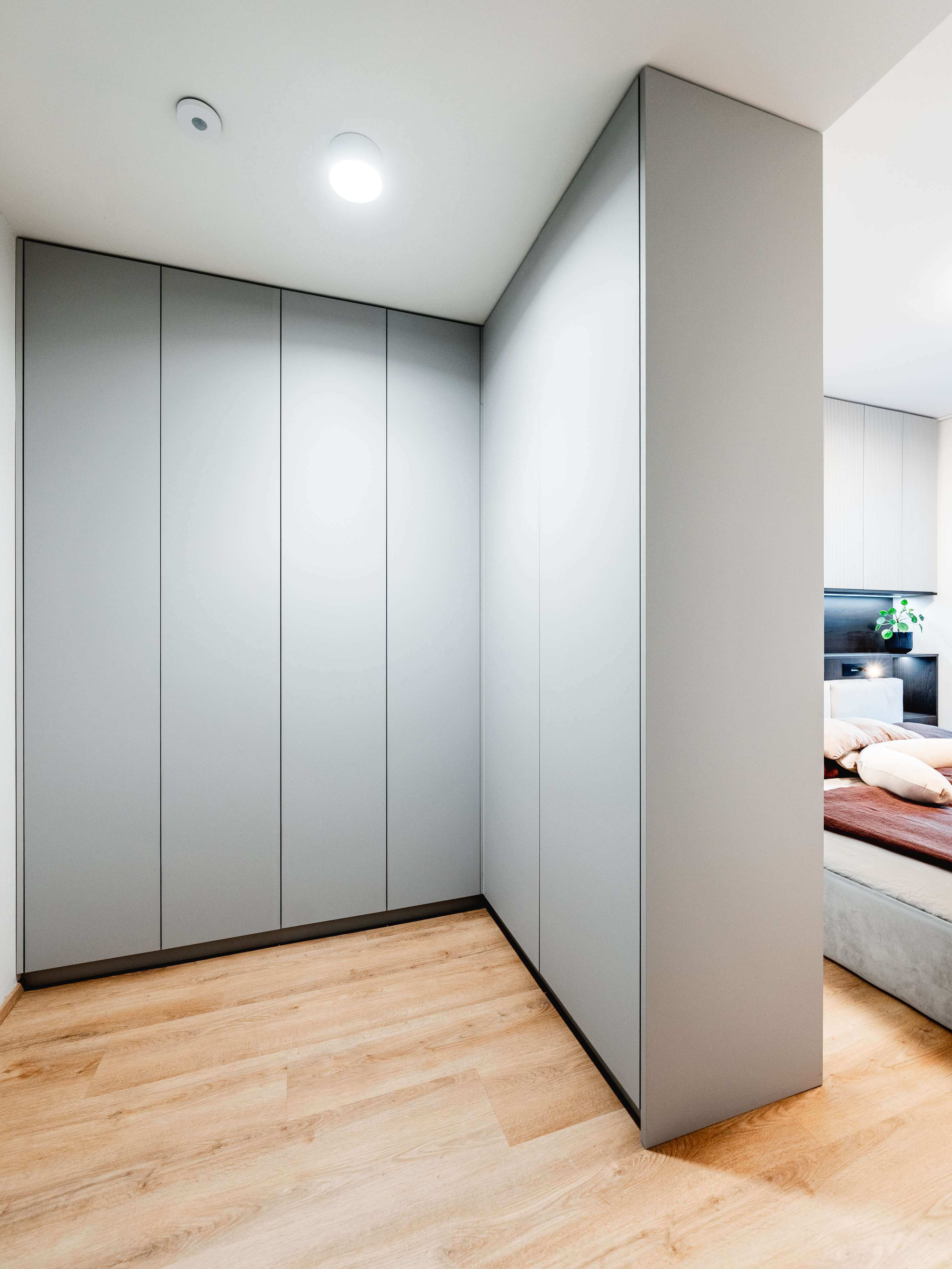 Tuto výšku jsme ponechali i v prostoru šatny. Tím, že je šatna průchozí, do ložnice a do koupelny, prostory šatny jsou uzavřené bezúchytkovými otevíracími dvířky na Tip On. Skříně mají vnitřní boční profily s osvětlením. V levé skříni ve spodní části je umístěn výsuv s koši na špinavé prádlo, v pravé jsou vnitřní šuplíky.