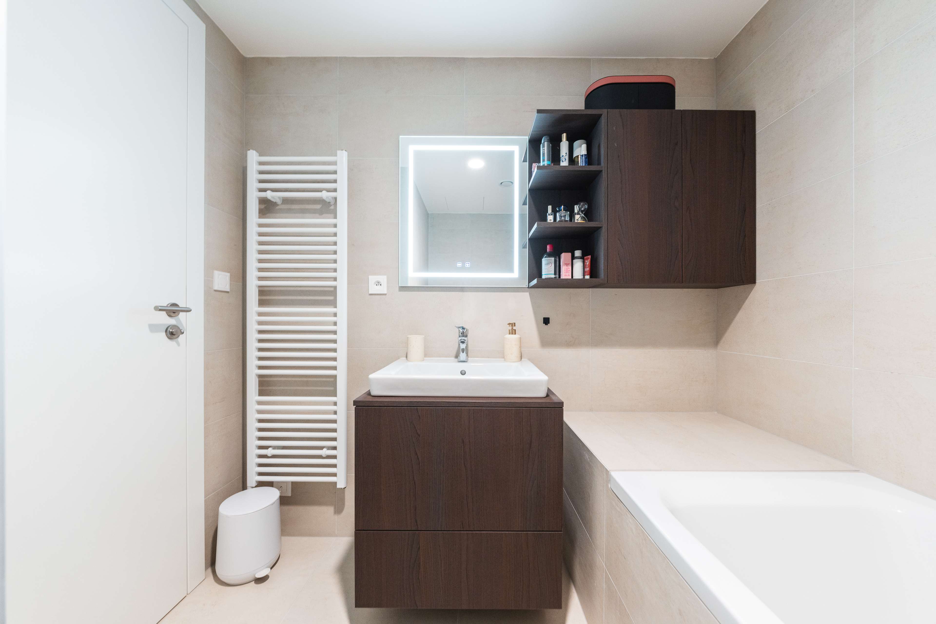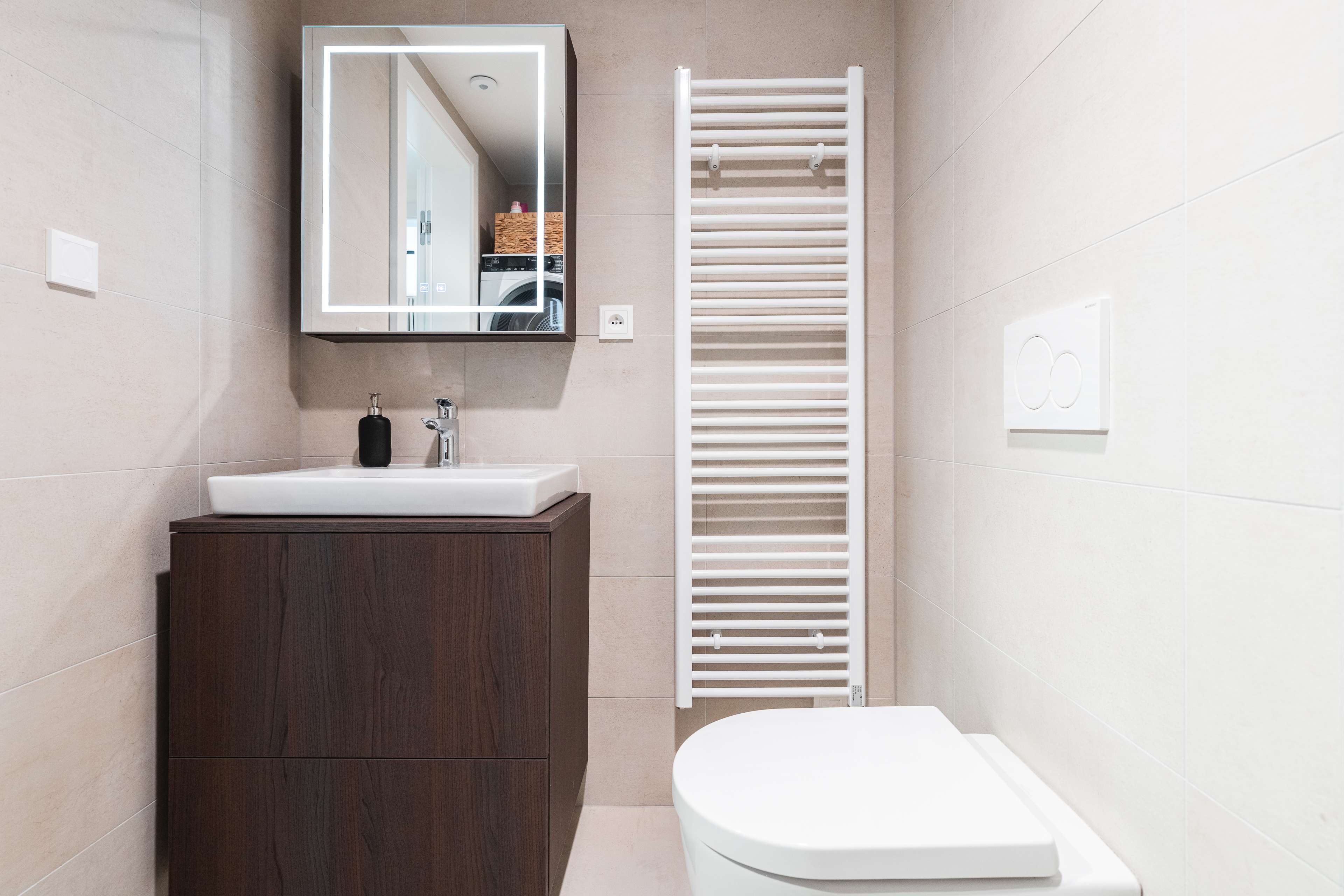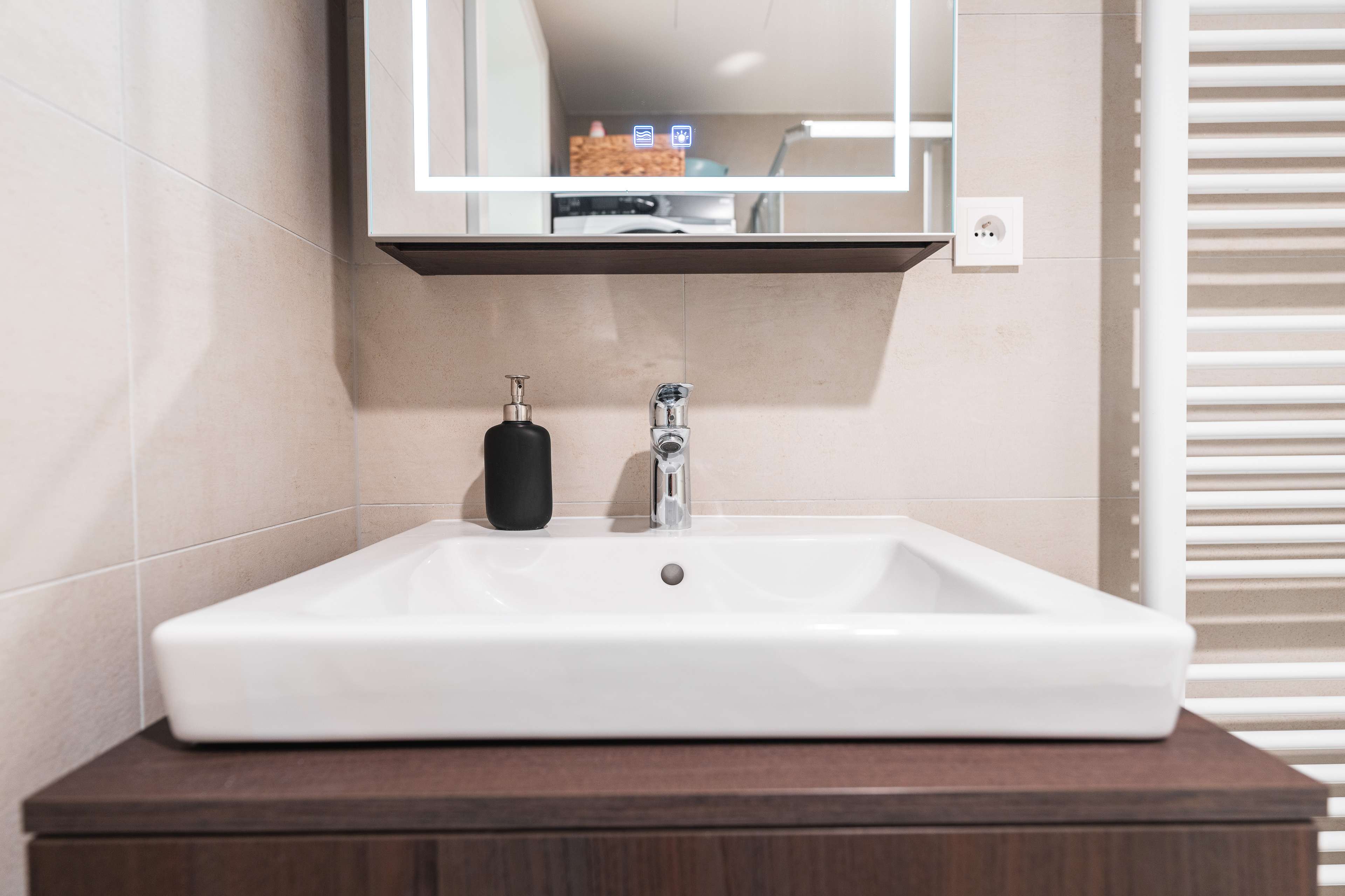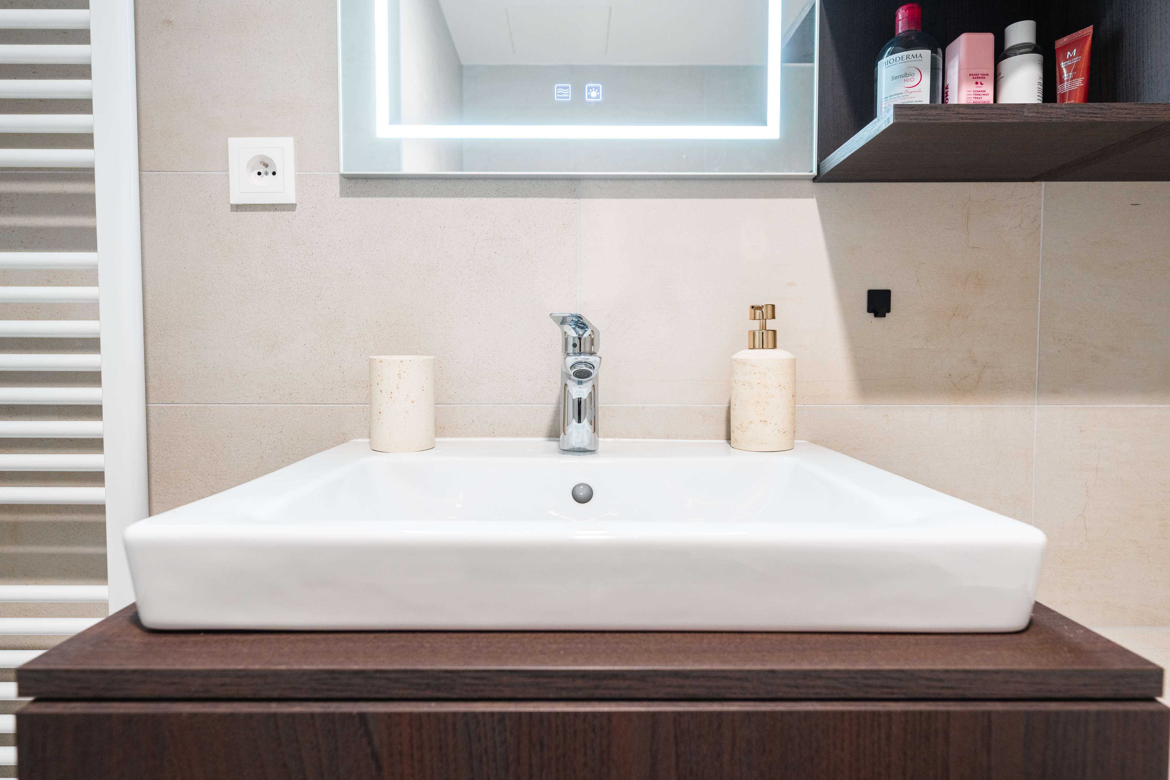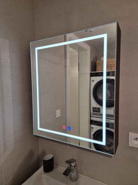 Zrcadlo s funkcí integrovaného LED osvětlení, s nastavitelnou intenzitou světla, ochranou proti zamlžení, s dotykovým ovládáním na zrcadle. Obě zrcadla byla vyrobena na míru. V menší koupelně jsou zrcadlová dvířka otevíravá s vnitřním úložným prostorem.