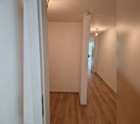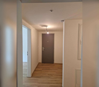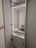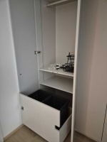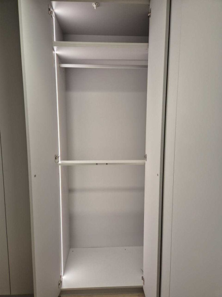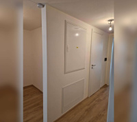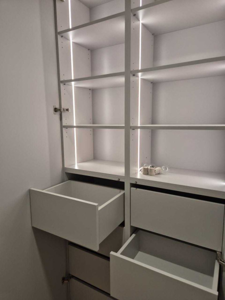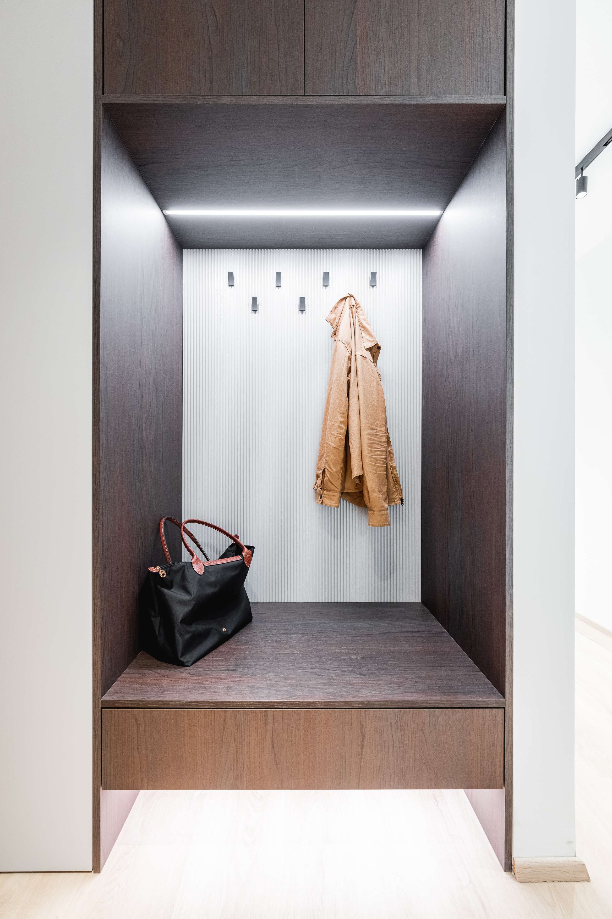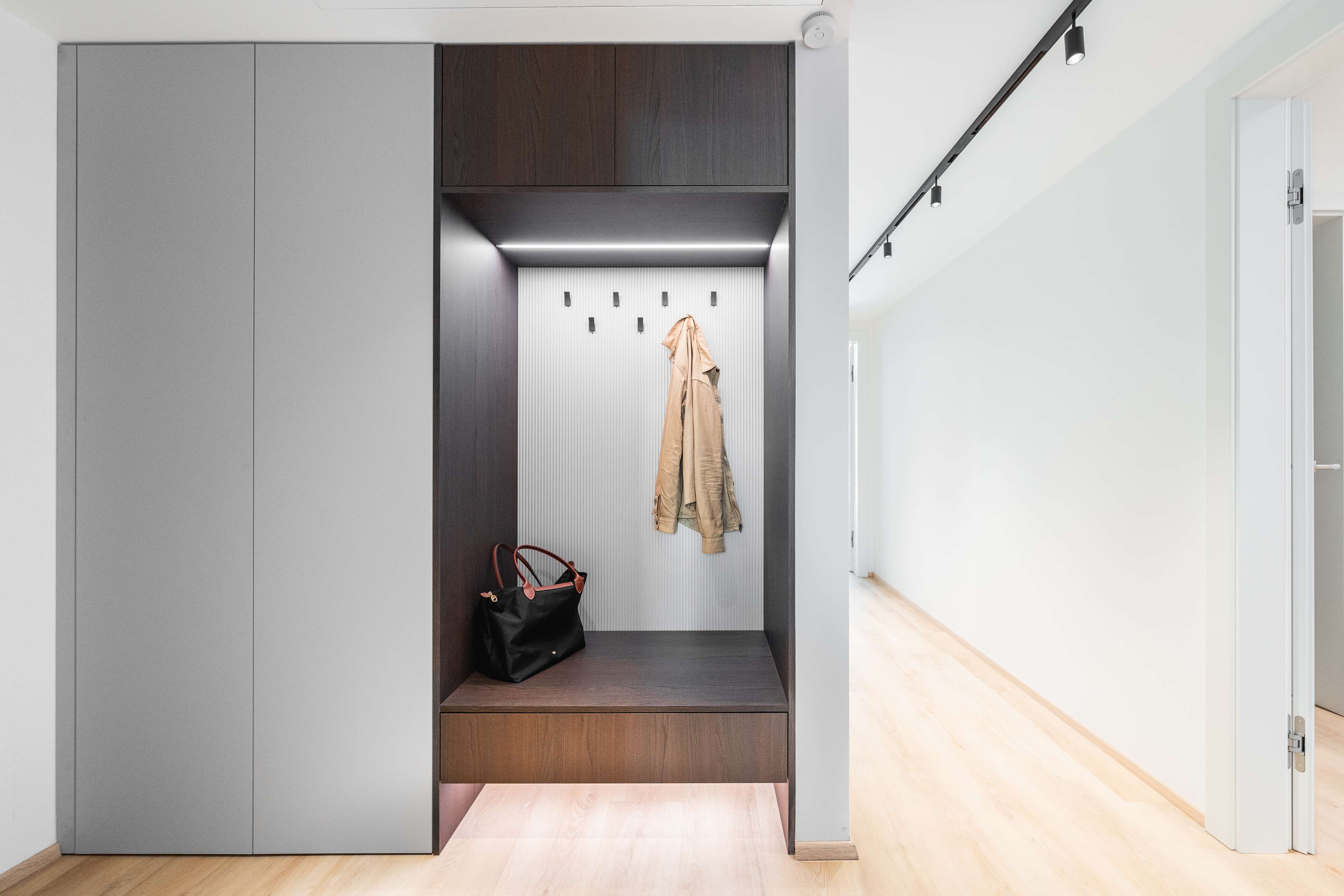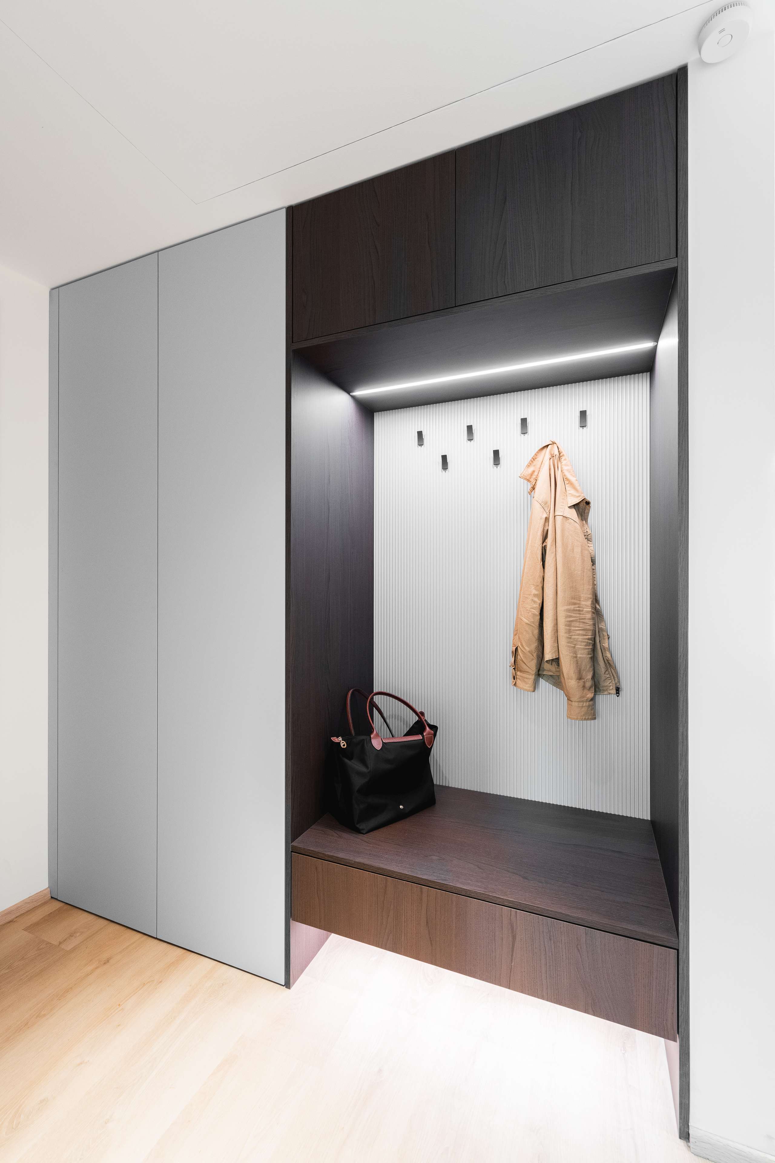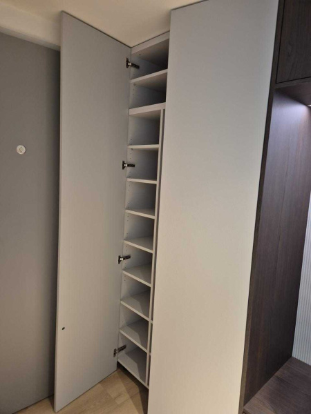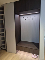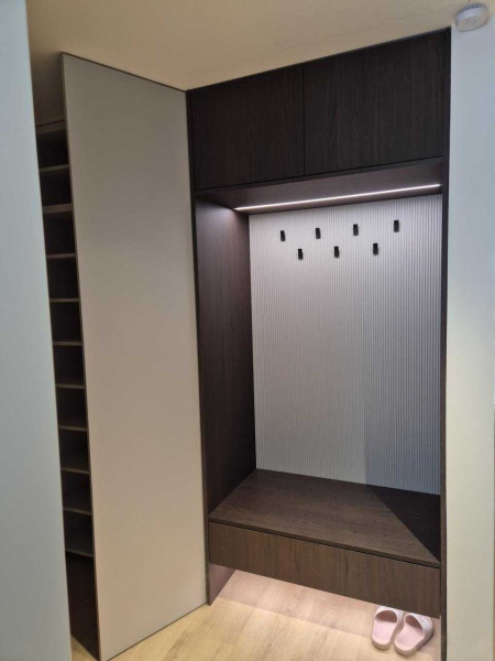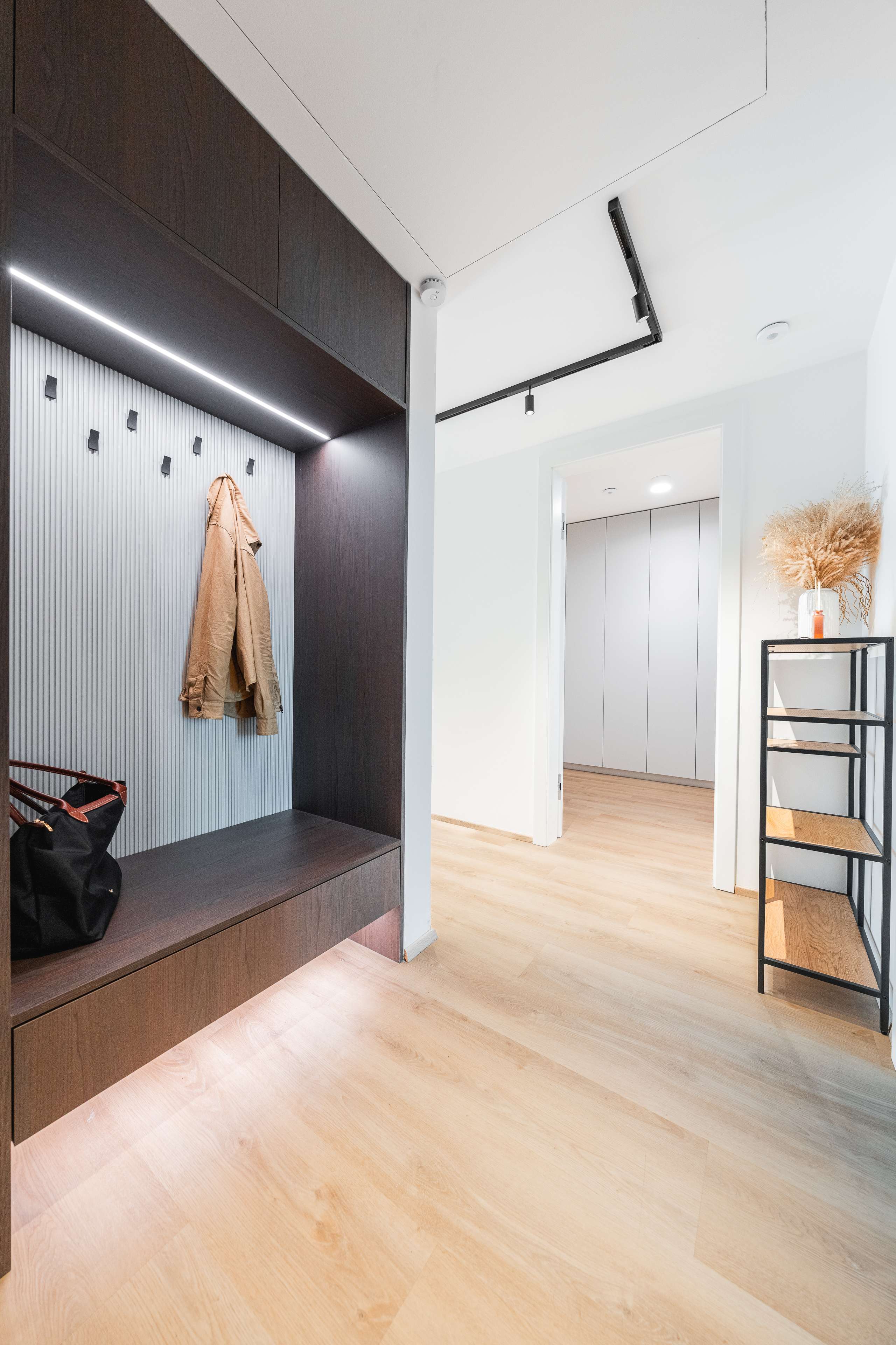 Při vstupu do bytu byl po levé straně připraven prostor pro předsíňovou sestavu. Do tohoto prostoru délky 2 m se krásně vešla vysoká skříň s otevíravými dveřmi s množstvím polic na boty a s tyčí na zavěšení kabátů. Prostor pro sednutí s výsuvnými šuplíky a podsvíceným prostorem dolů k zemi pro odložení botů, zadní obkladová lakovaná MDF opět se strukturovaným povrchem s věšáčky pro zavěšení kabátů.