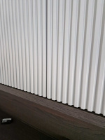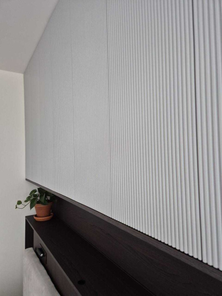 Tato jednolitost a čistota je v každé místnosti jemně narušena obkladem nebo dvířky z lakované MDF v odstínu dekoru Fenix - světle šedá, s profilovanou strukturou na předních plochách. Struktura je svislá, velmi jemná a velmi efektní. Je to jemné 4 mm drážkování.