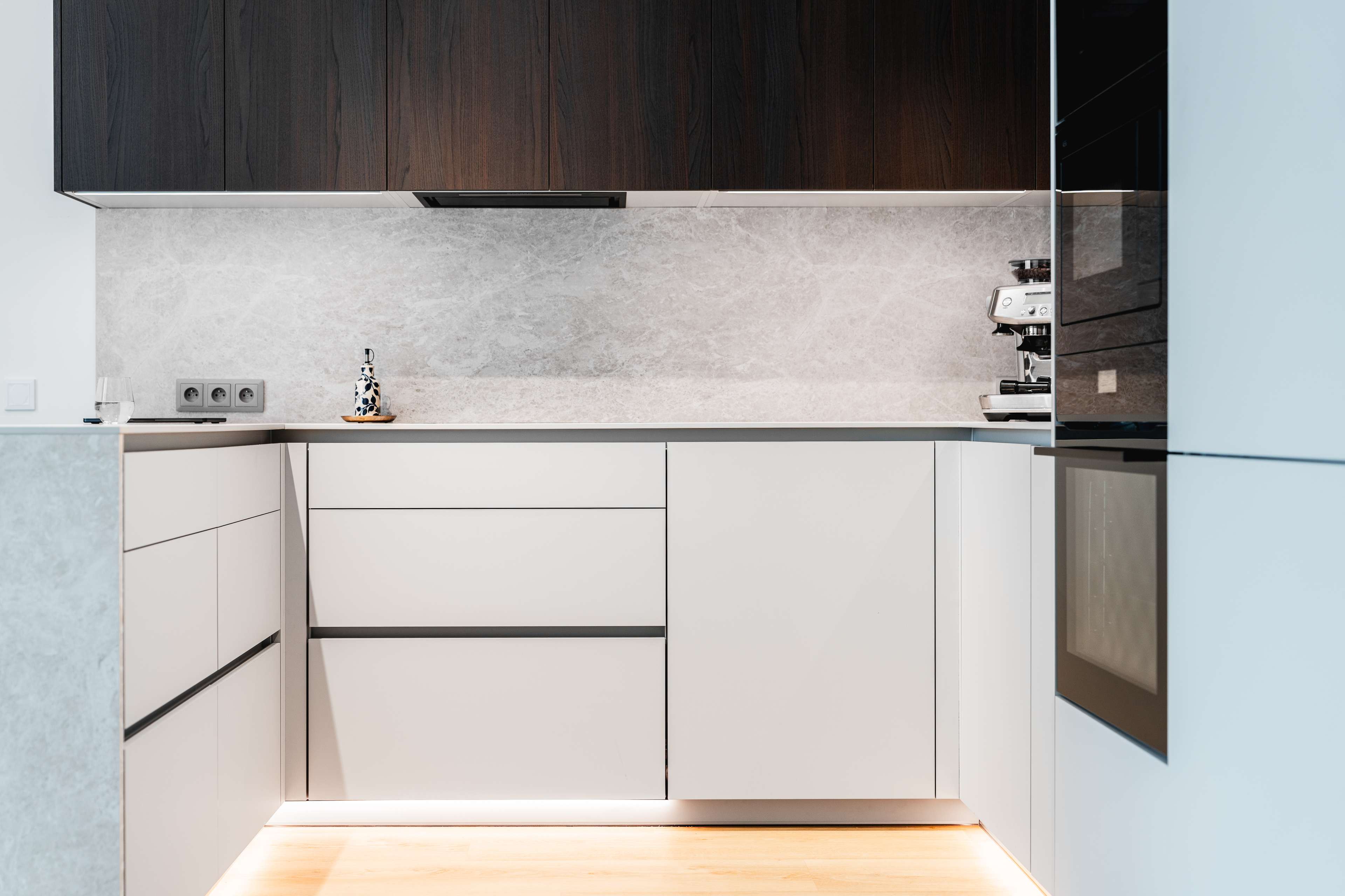 V prostoru kuchyně a obýváku jsme systém otevírání nakombinovali. U horních skříněk kuchyně jsou ve dnech zabudované úchytkové kovové profily s LED osvětlením a zároveň se tak dají jednoduše otevírat dvířka. U sestavy vysokých skříní pro spotřebiče jsme zvolili kombinaci servodrive a mechanických Tip On.