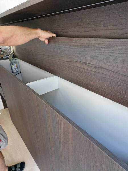 Nahoře s hlubokým nádstavcem se zafrézovaným led osvětlením, opět jako plnohodnotný úložný prostor. Dvířka otevíravá na mechanický Tip-On. Tím, že se nám v předsíni na stěně otevírá úhel, který jsme blendovali, bylo možné udělat dvířka dle přání klientů 5 mm od stropu a 5 mm od země.