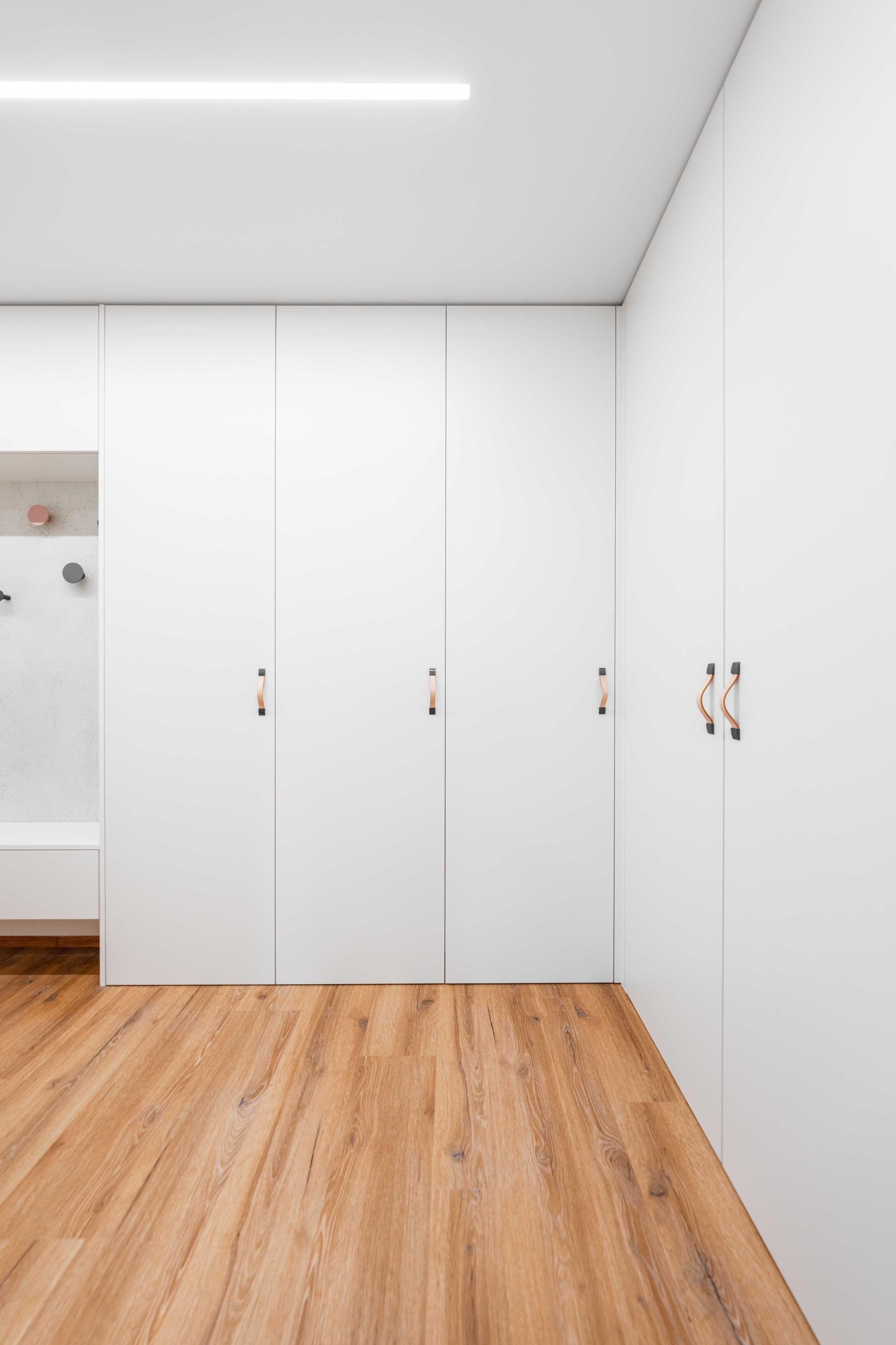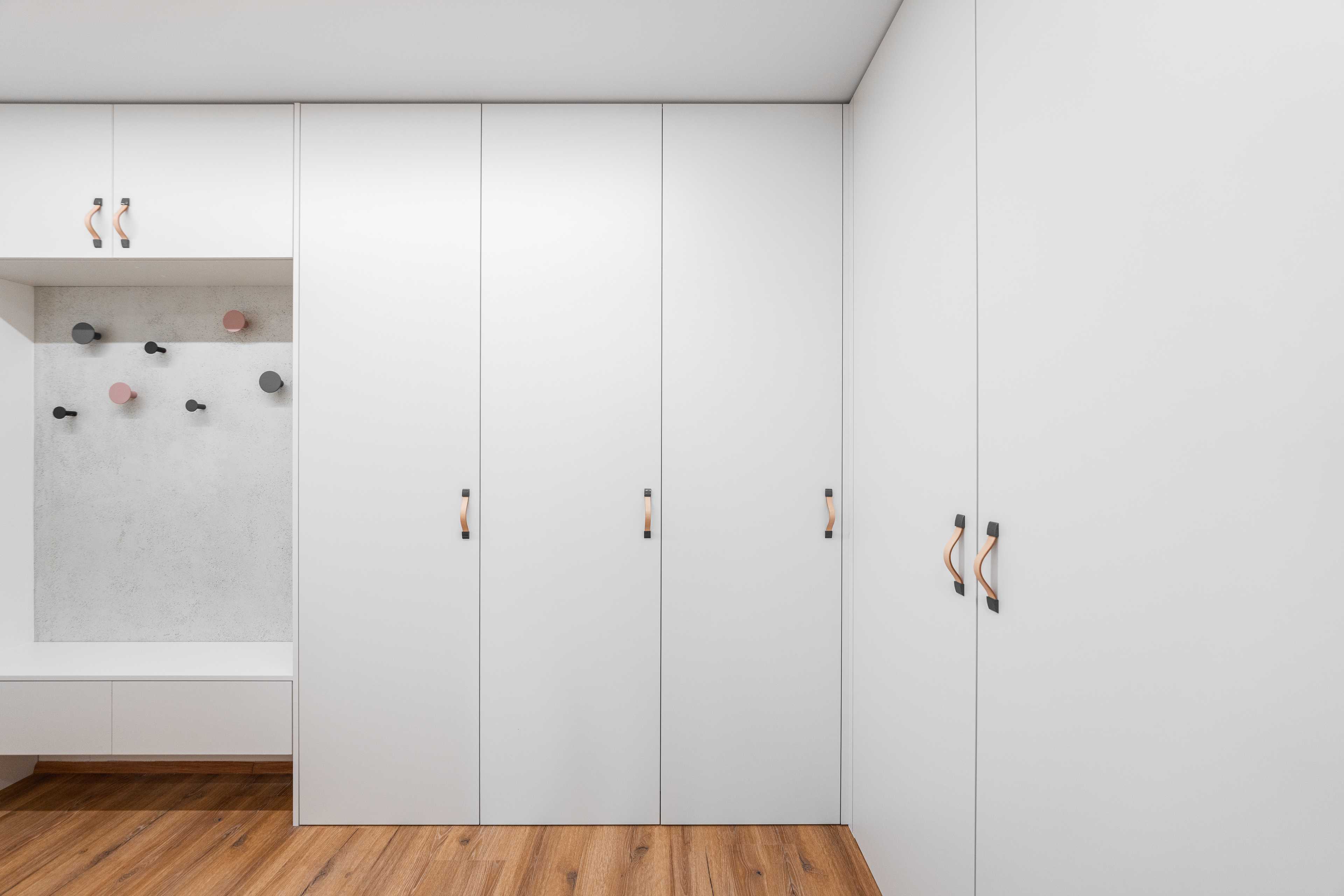 Dvířka laděné do odstínu mušlové jsou u vysoké sestavy otevíravé, pouze 5 mm odskočené od podlahy, 7 mm od stropu. Chtěli jsme s ohledem na snížený podhled co nejvyšší dvířka, abychom prostor na výšku opticky protáhli a zvýšili.