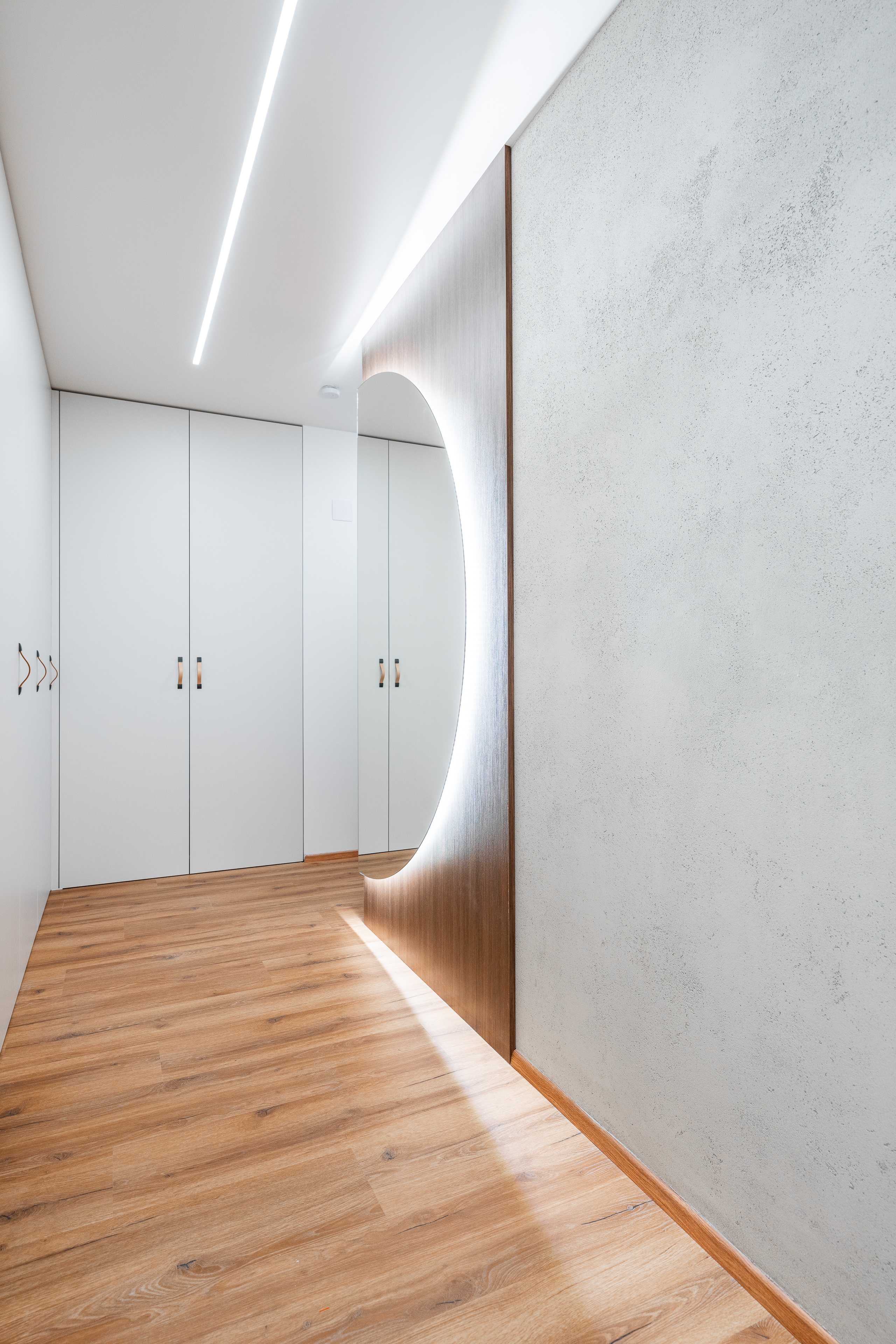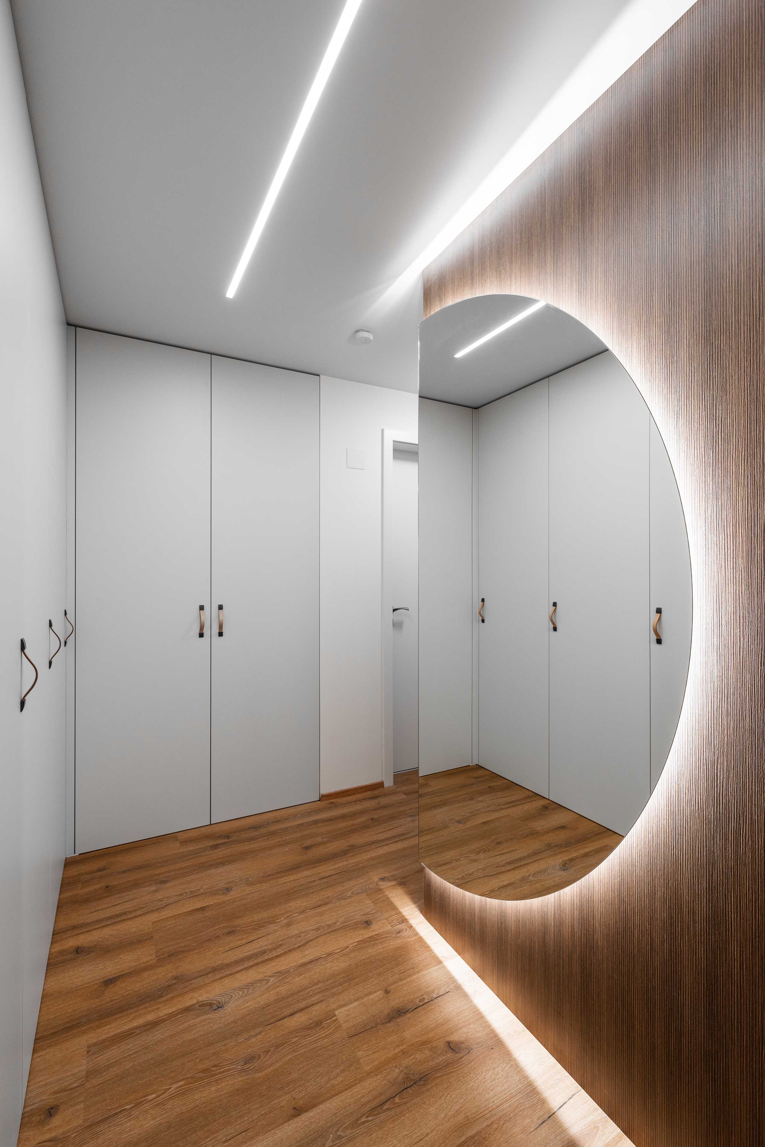 Nábytek v předsíni jsme vyráběli na zakázku, vč. podsvíceného 2 m vysokého zrcadla. Obkladová deska pod tímto zrcadlem je od Schüller a je to shodný materiál, který je použitý na zádech ostrůvku a vysokých skříních v kuchyni.
