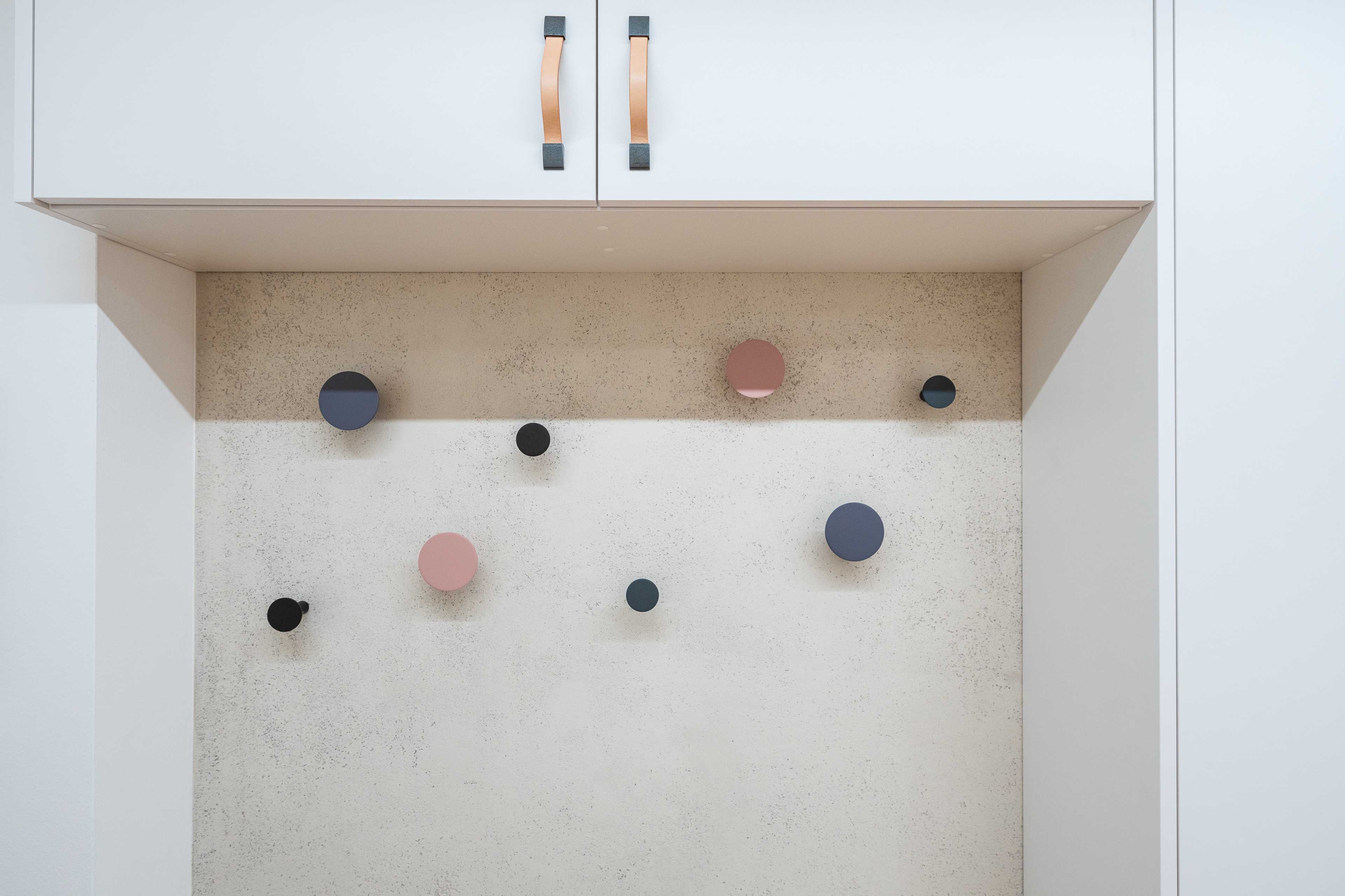 Na stěně s věšáčky a při vstupu do bytu máme na stěně na míru laděný odstín dekorační betonové stěrky, zalakované, kvůli vyšší odolnosti vůči vlhkosti a snadné údržbě. A je krásná!! :)