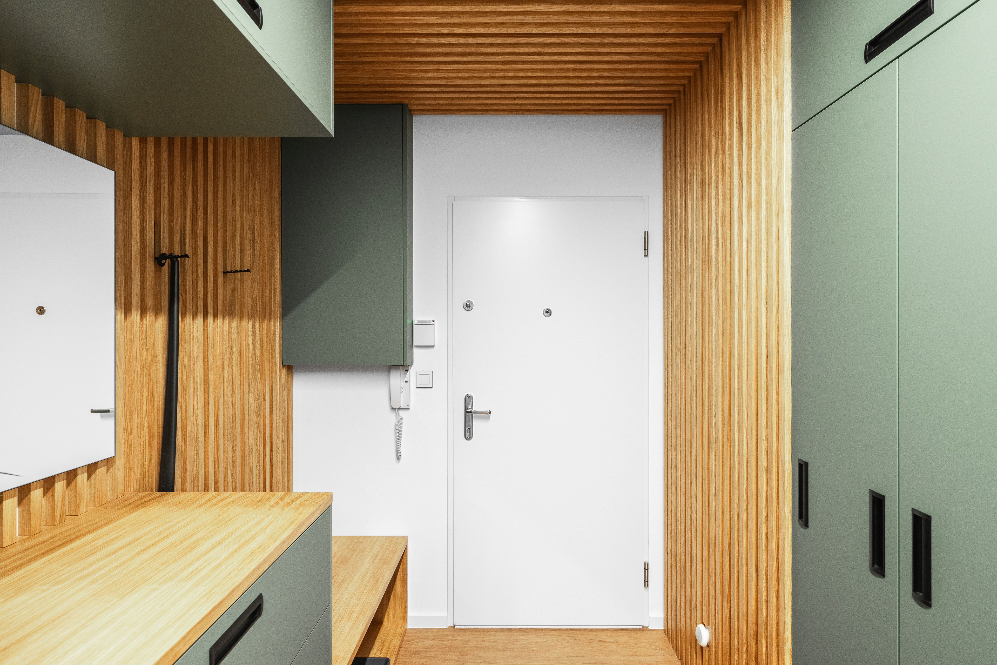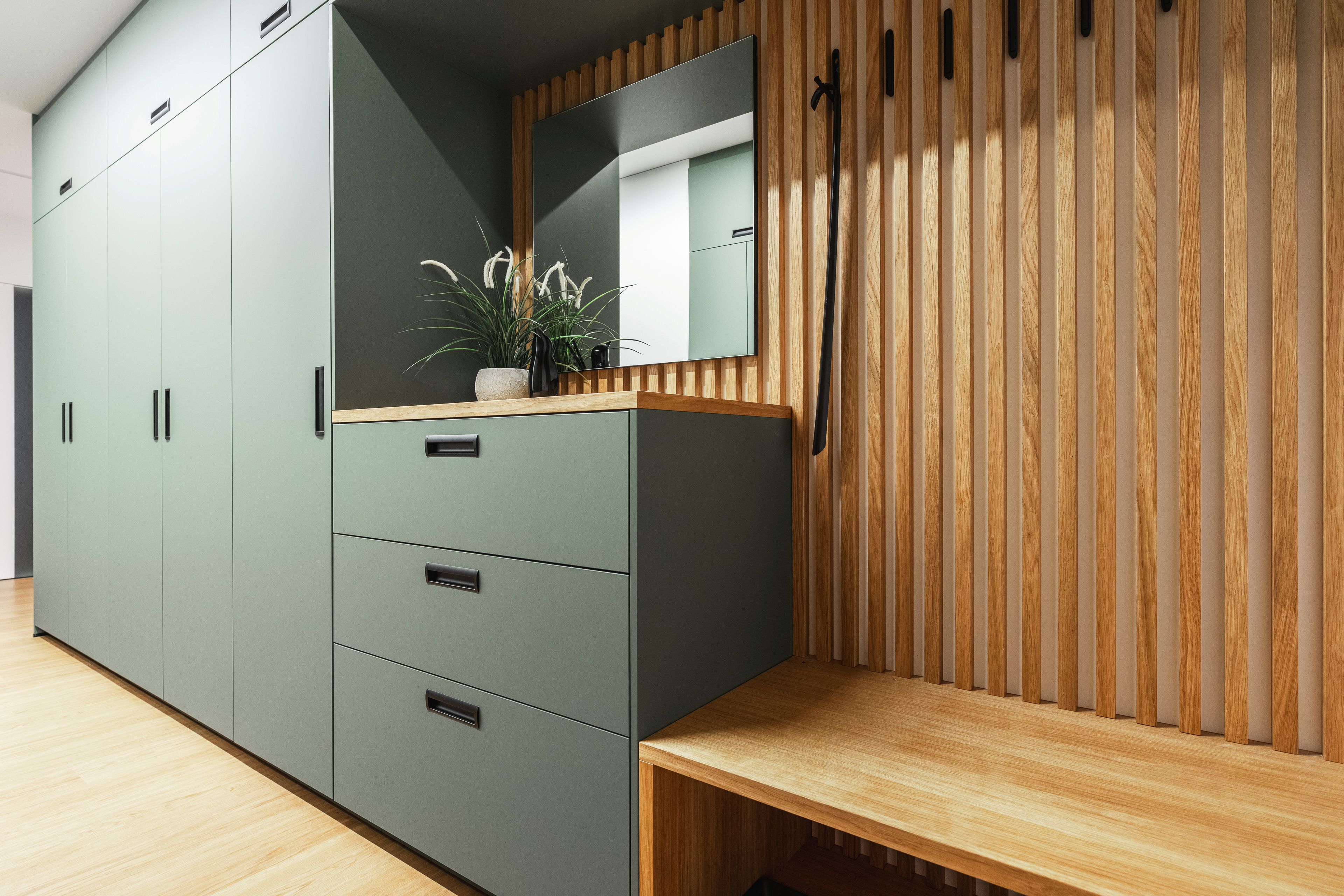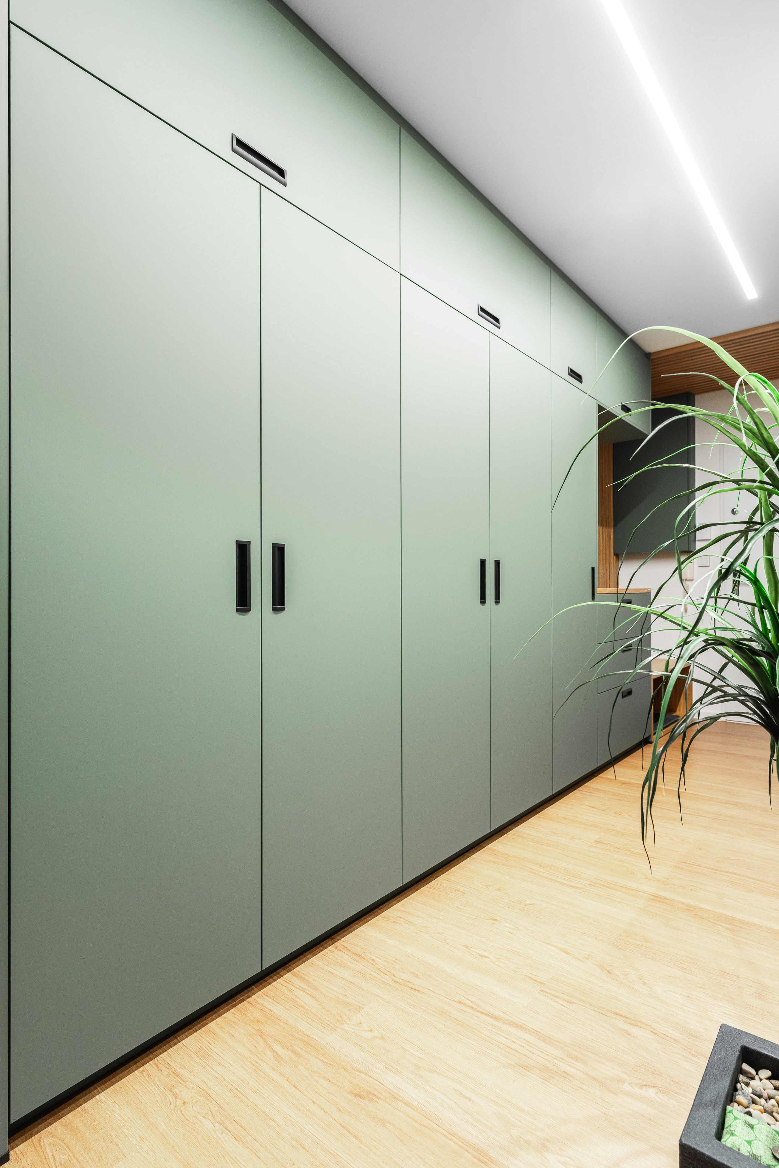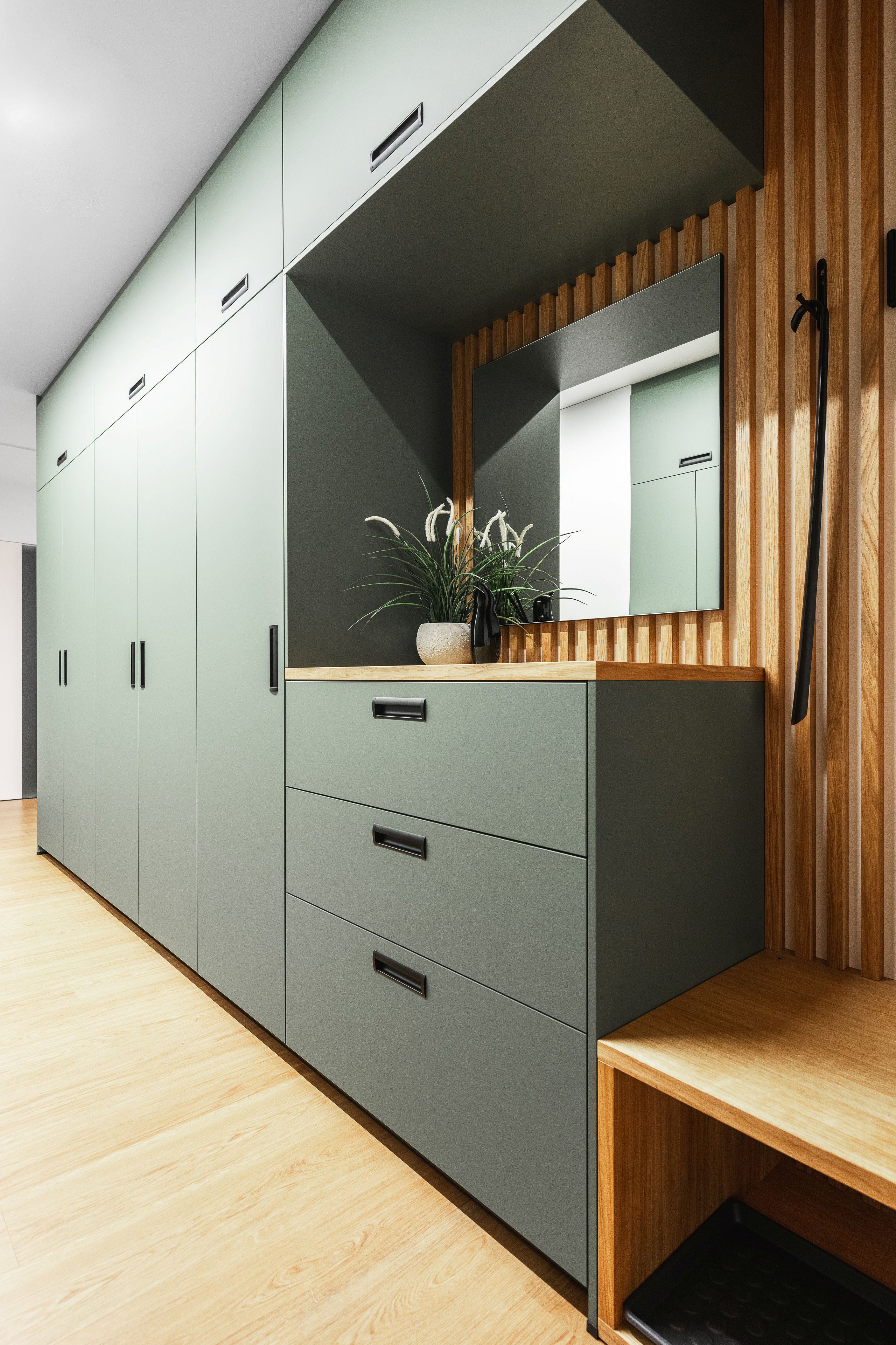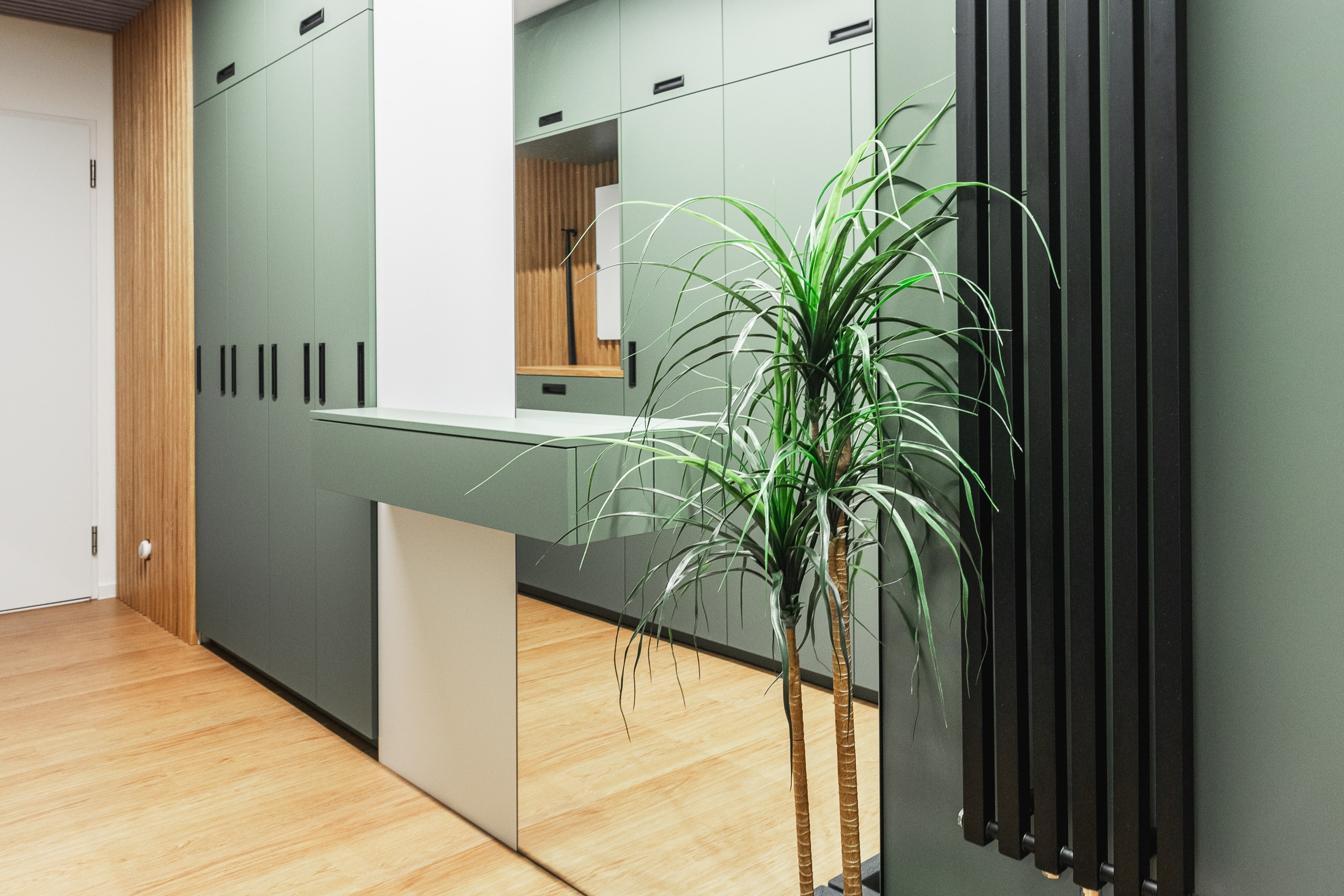 U vstupu do bytu klientka zvolila pro nábytek odstín Zelená Eukalyptus. Tento odstín je velmi svěží, přívětivá volba, příjemné přivítání při vstupu do tohoto útulného bytu s úžasnou energií a atmosférou.