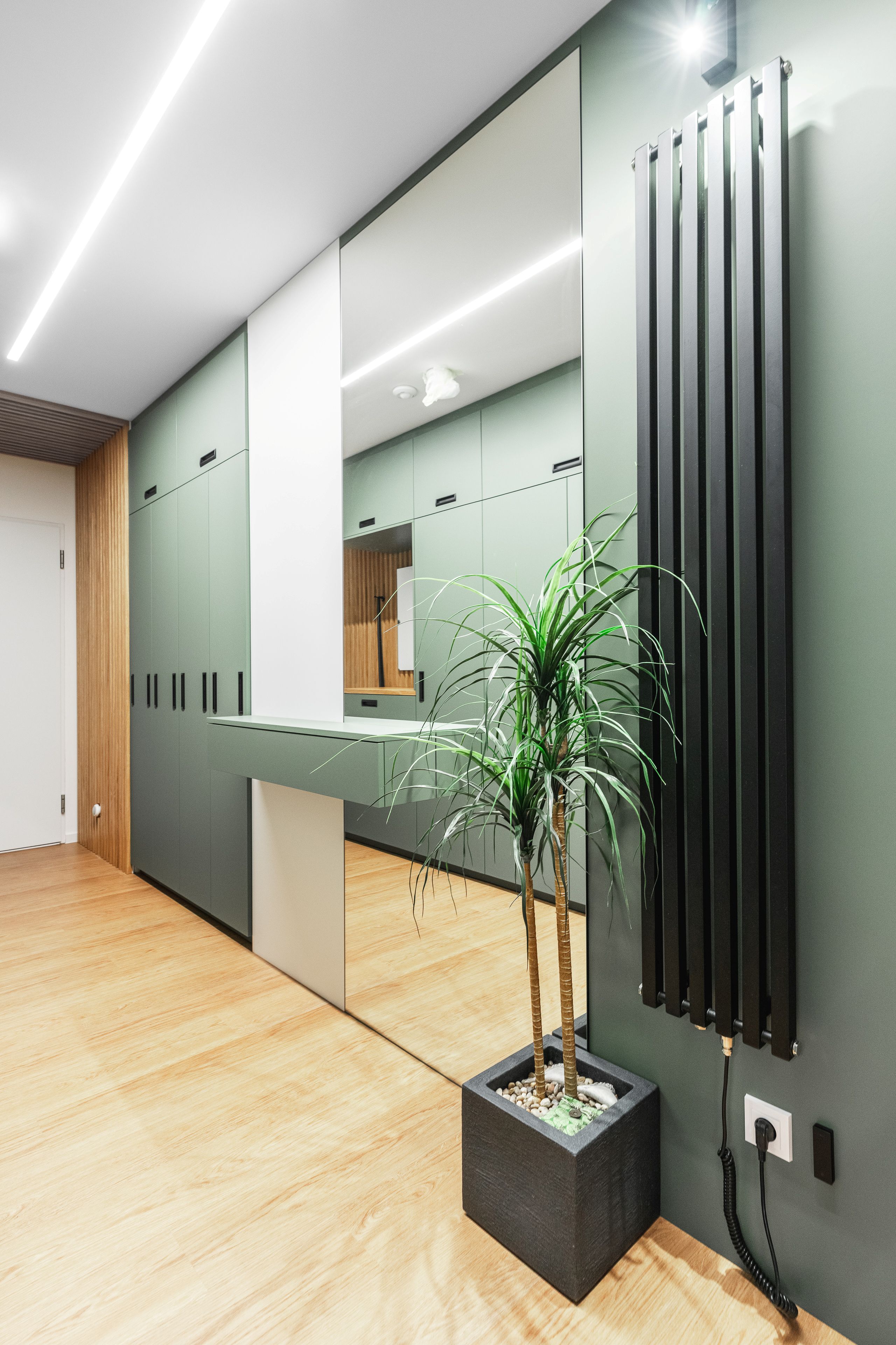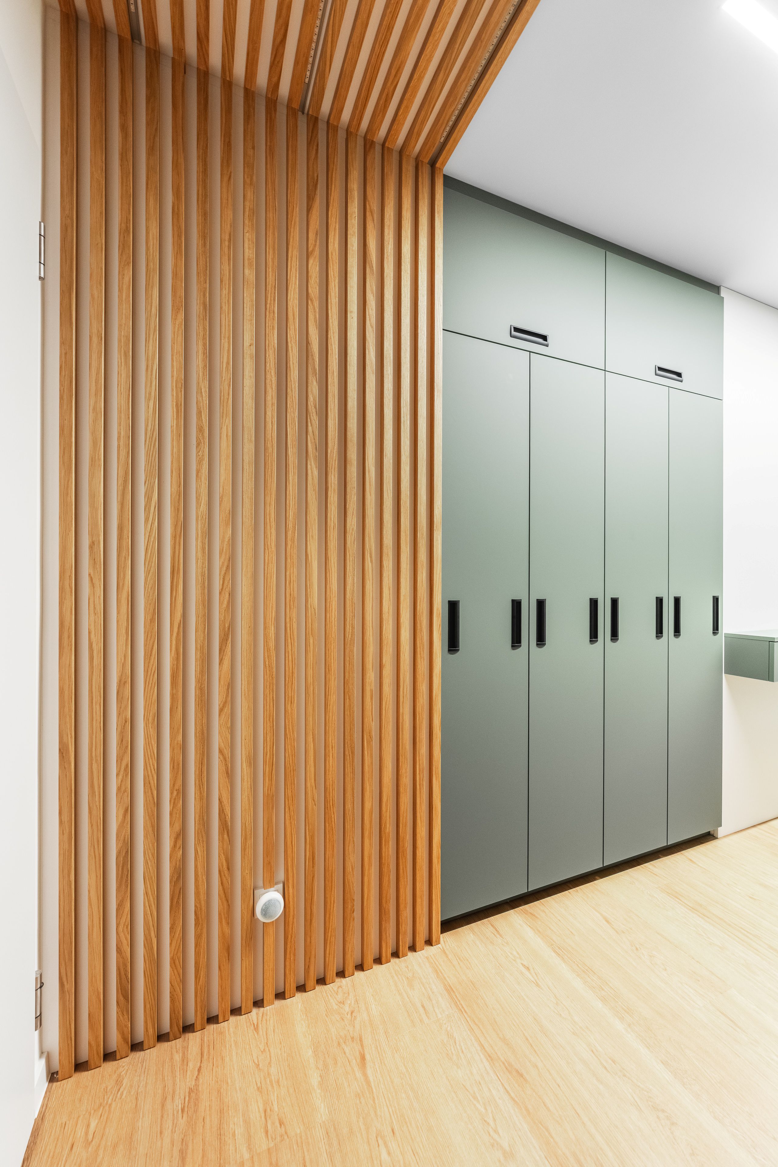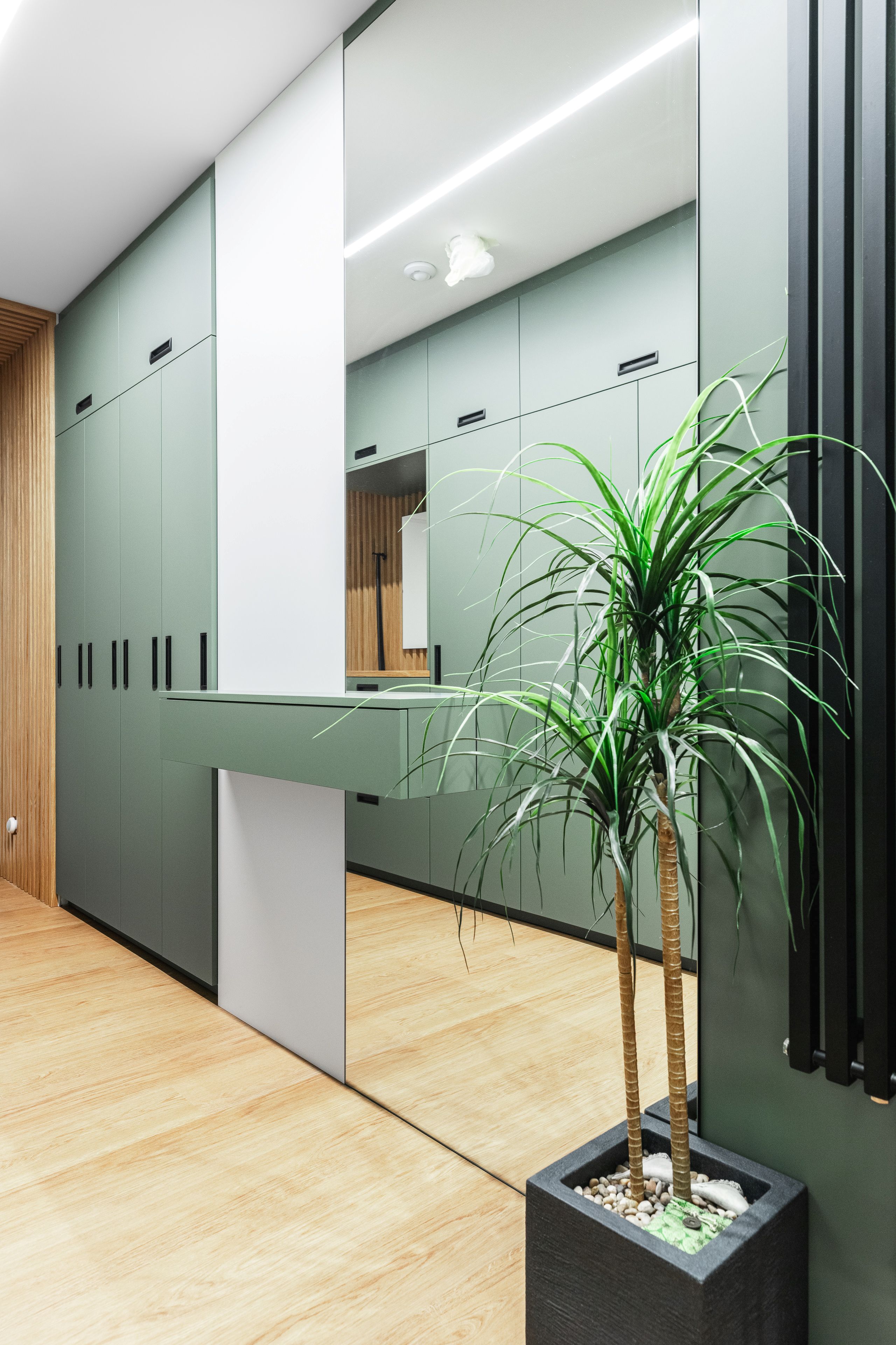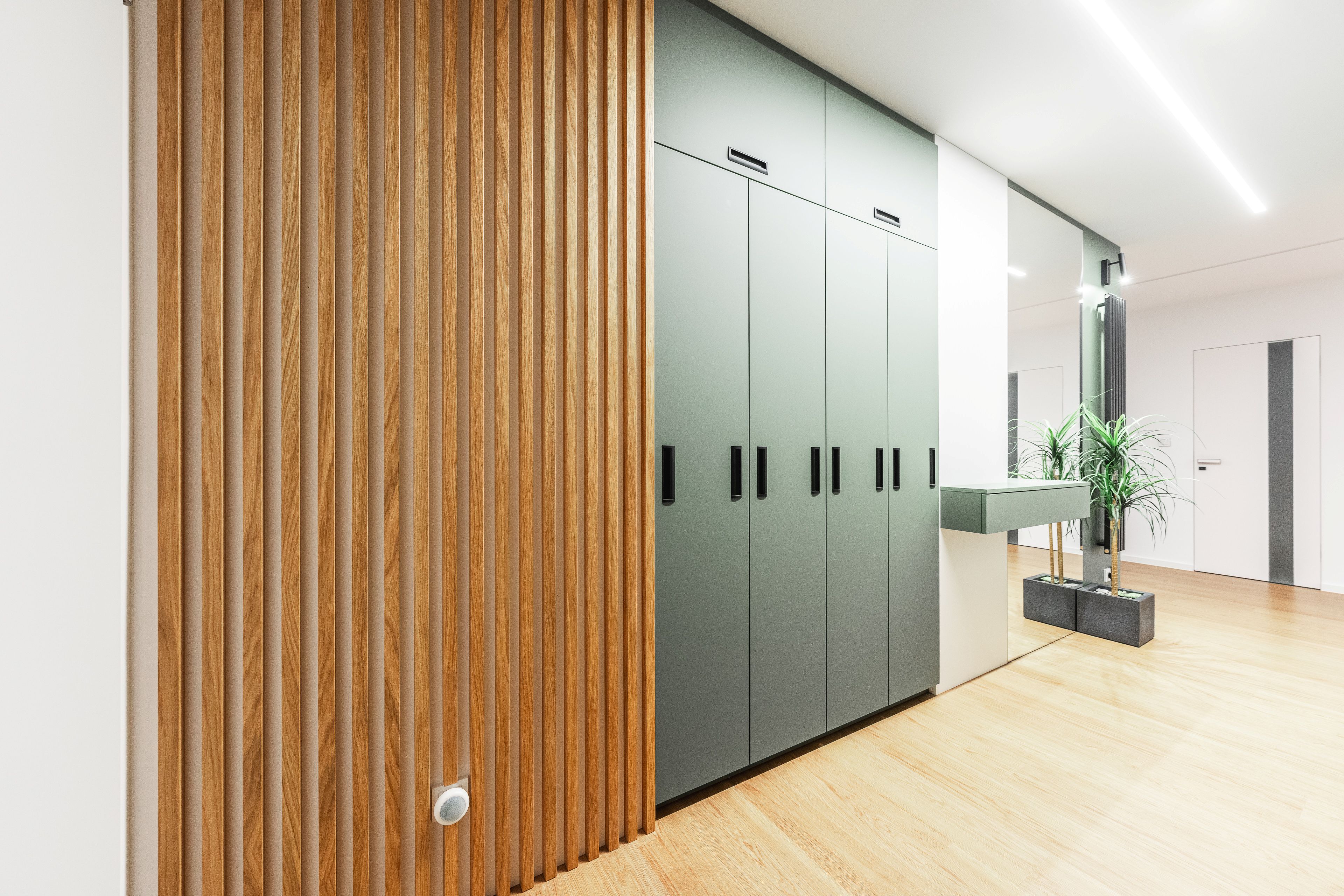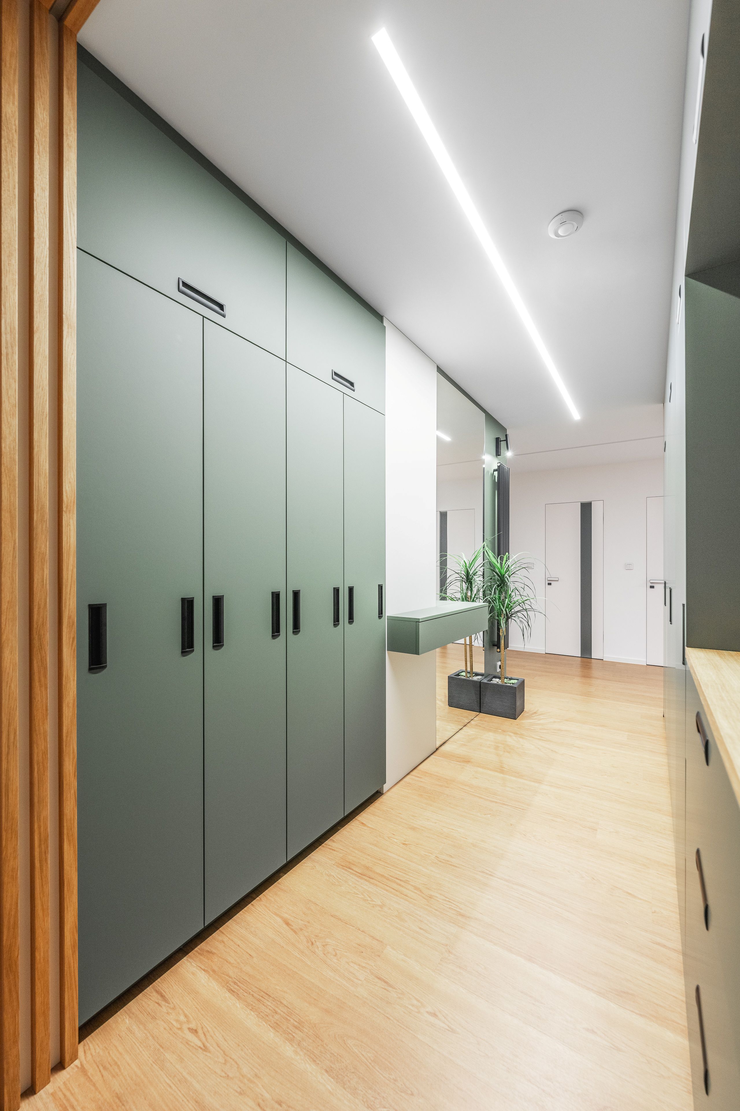 U vstupu do bytu klientka zvolila pro nábytek odstín Zelená Eukalyptus. Tento odstín je velmi svěží, přívětivá volba, příjemné přivítání při vstupu do tohoto útulného bytu s úžasnou energií a atmosférou.