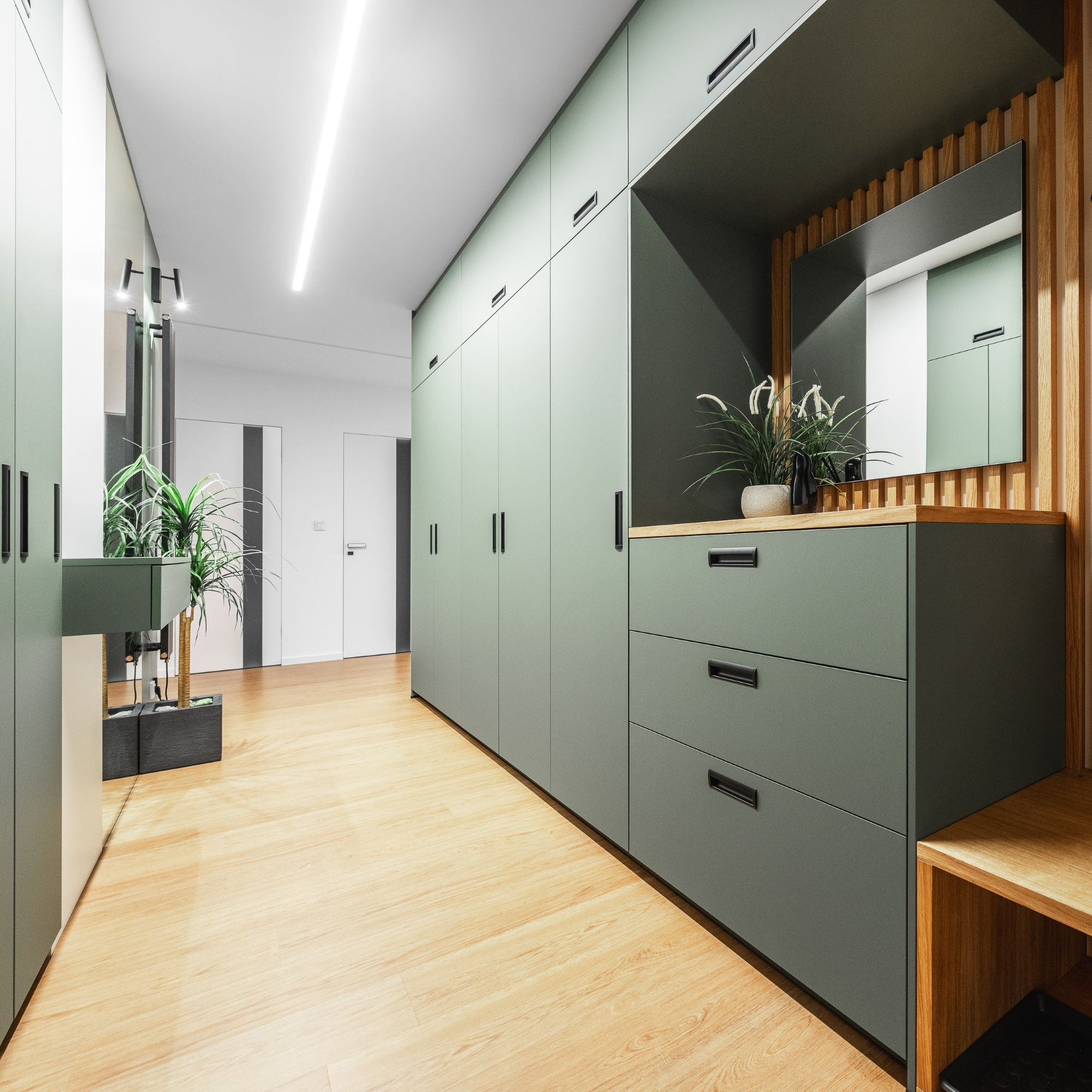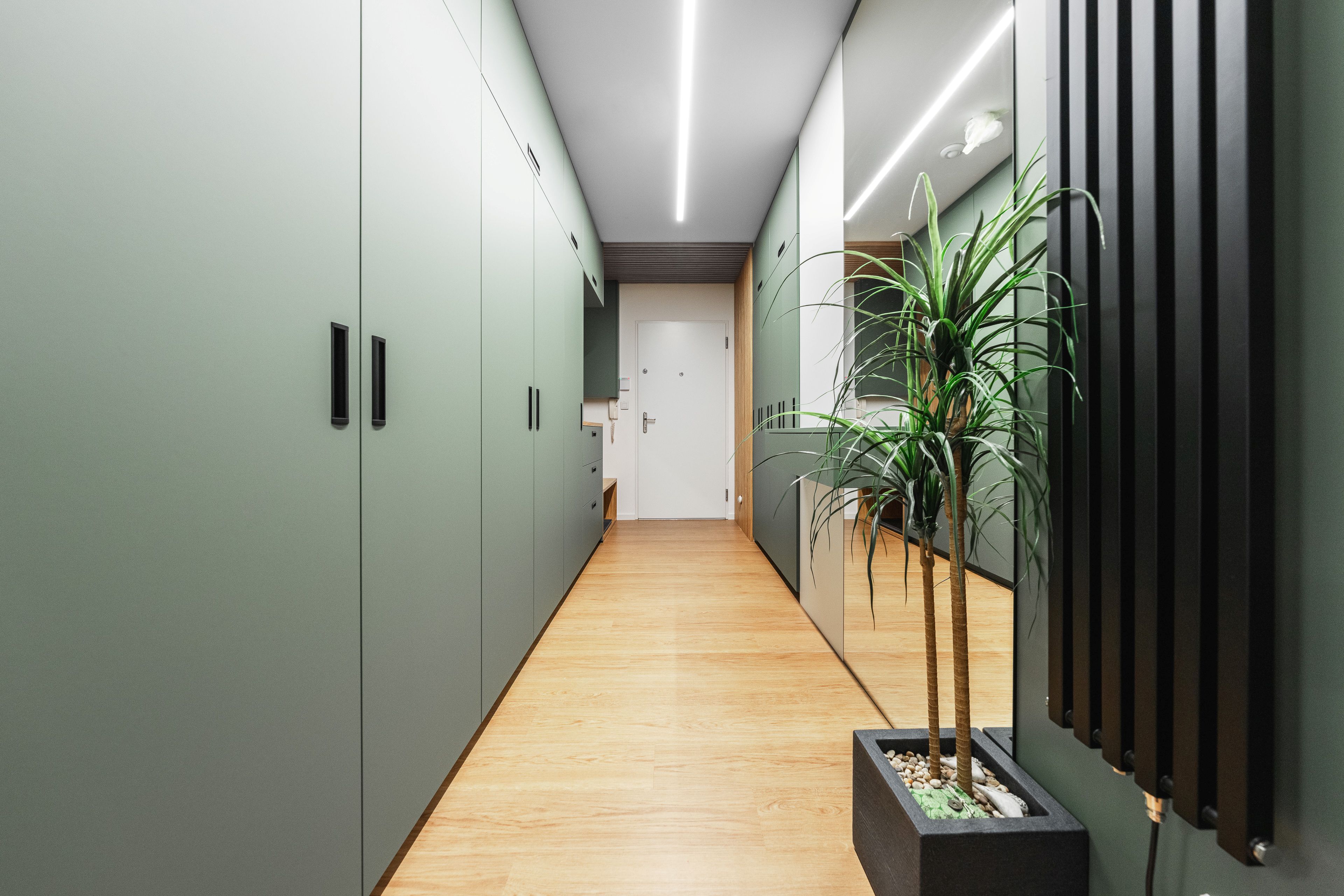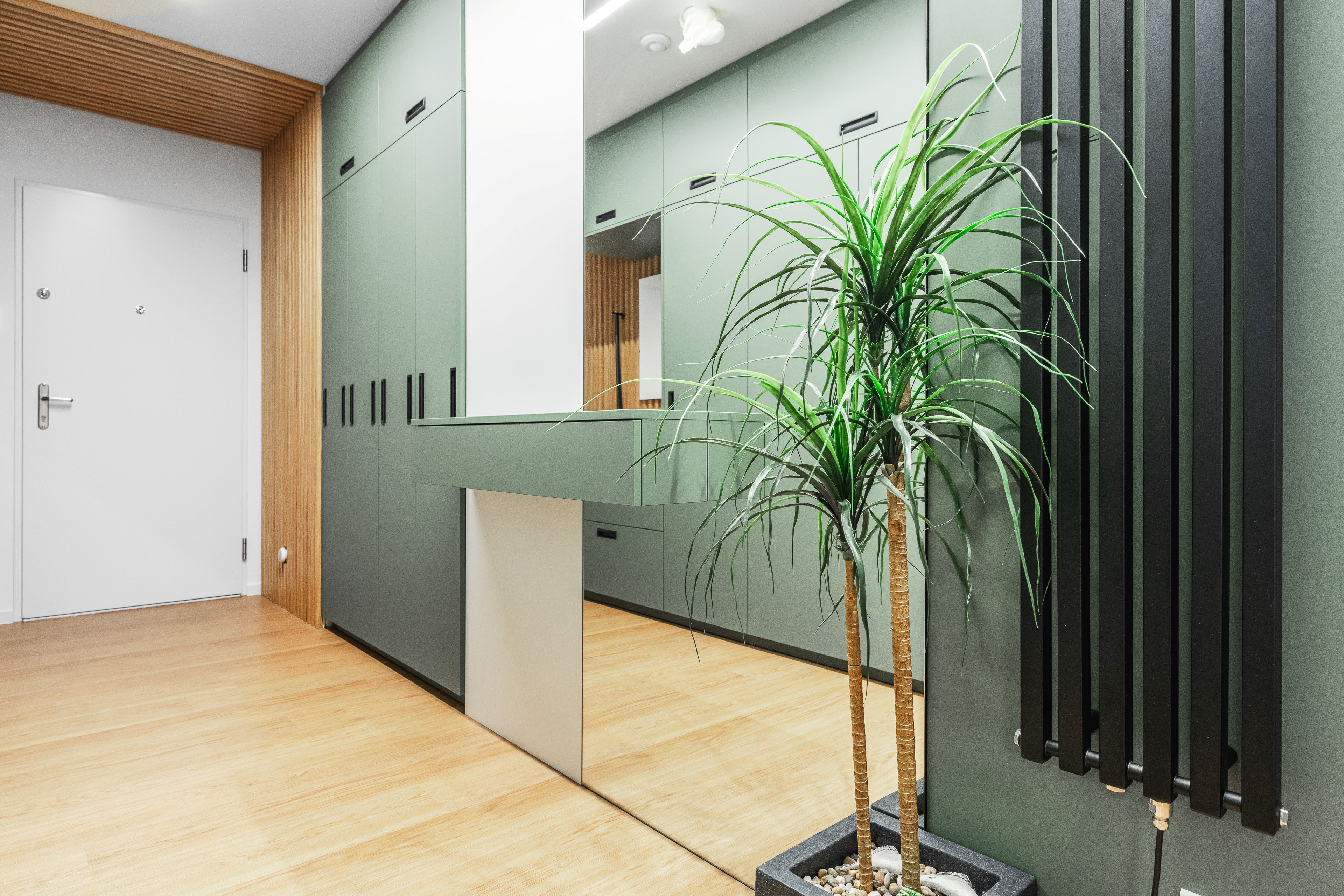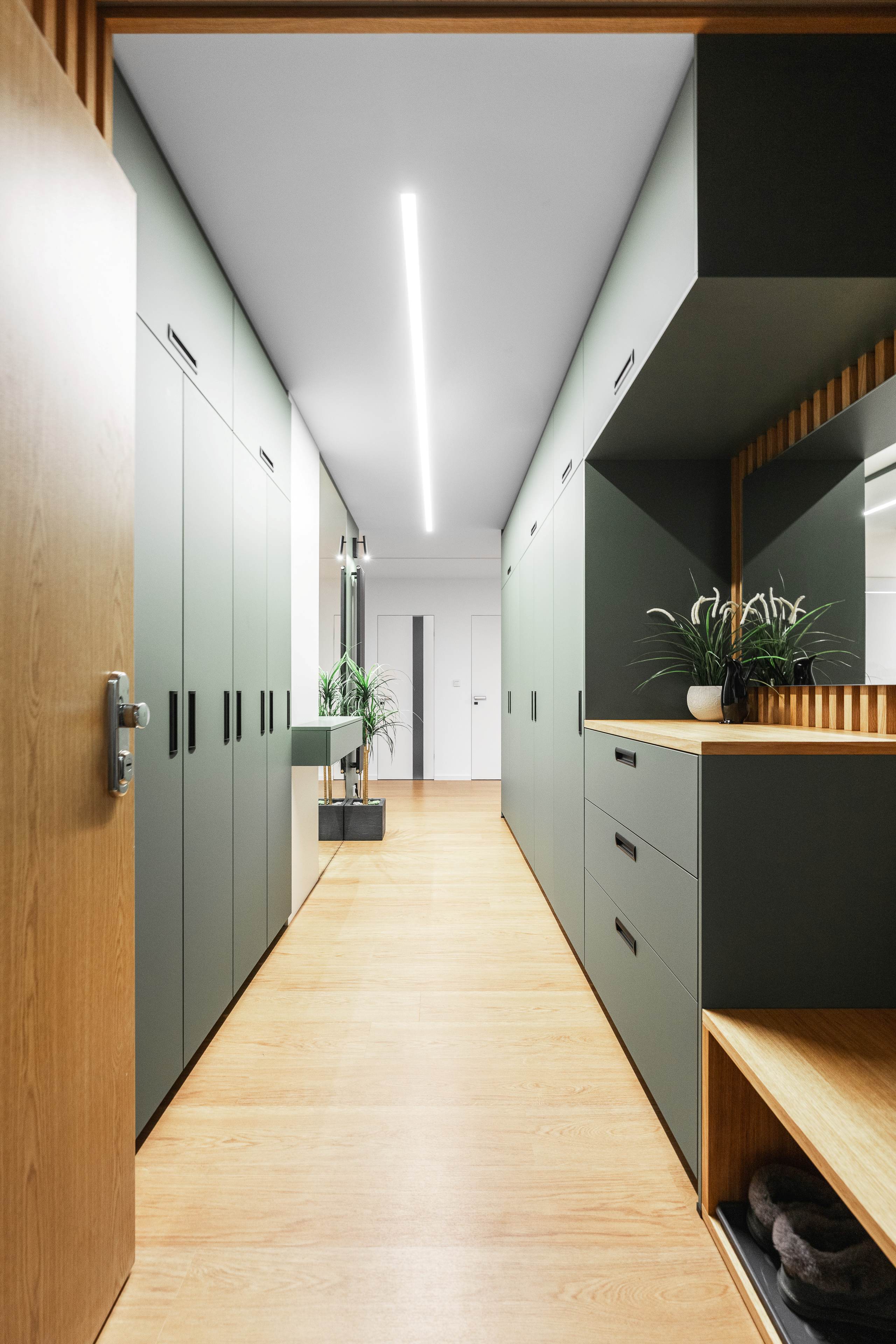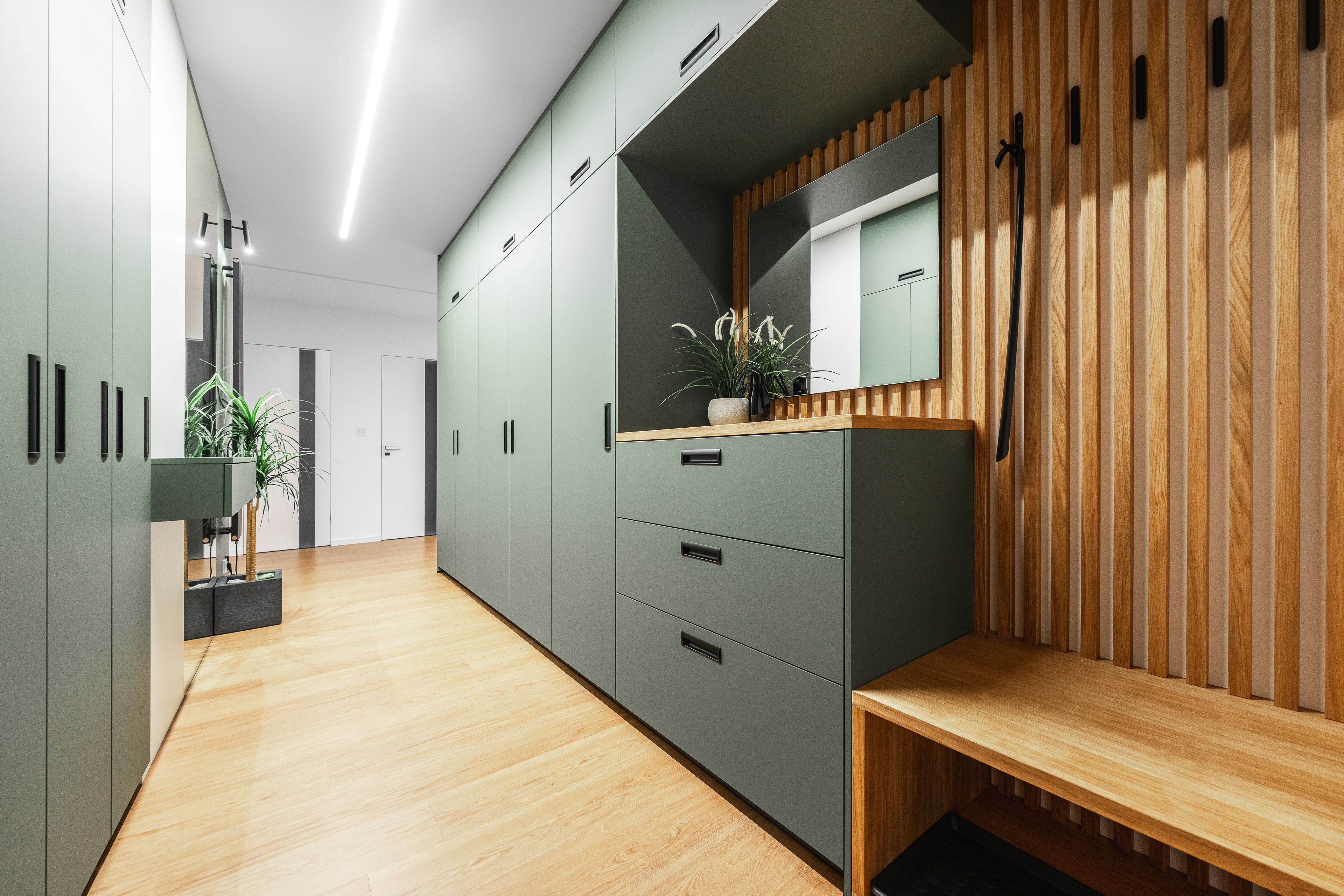 U vstupu do bytu klientka zvolila pro nábytek odstín Zelená Eukalyptus. Tento odstín je velmi svěží, přívětivá volba, příjemné přivítání při vstupu do tohoto útulného bytu s úžasnou energií a atmosférou.