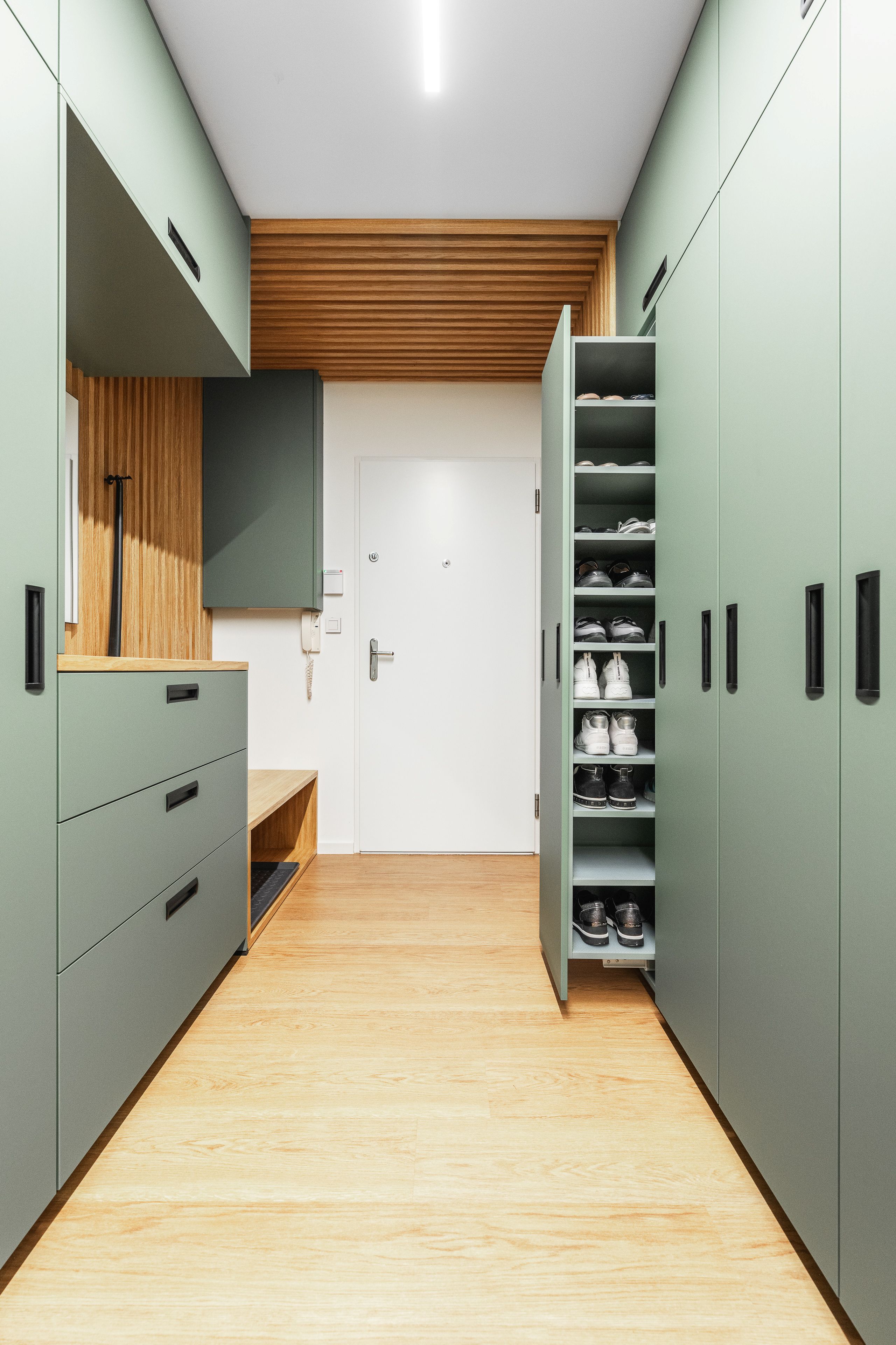 Za zmínku stojí komfortní botník, který si klientka přála. Jsou to 4 velké výsuvné skříně vedle sebe s nadstandardním užitným prostorem.