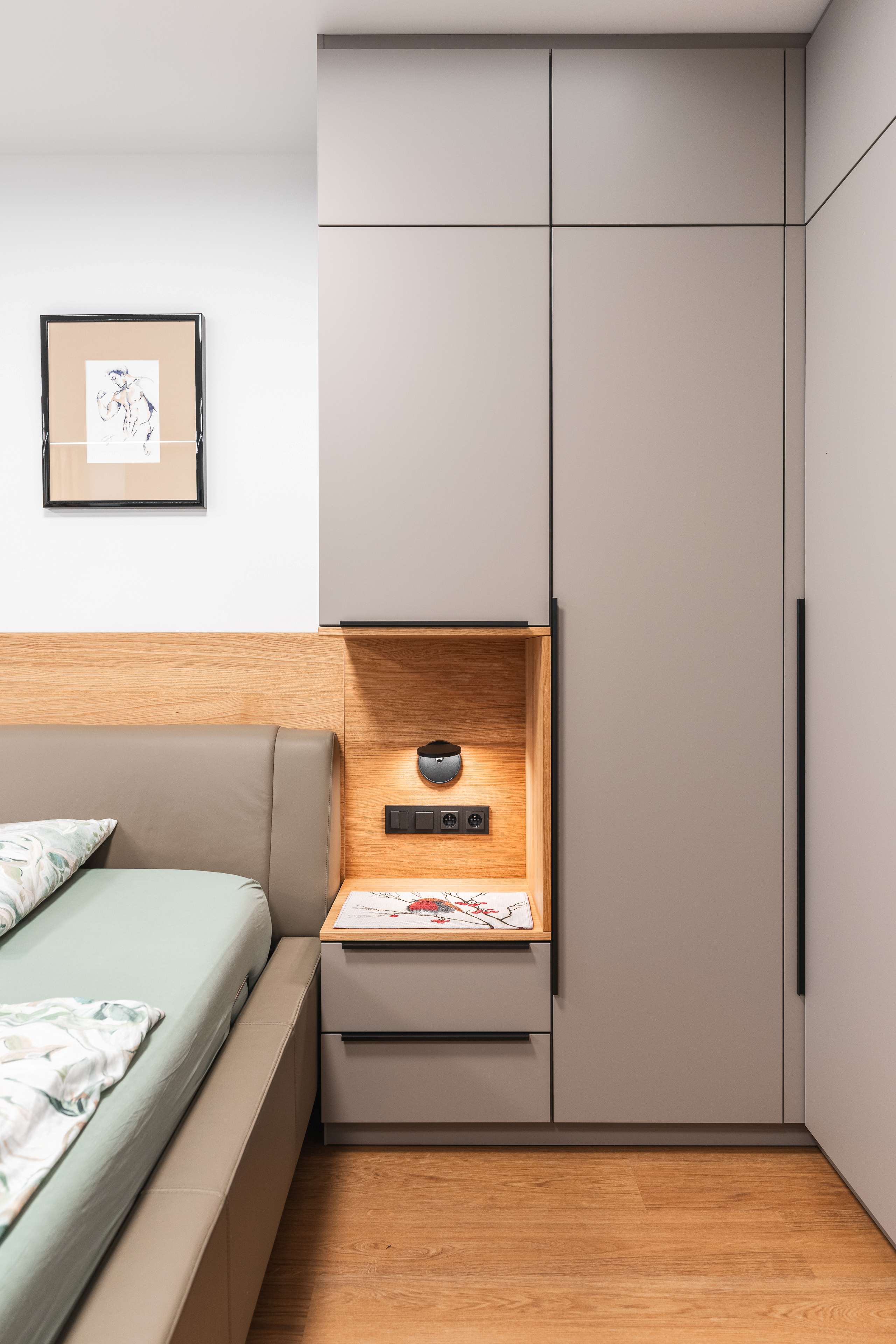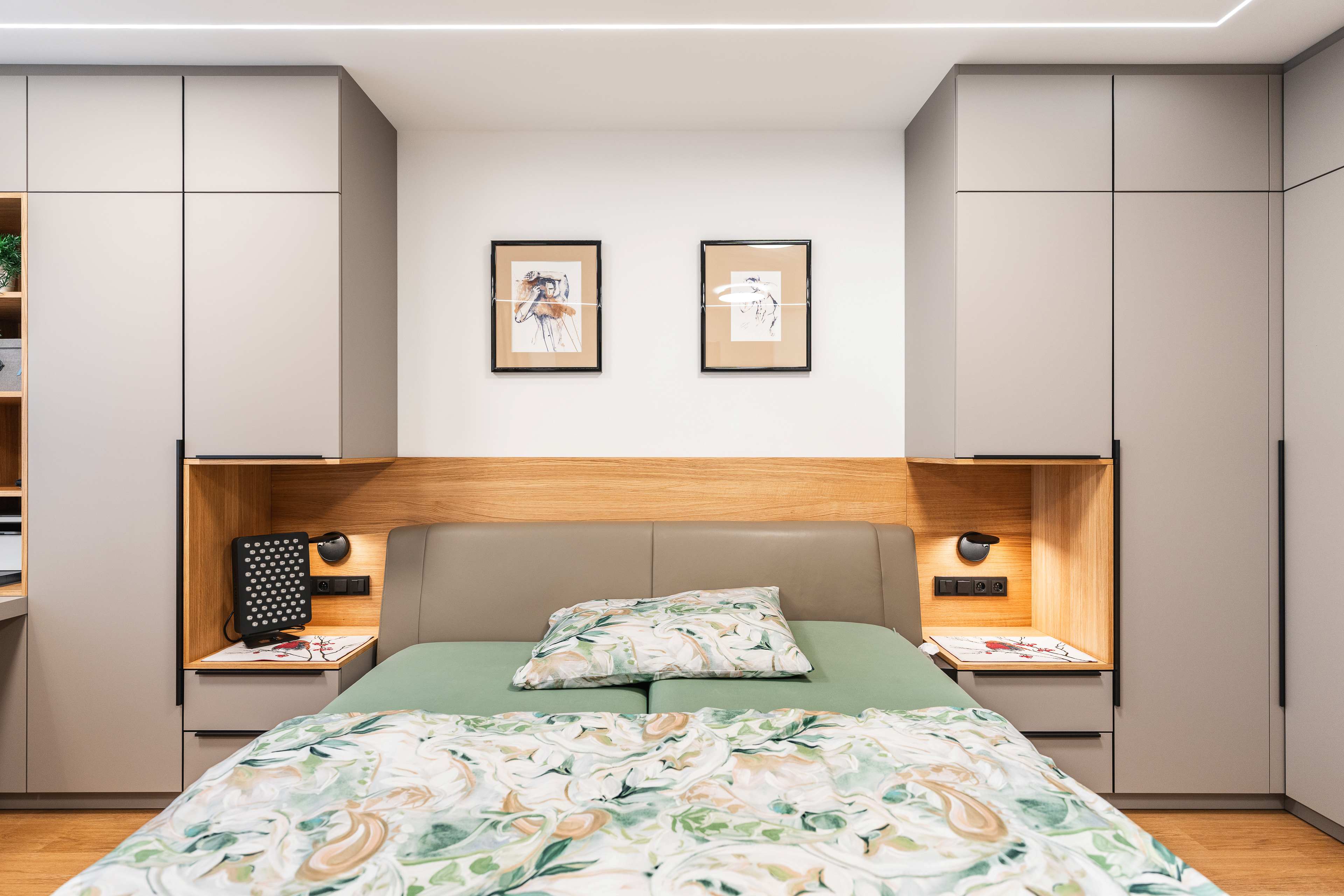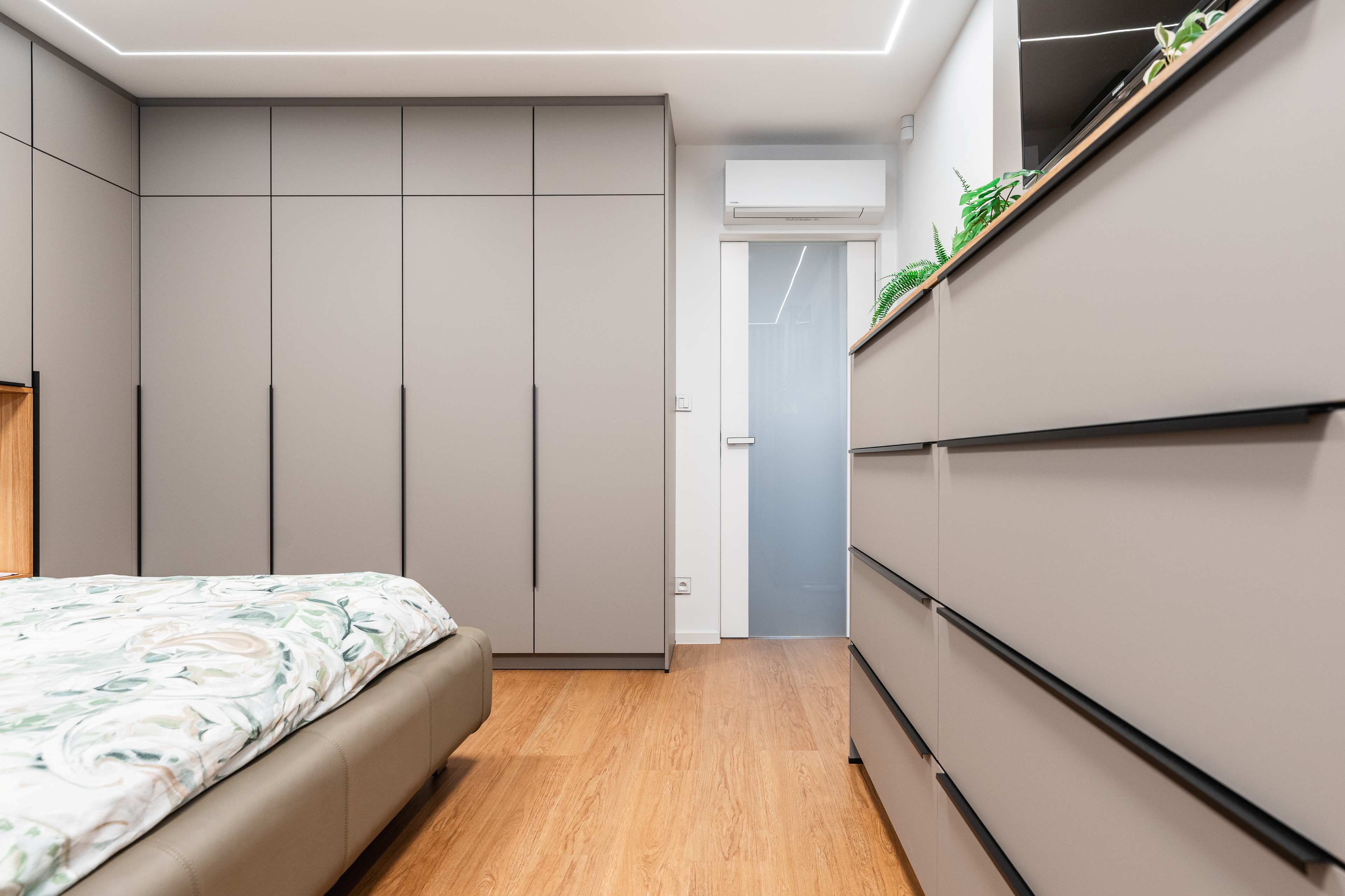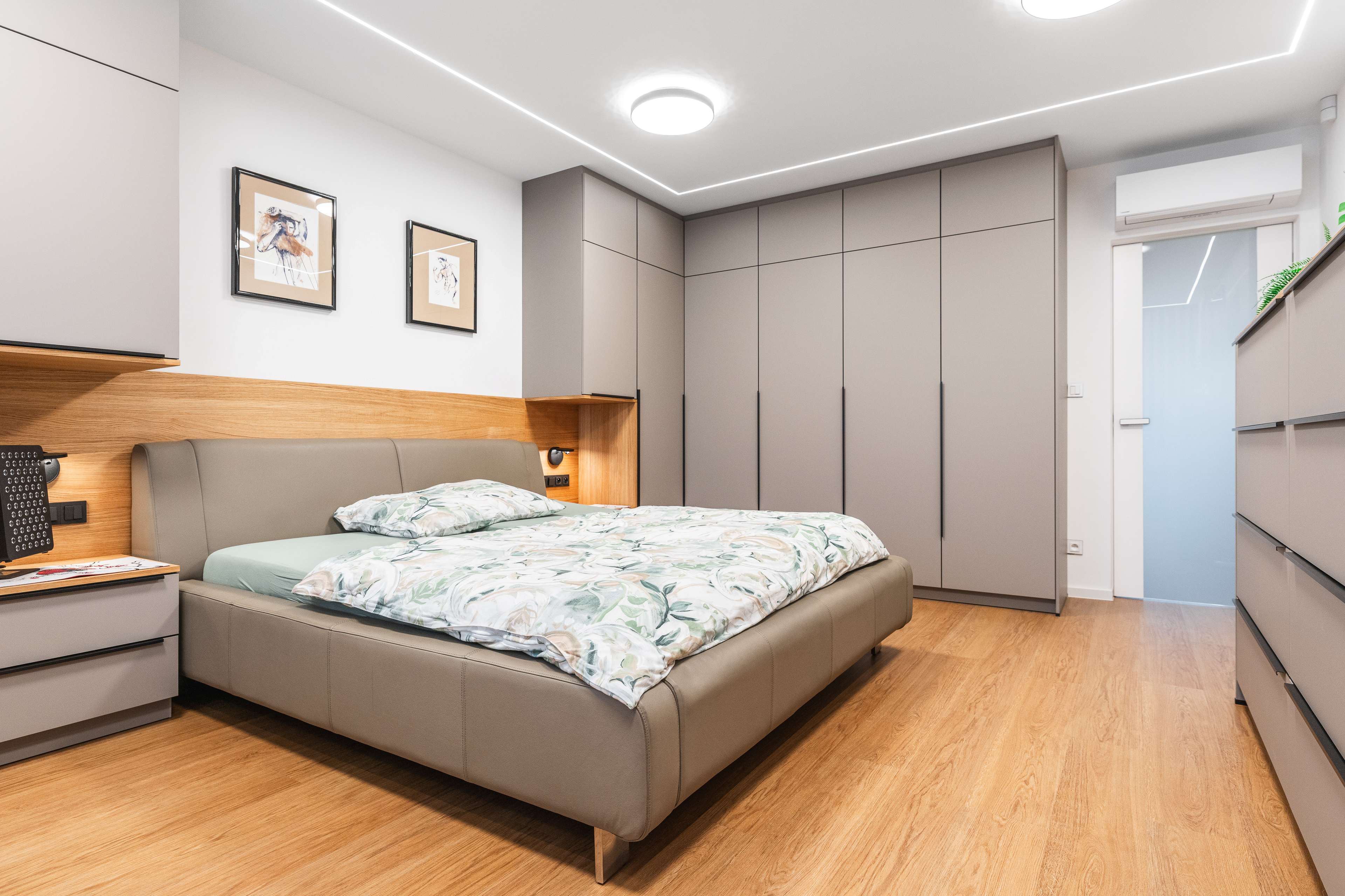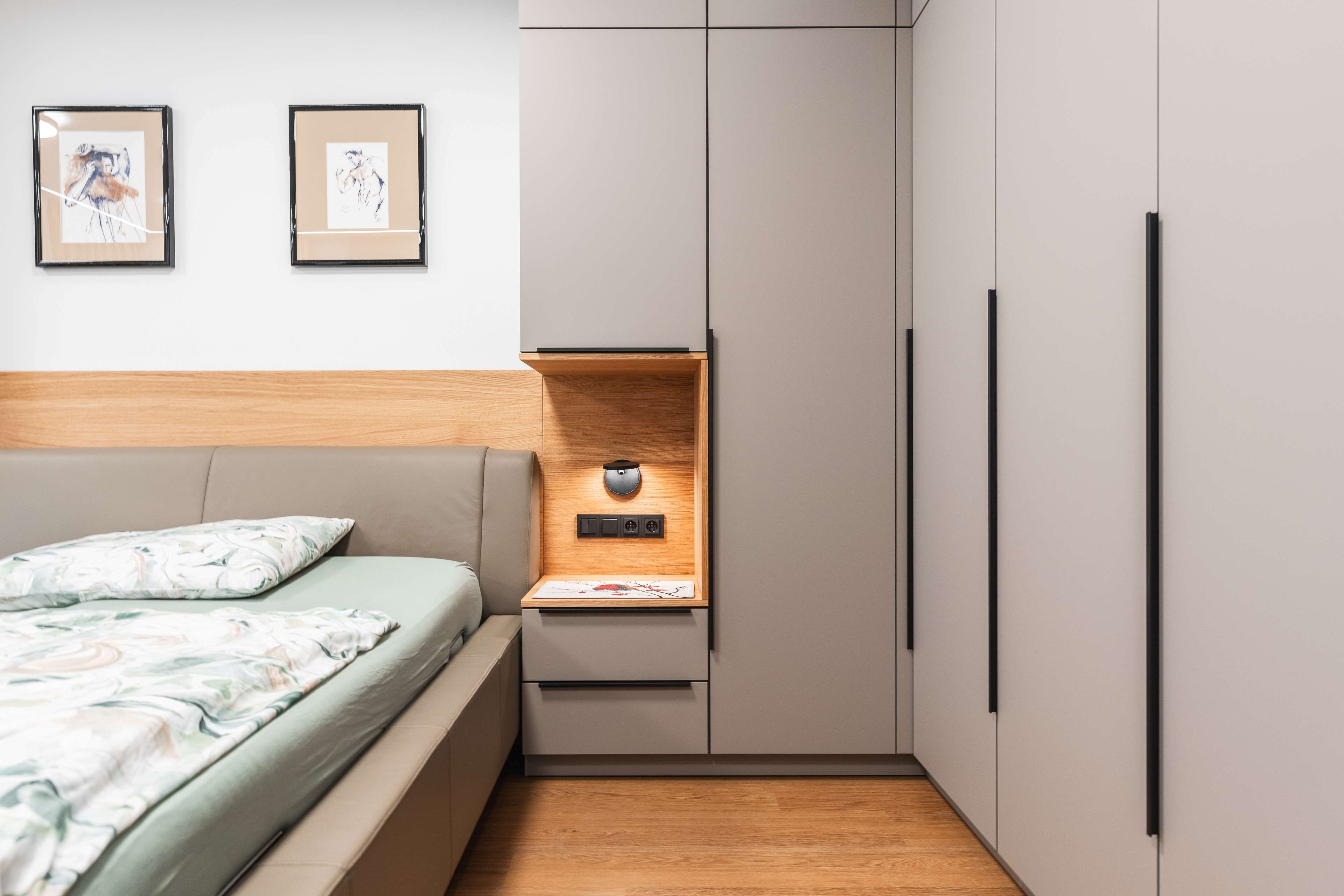 Ložnice je kombinací nádherných příjemných materiálů a odstínů kašmírová, dýha dub a černá.