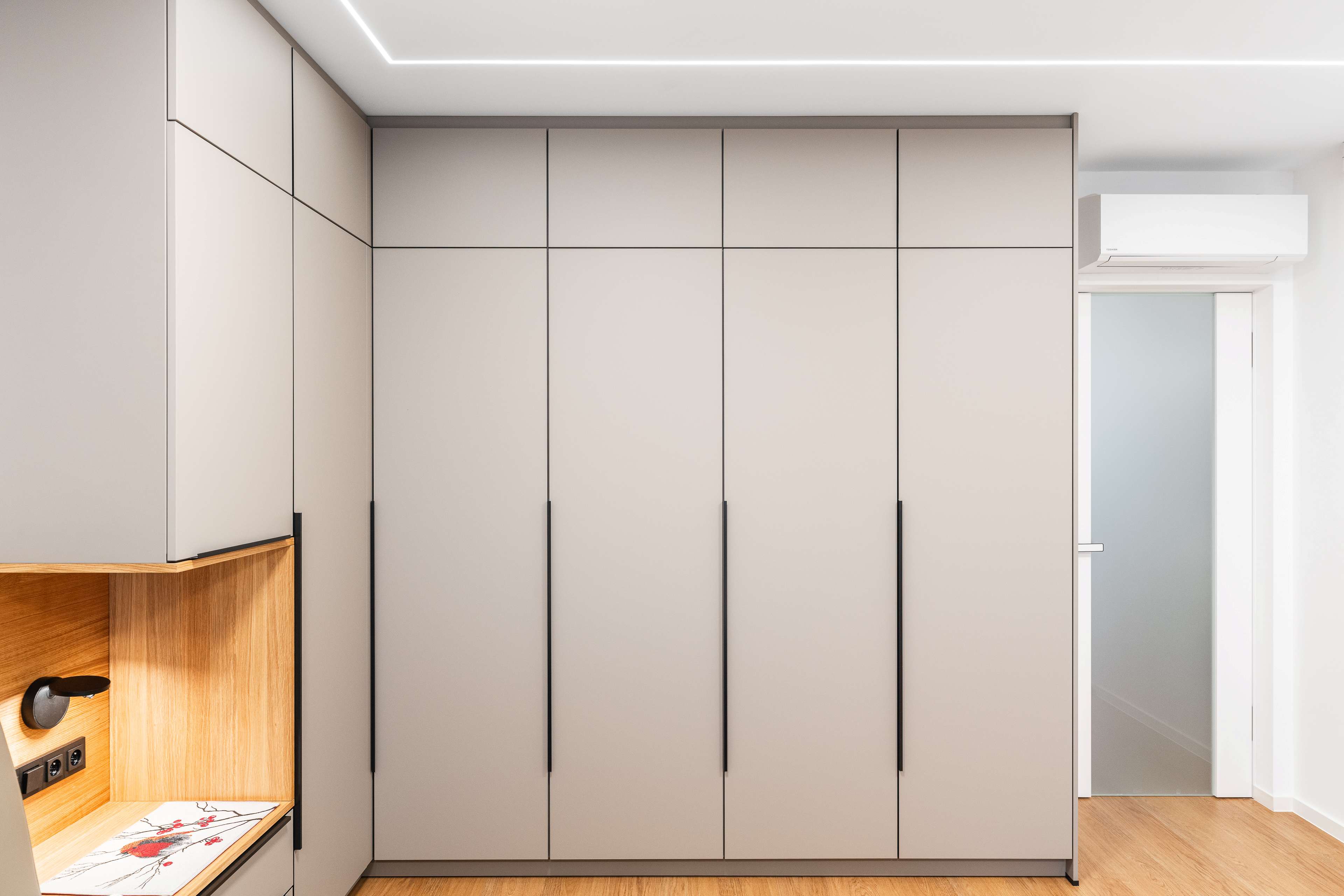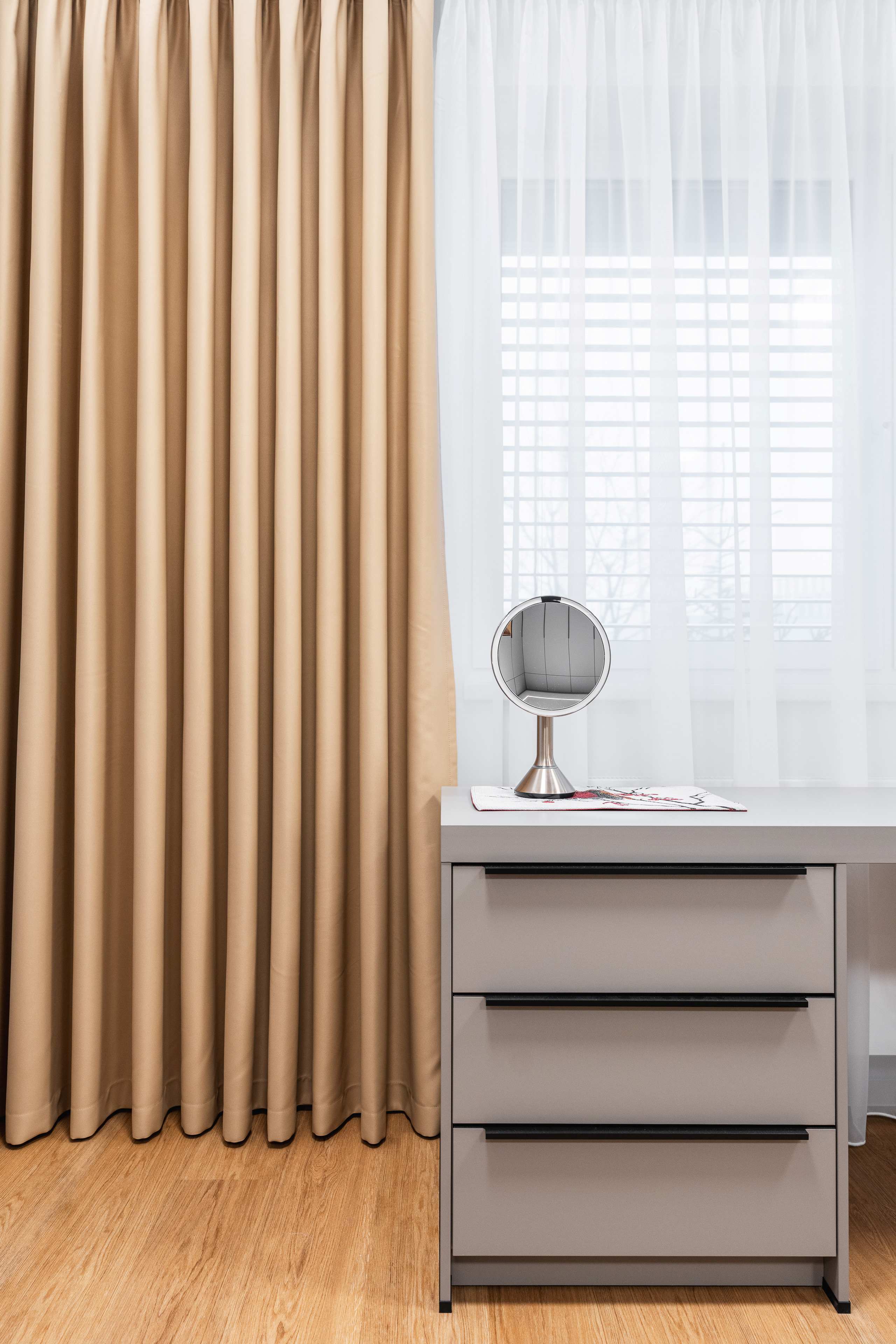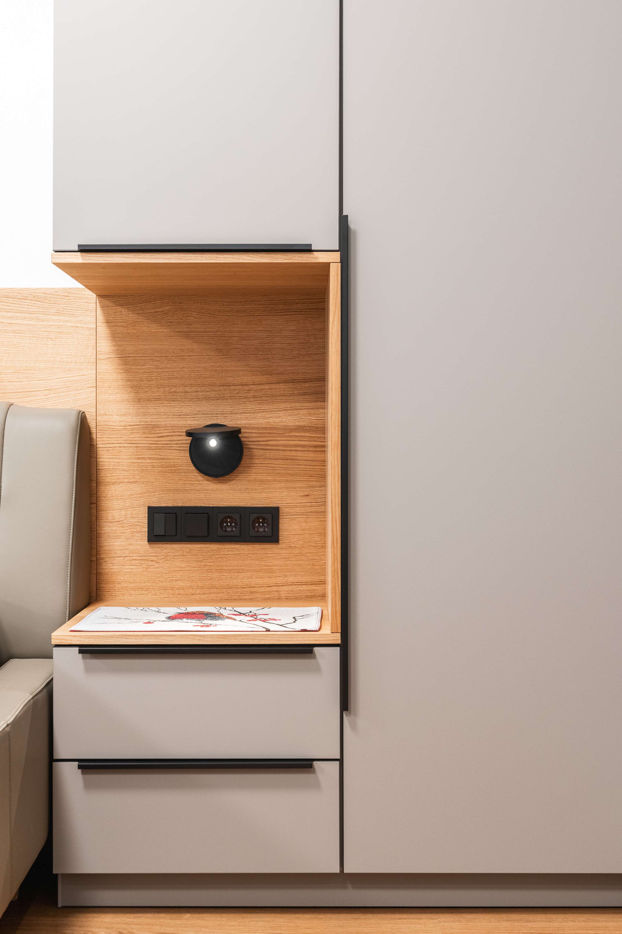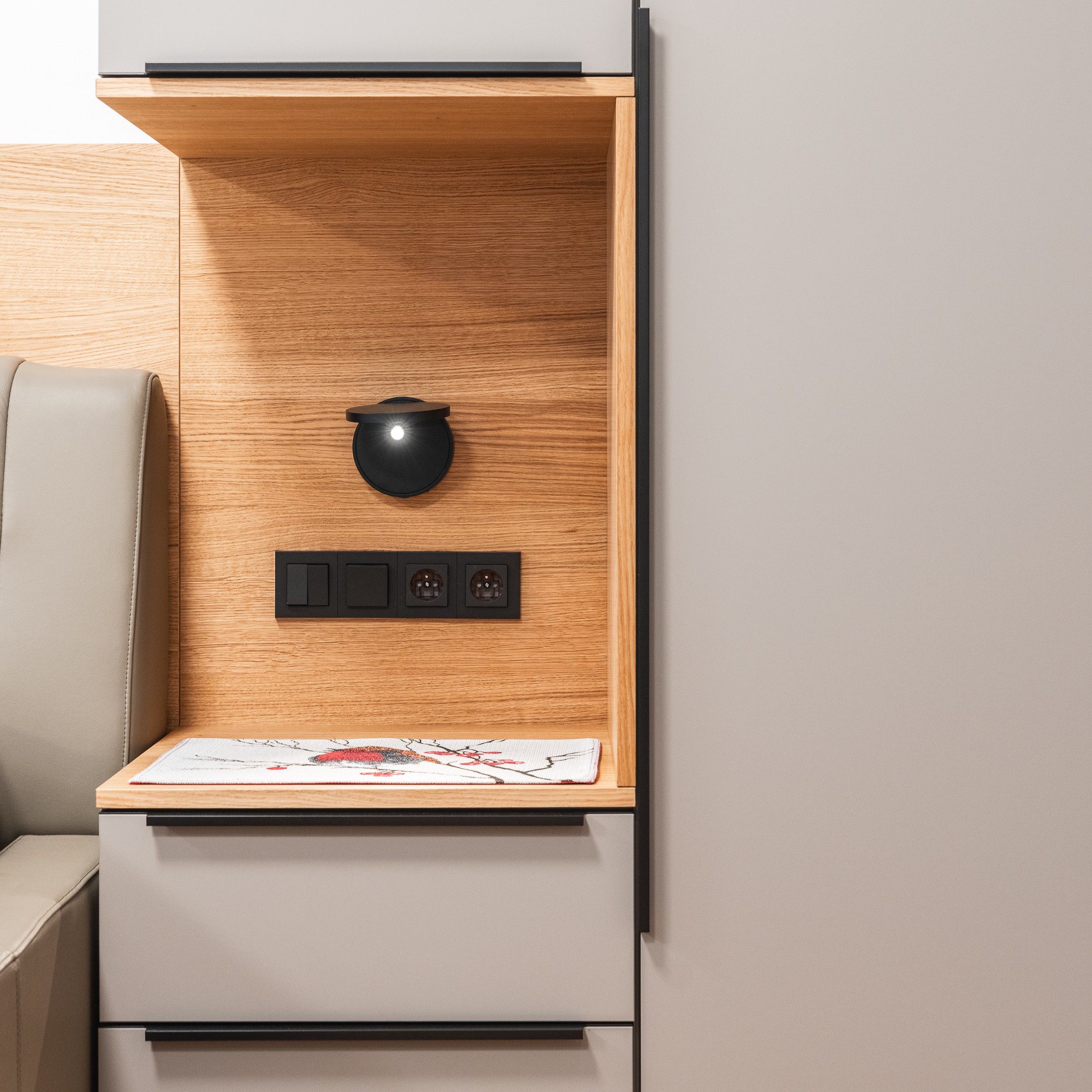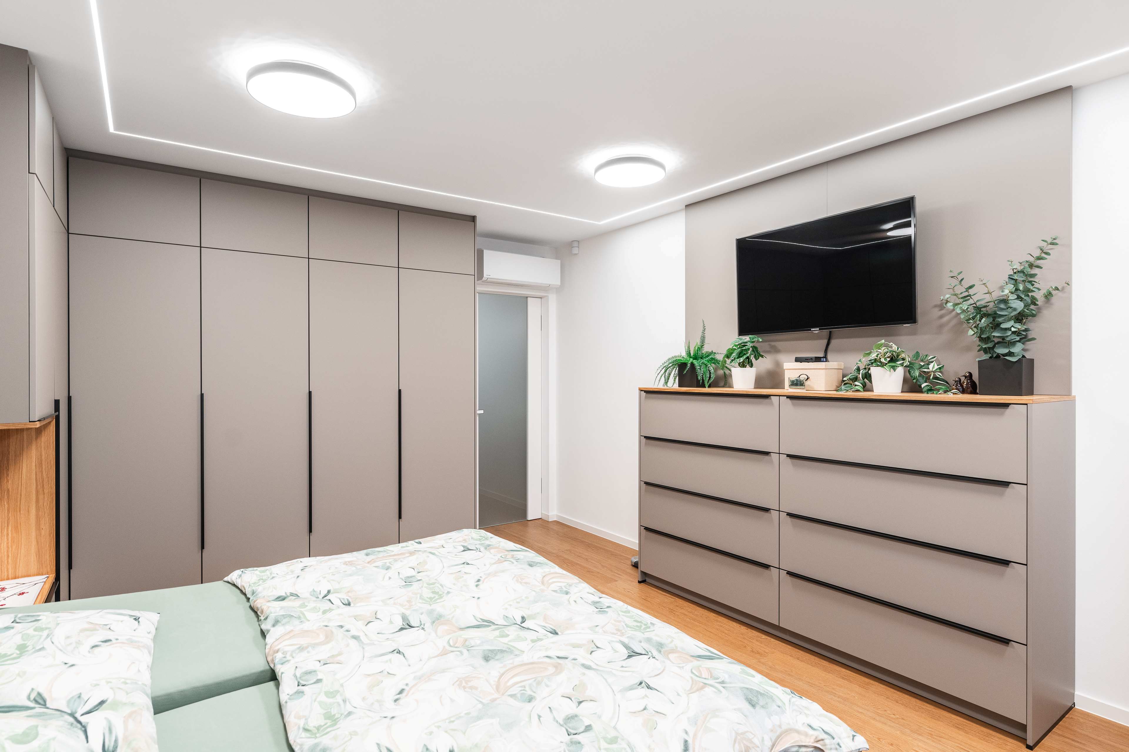 Ložnice je kombinací nádherných příjemných materiálů a odstínů kašmírová, dýha dub a černá.