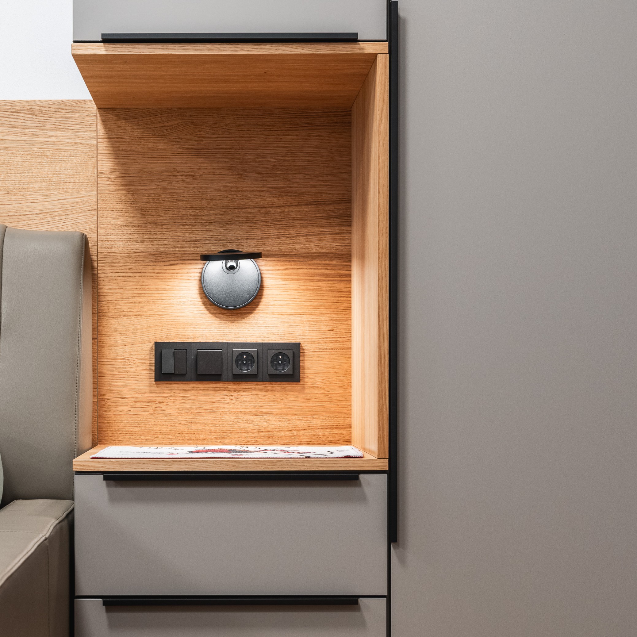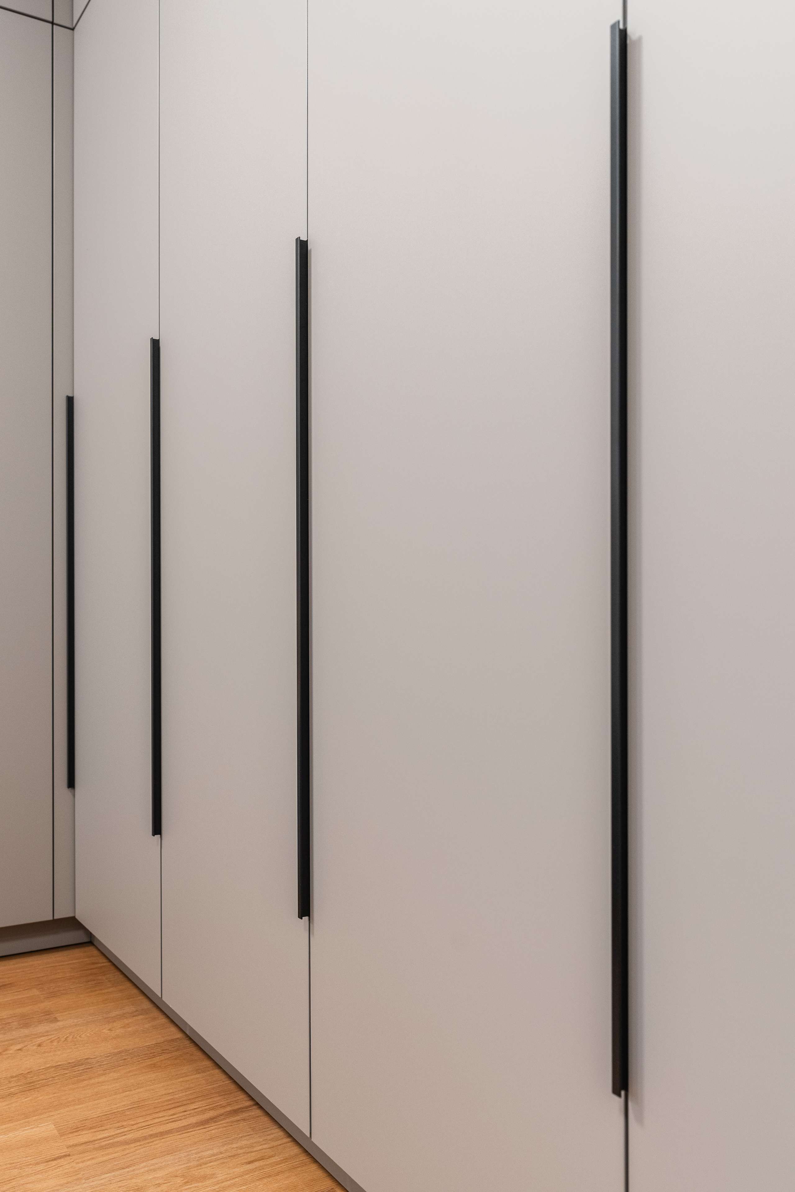 Úchytky jsou všechny vyráběné na zakázku, v odstínu černá matná RAL. Taktéž dýhované prvky, v koncové úpravě olej.