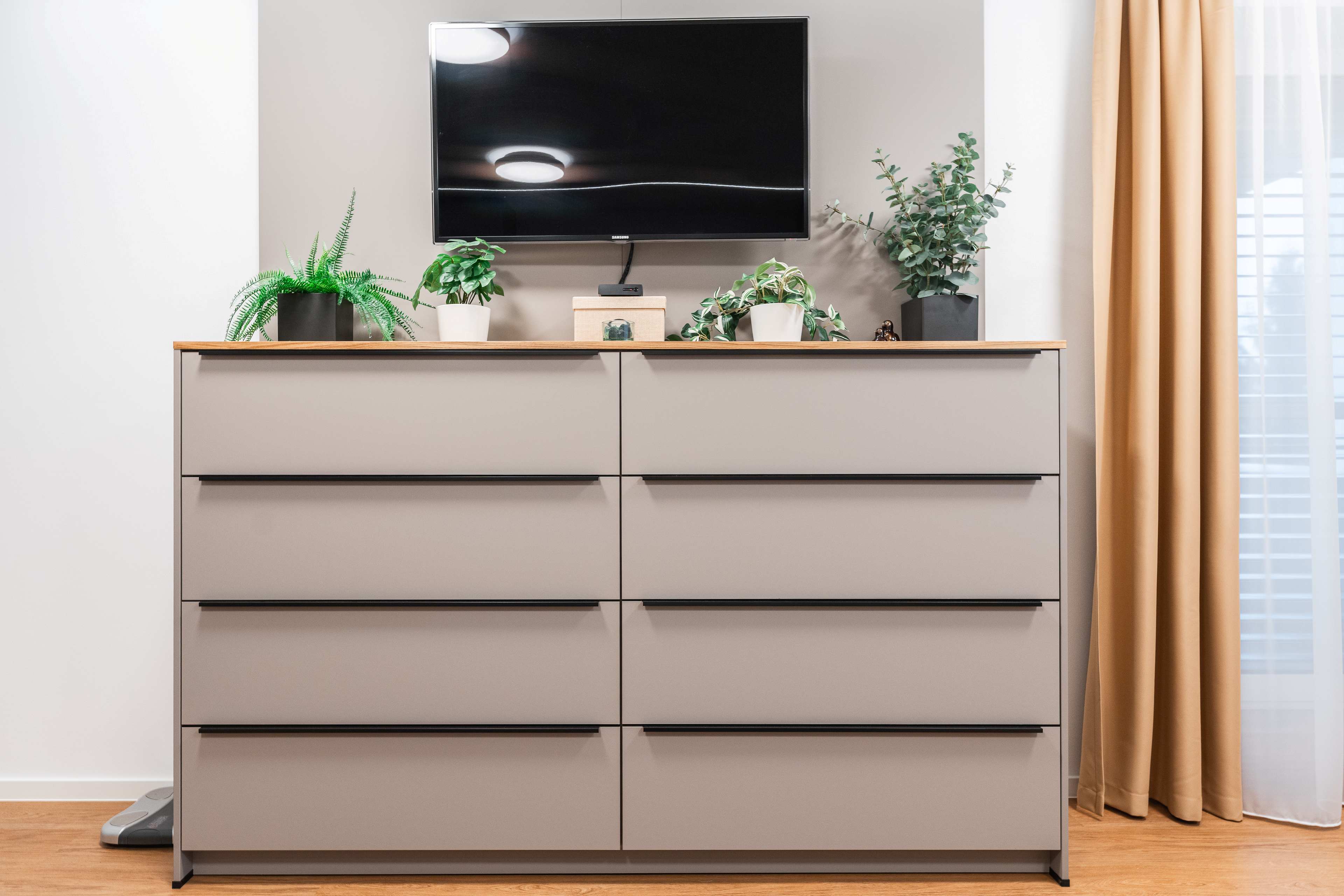 Dvířka v elegantním nadčasovém odstínu kašmírové, UV lakované čelo ve speciální úpravě AFP (ochrana proti otiskům prstů).