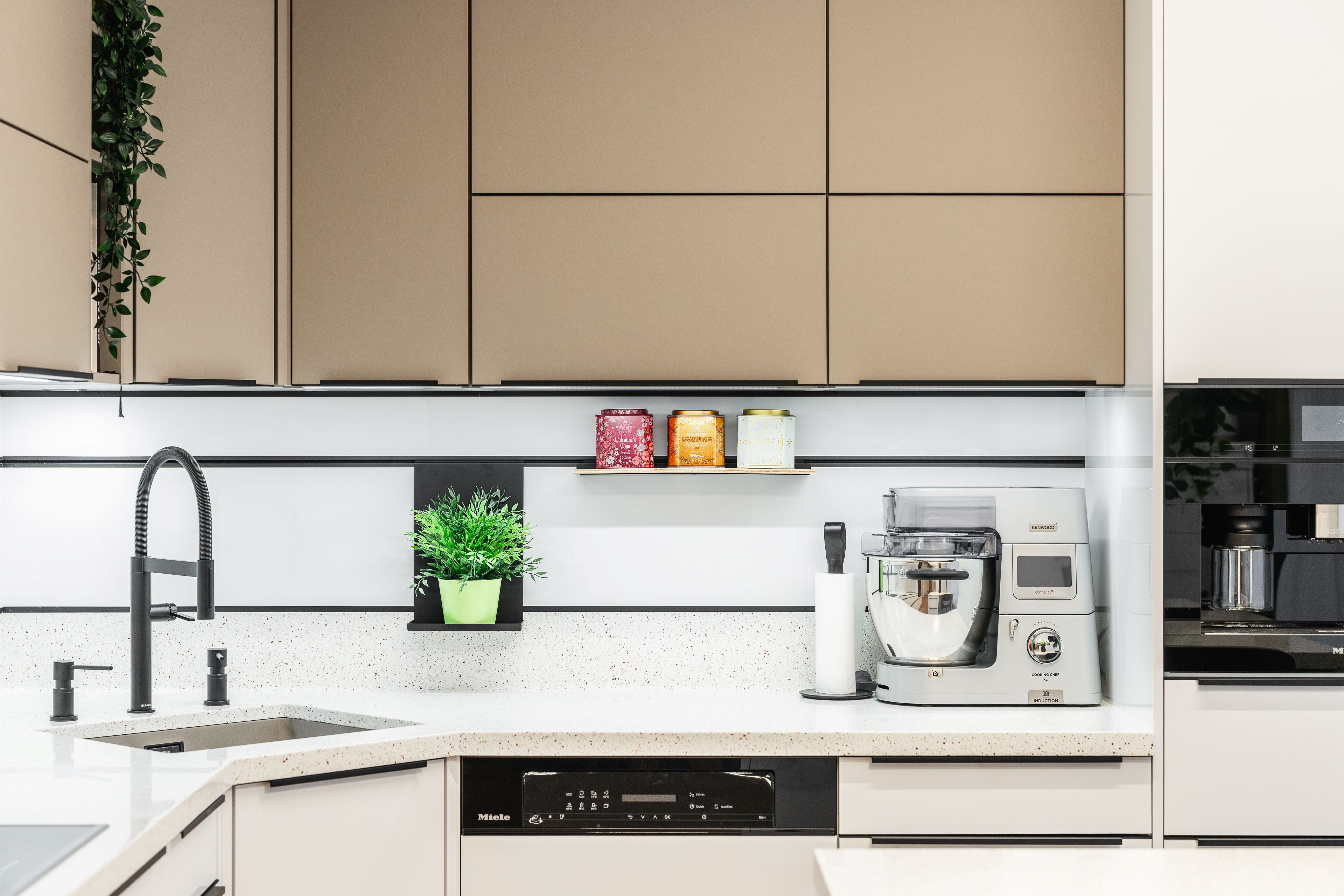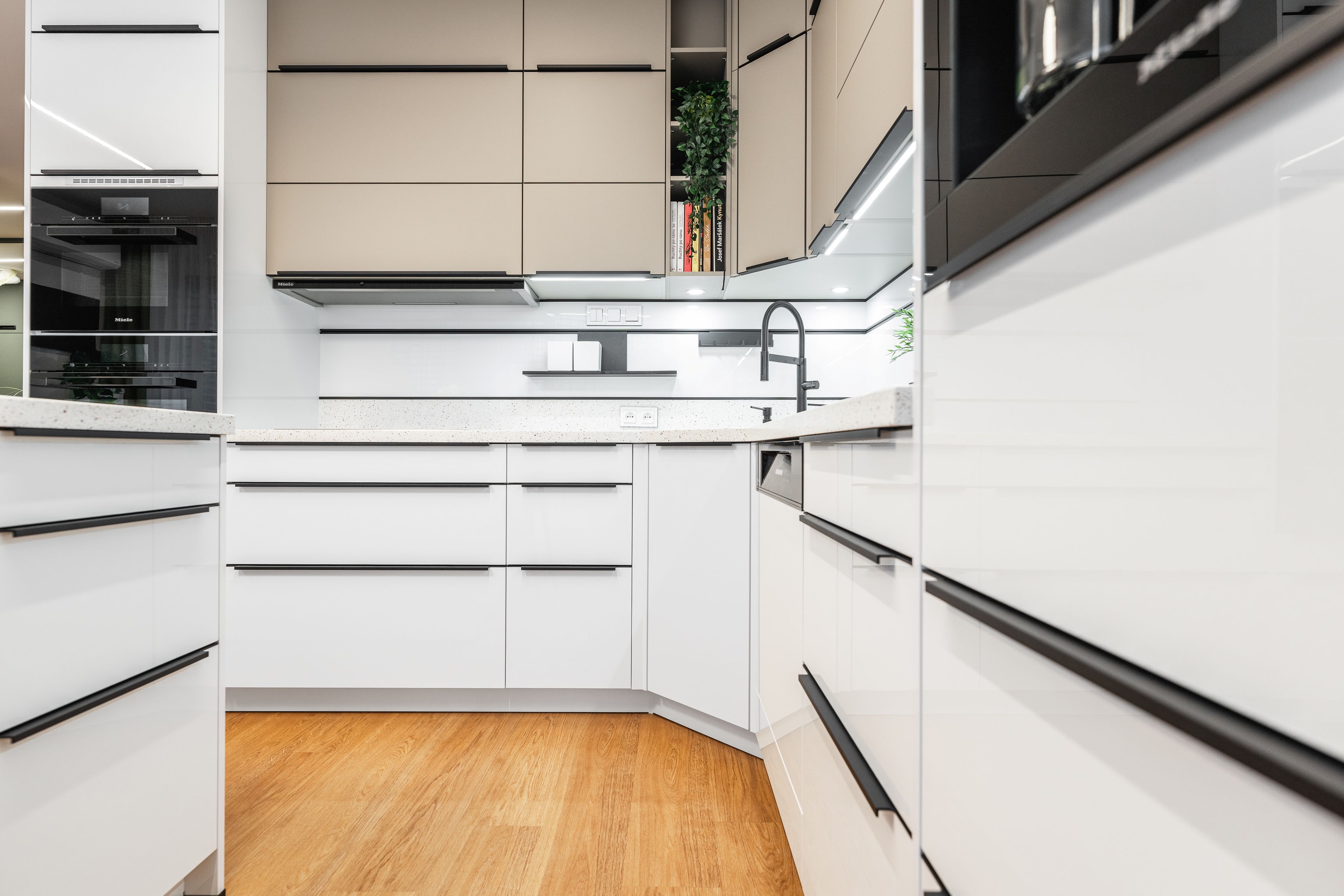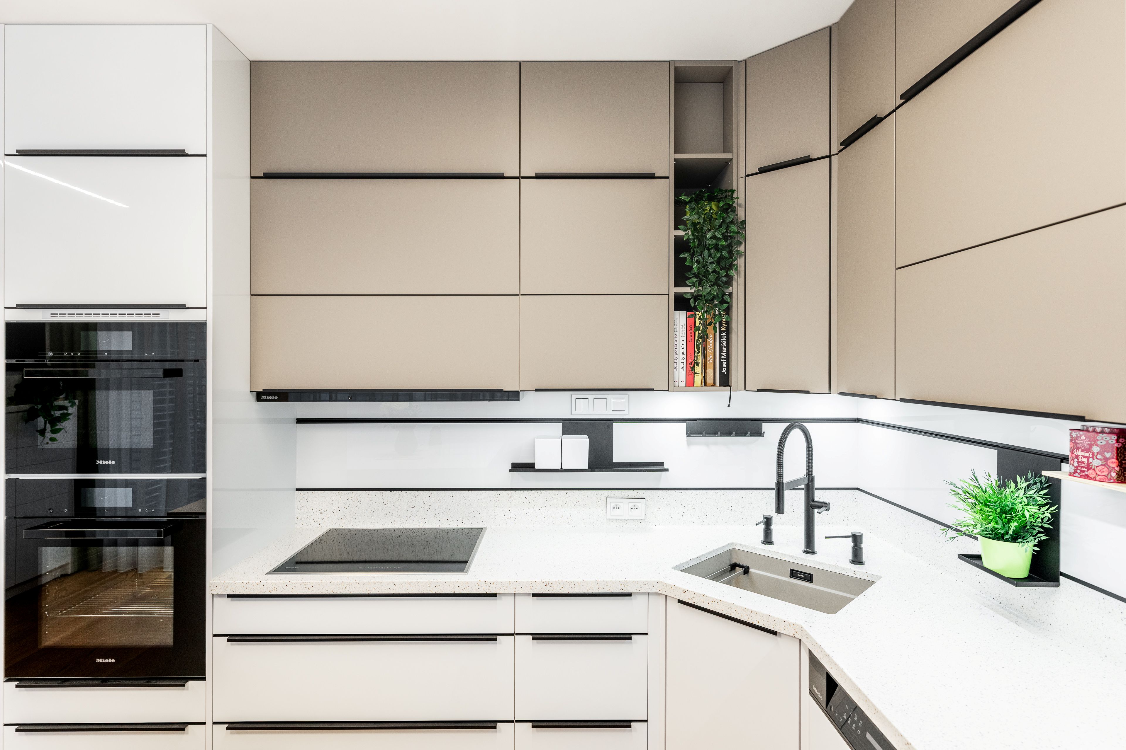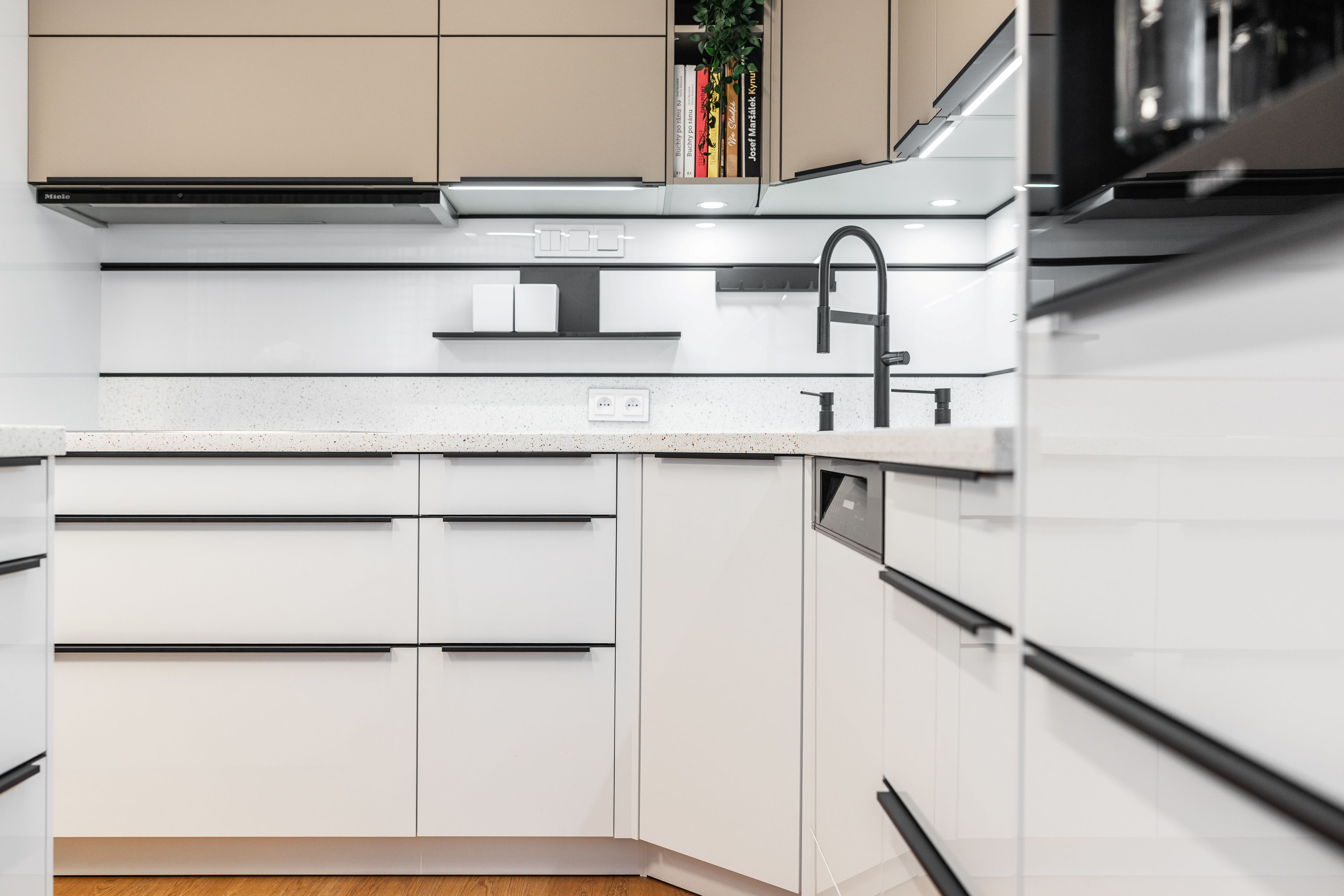 Byla kombinací bílého lakovaného laminátu ve vysokém lesku a UV lakovaného čela v matné povrchové úpravě AFP v odstínu kašmírová.