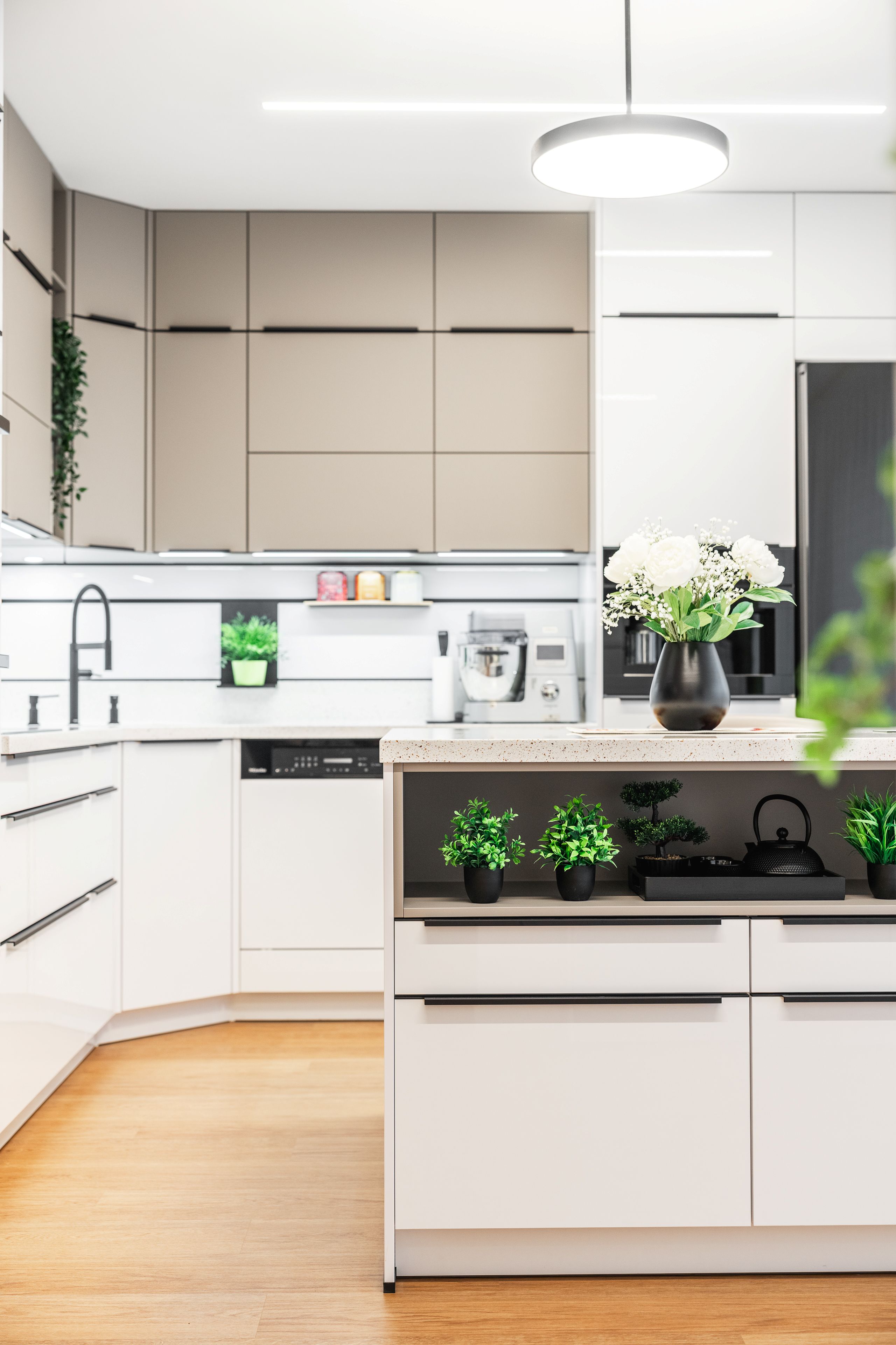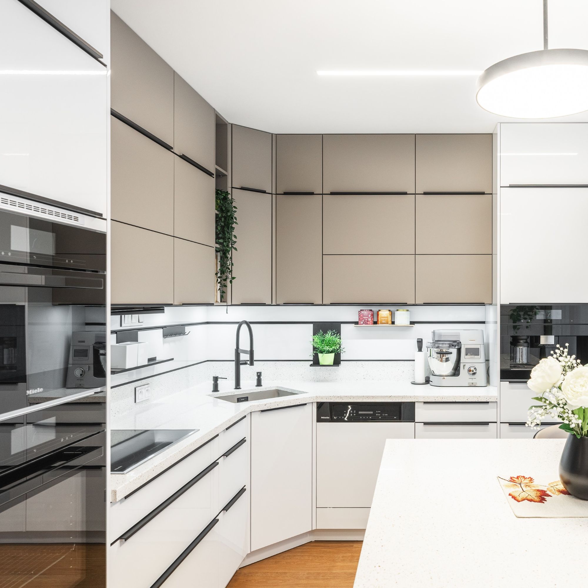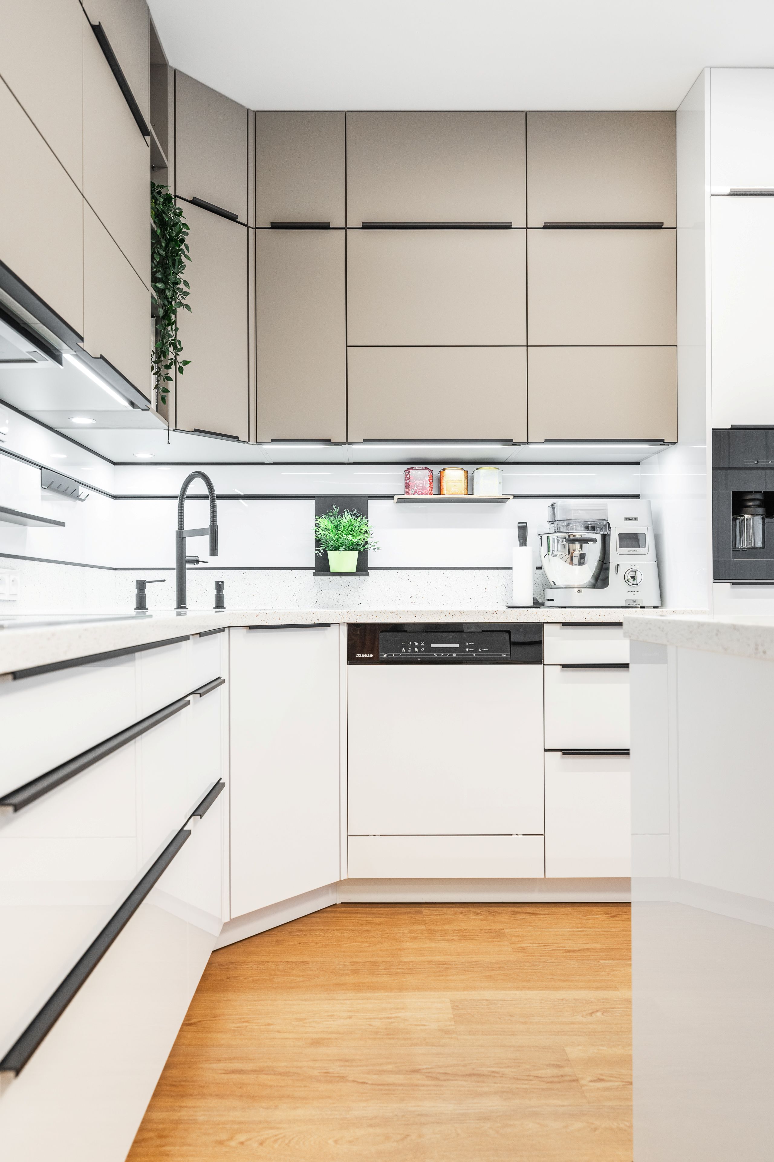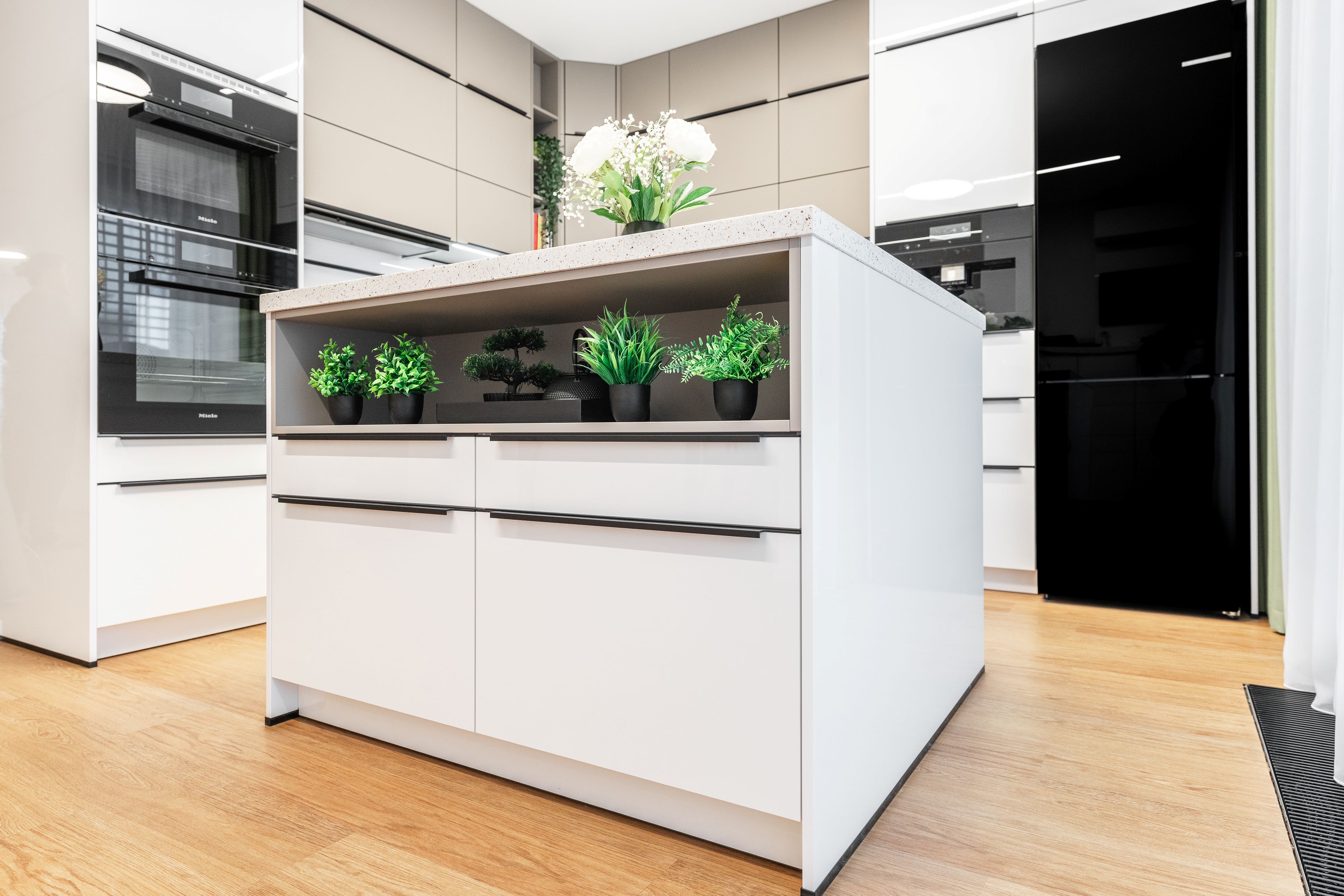 Byla kombinací bílého lakovaného laminátu ve vysokém lesku a UV lakovaného čela v matné povrchové úpravě AFP v odstínu kašmírová.