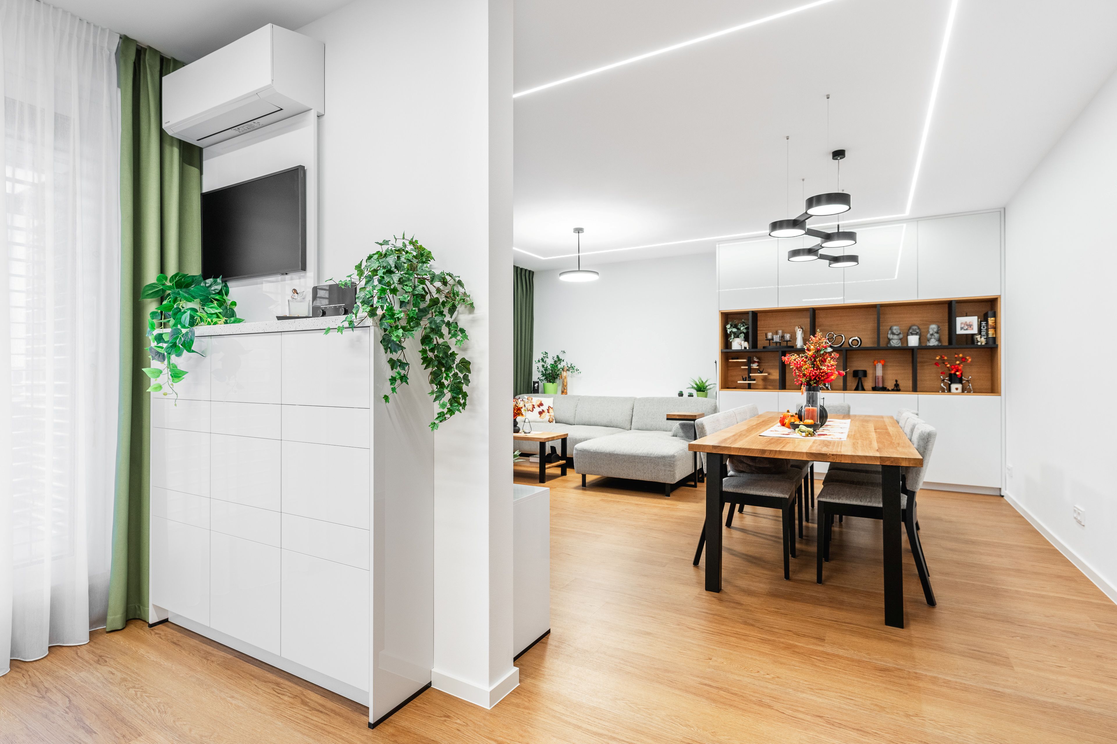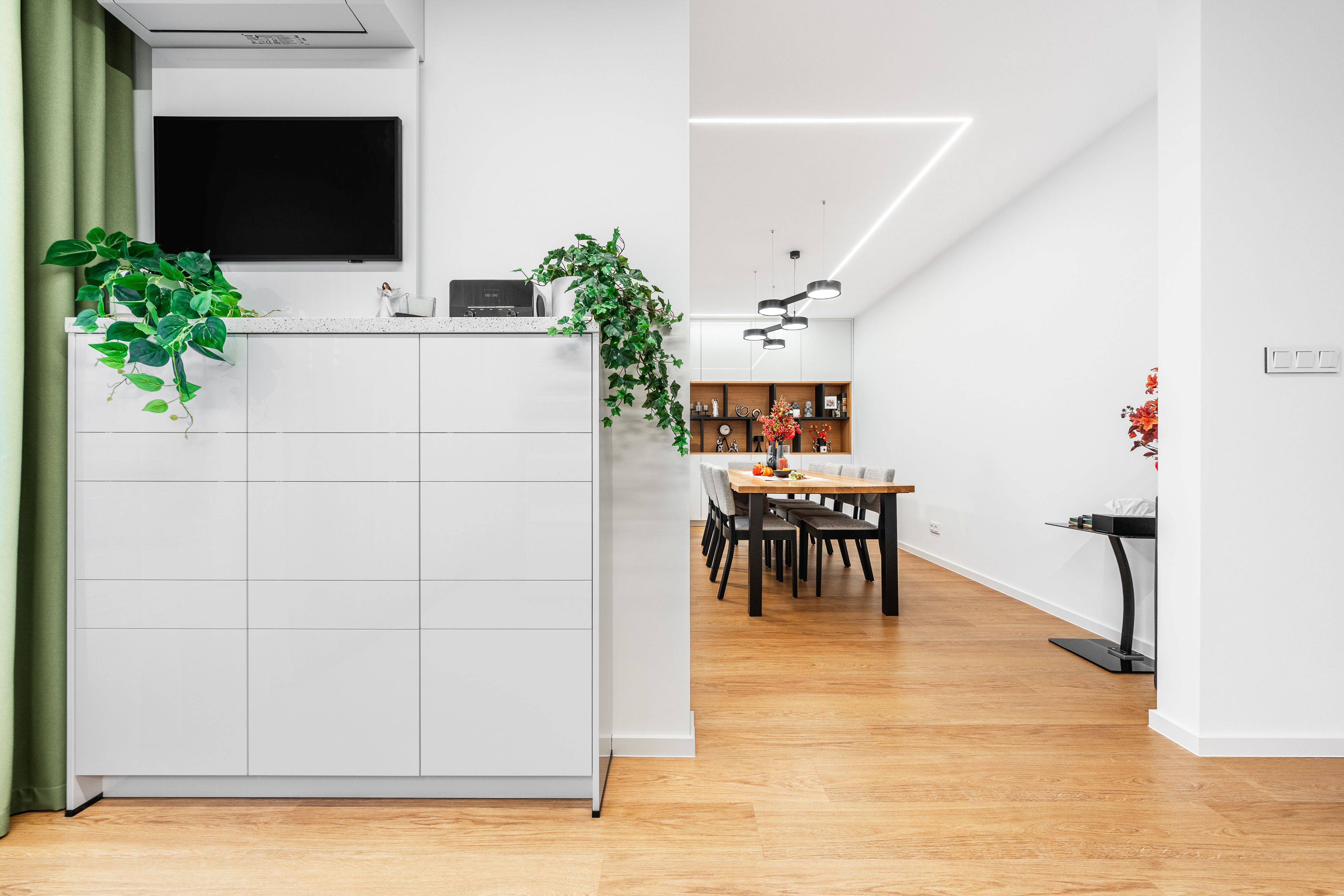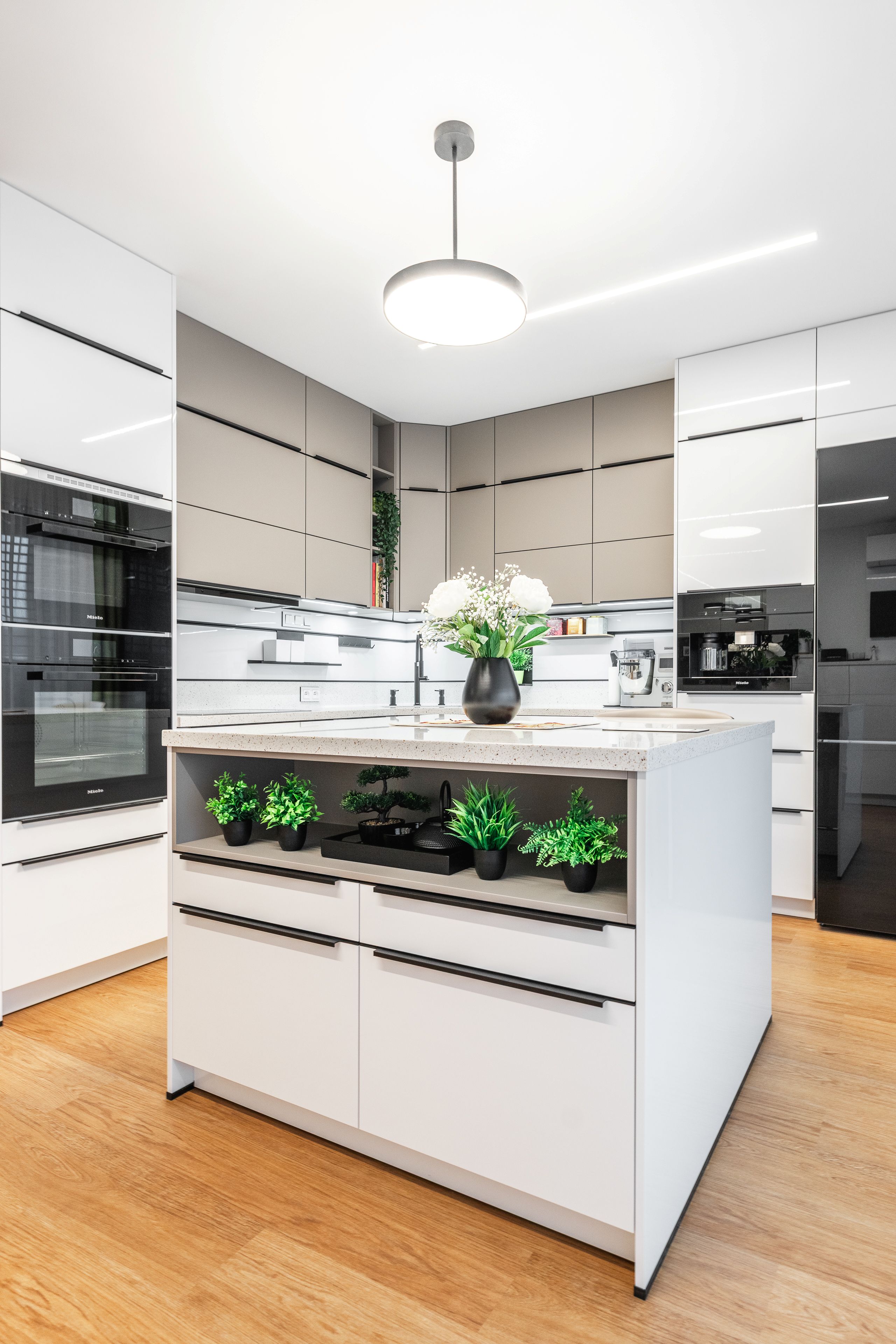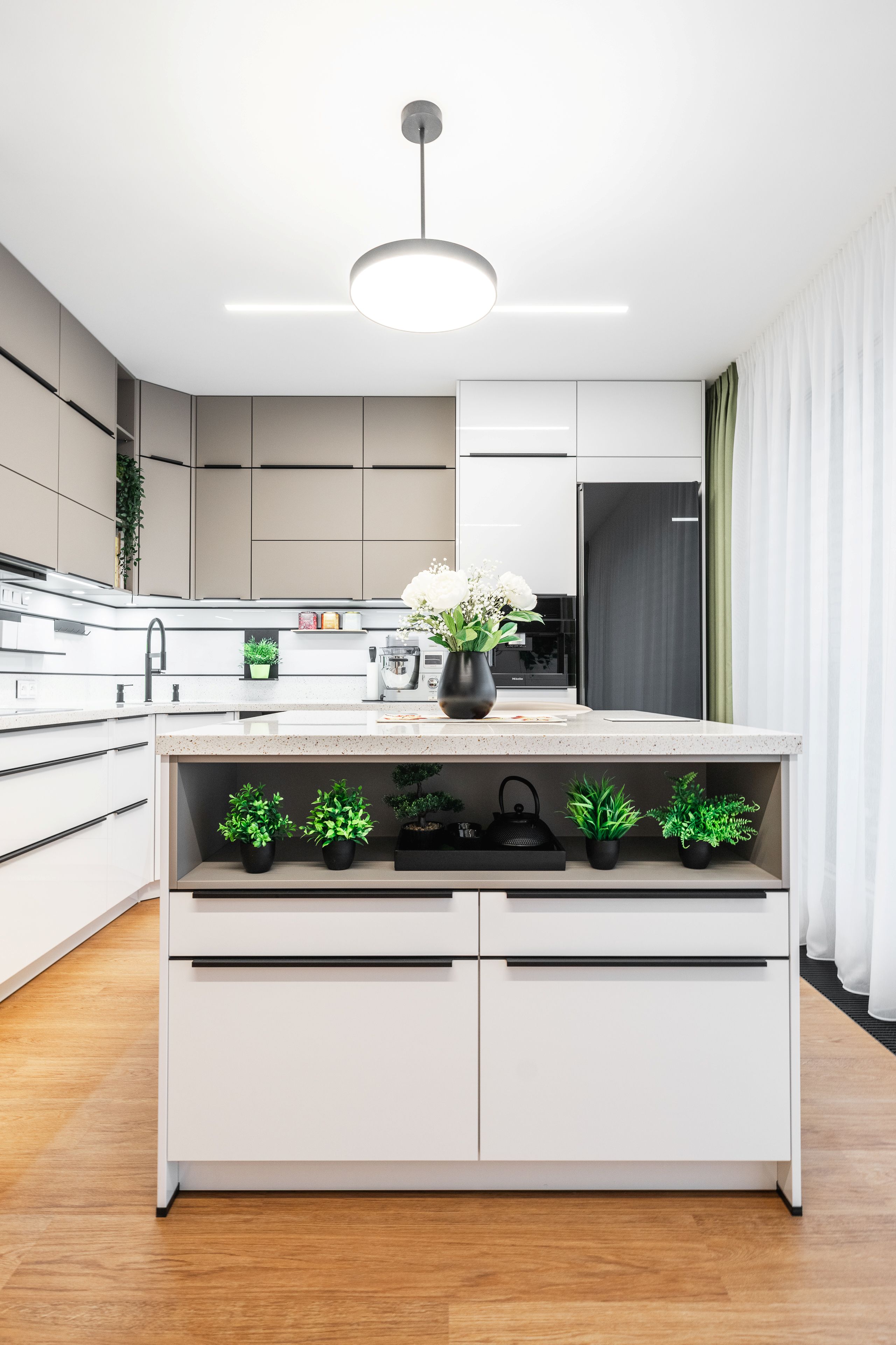 Byla kombinací bílého lakovaného laminátu ve vysokém lesku a UV lakovaného čela v matné povrchové úpravě AFP v odstínu kašmírová.